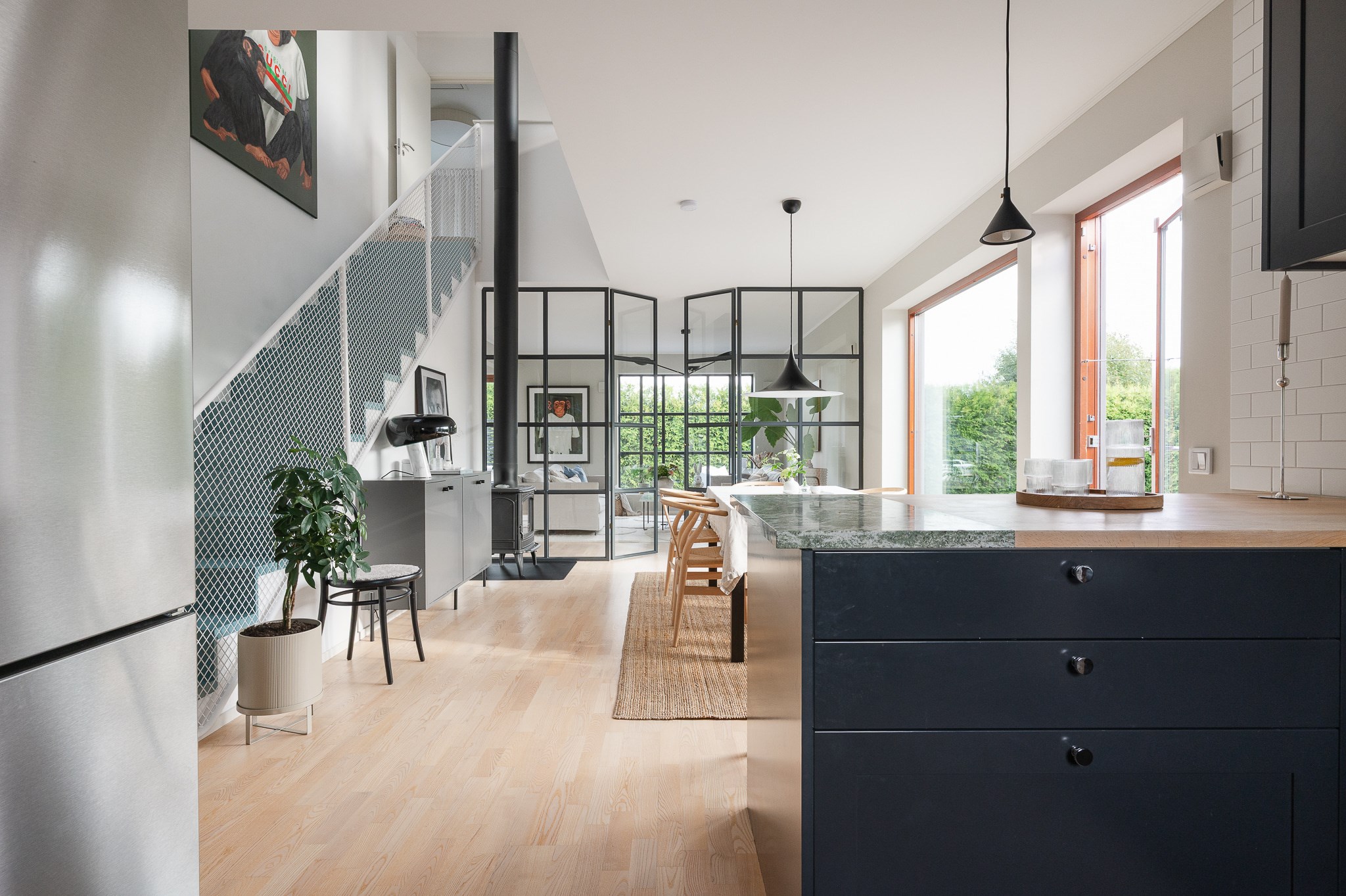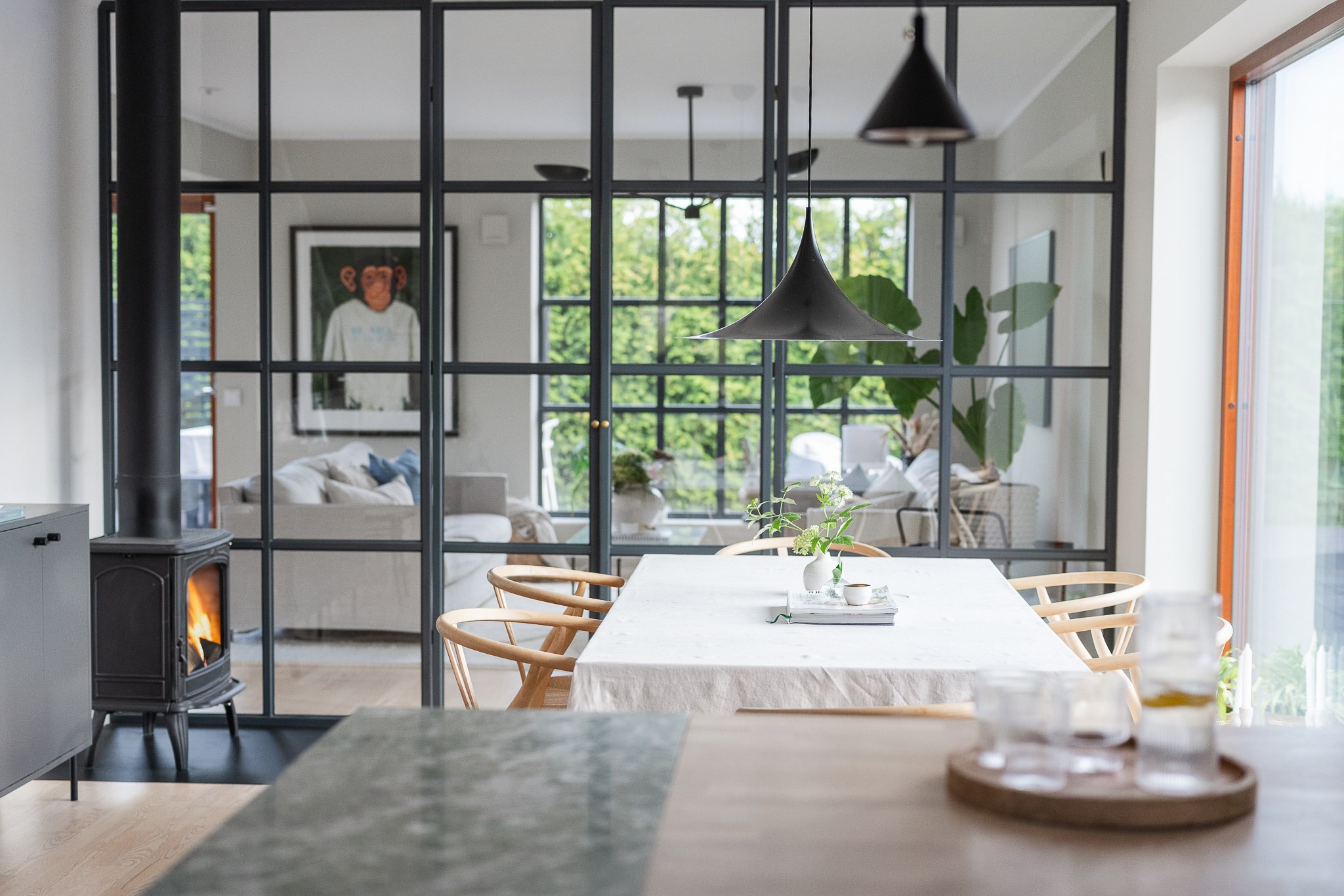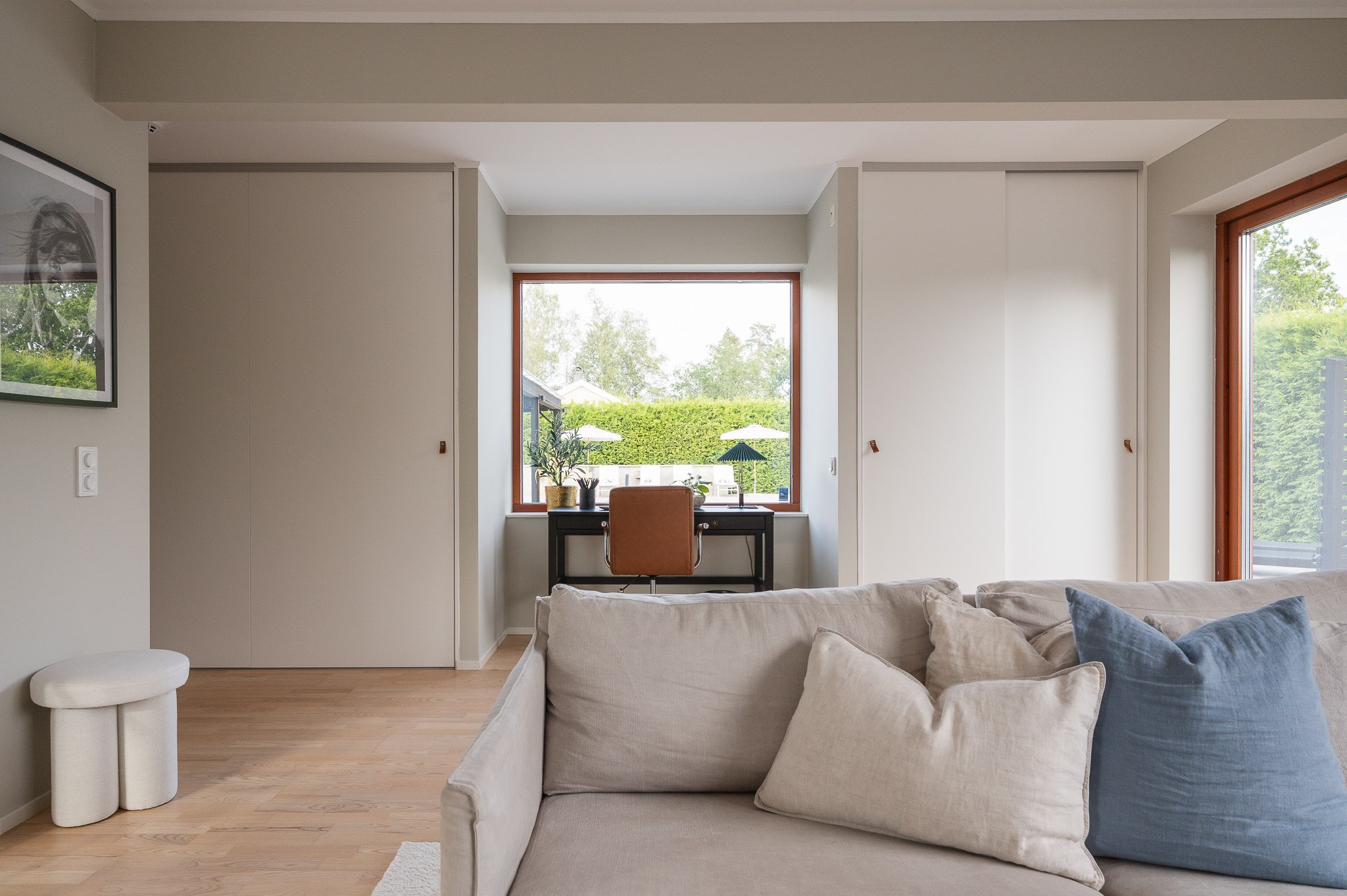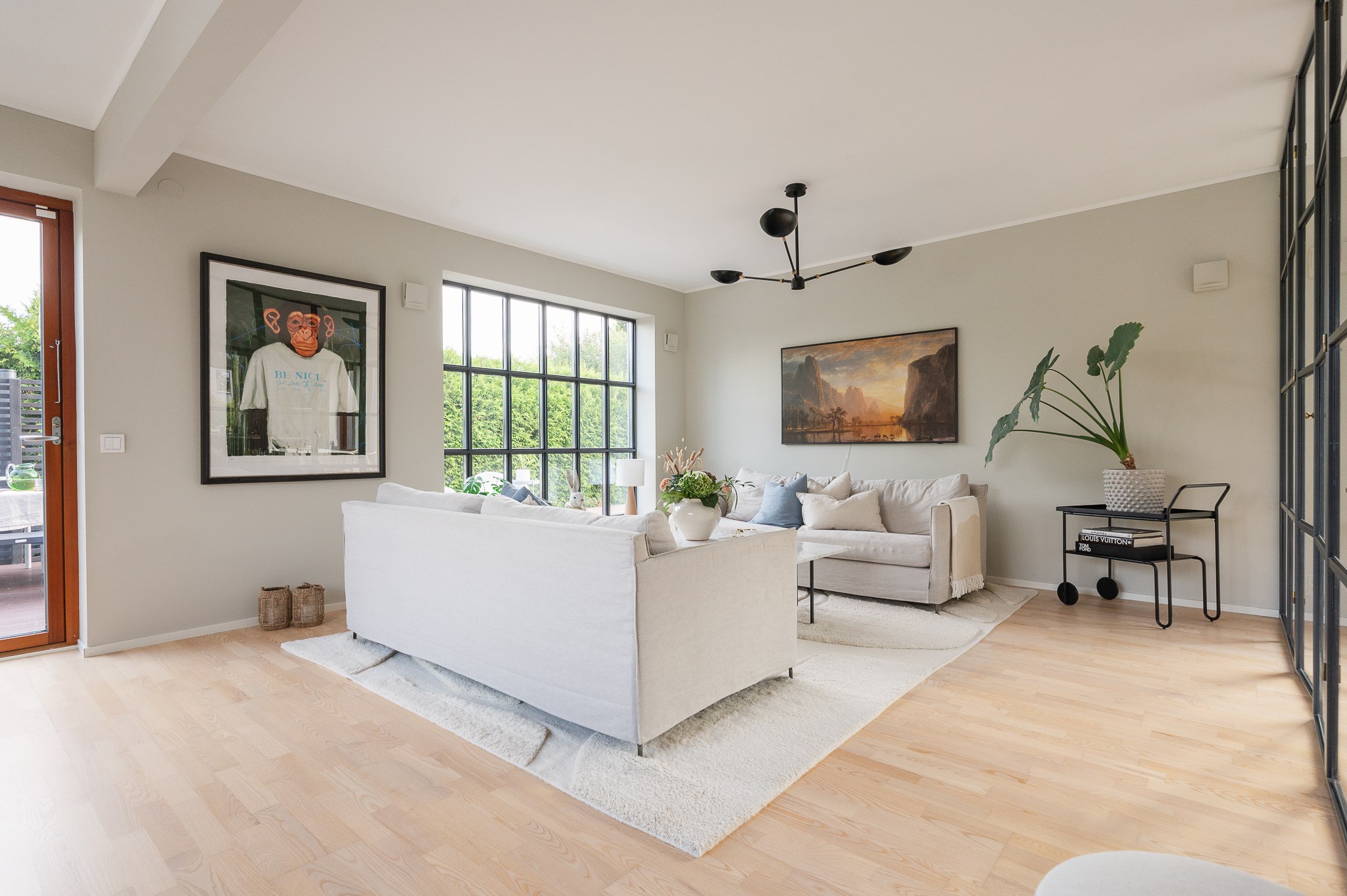 Vardagsrummet är ljust och luftigt med plats för större soffgrupp och umgänge. De stora fönsterpartierna tillsammans med den stilrena eldstaden ger rummet både karaktär och en ombonad känsla under årets kallare månader.