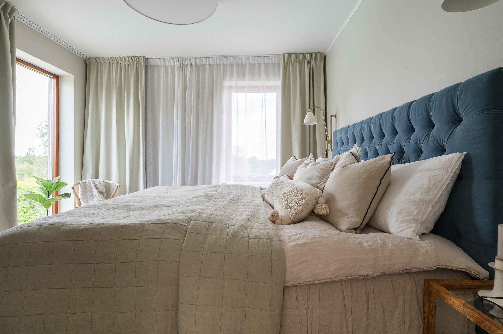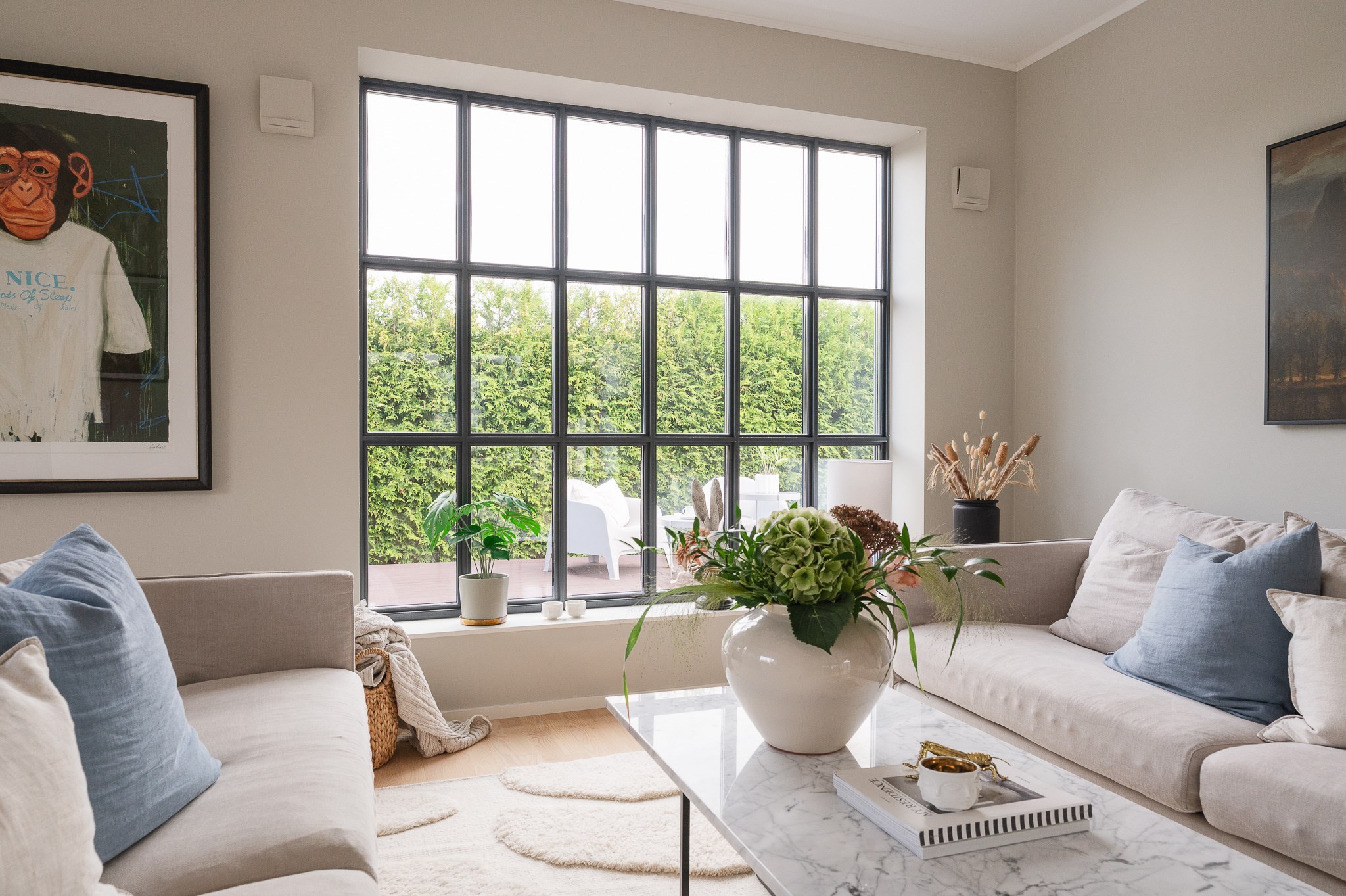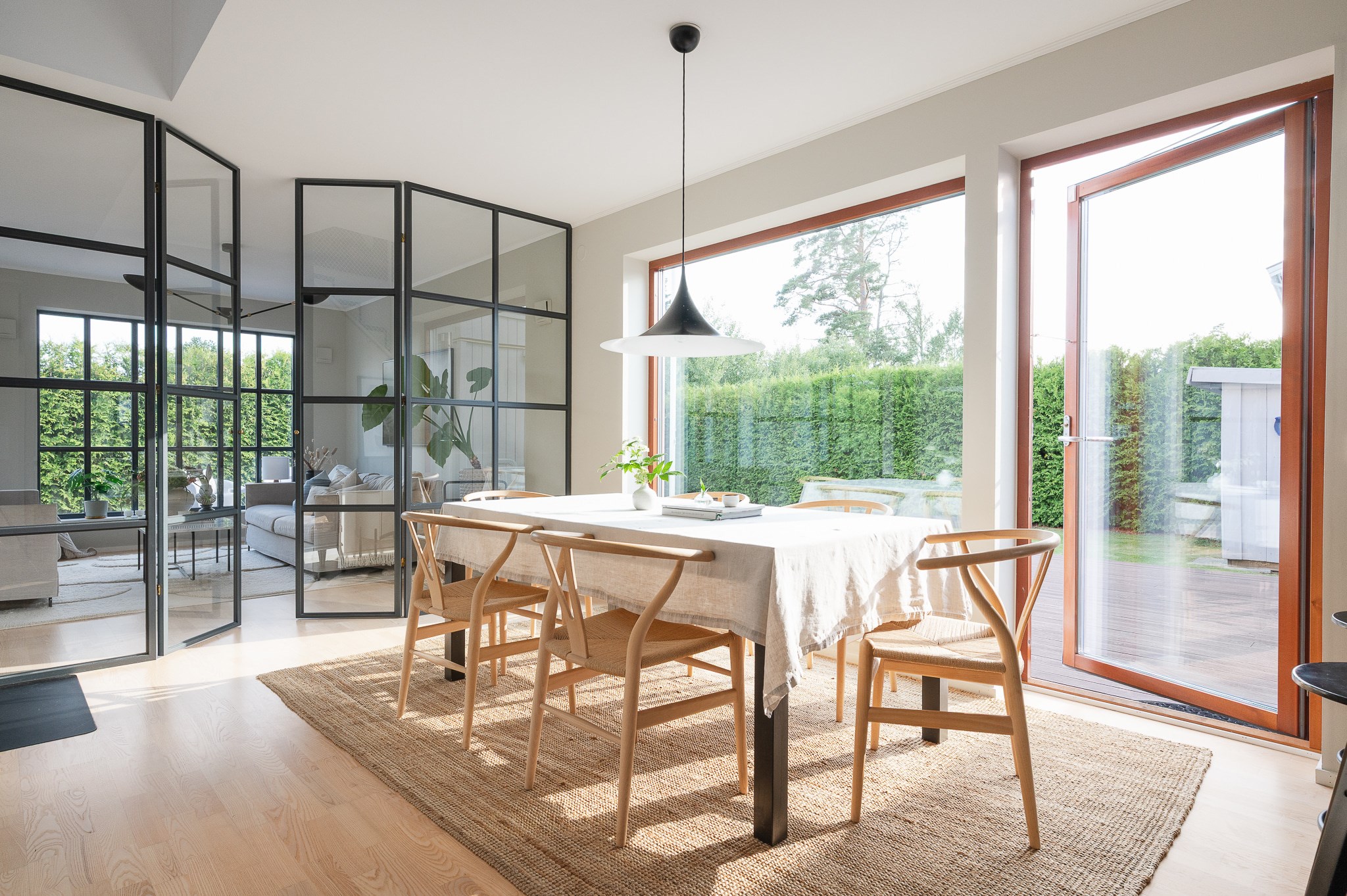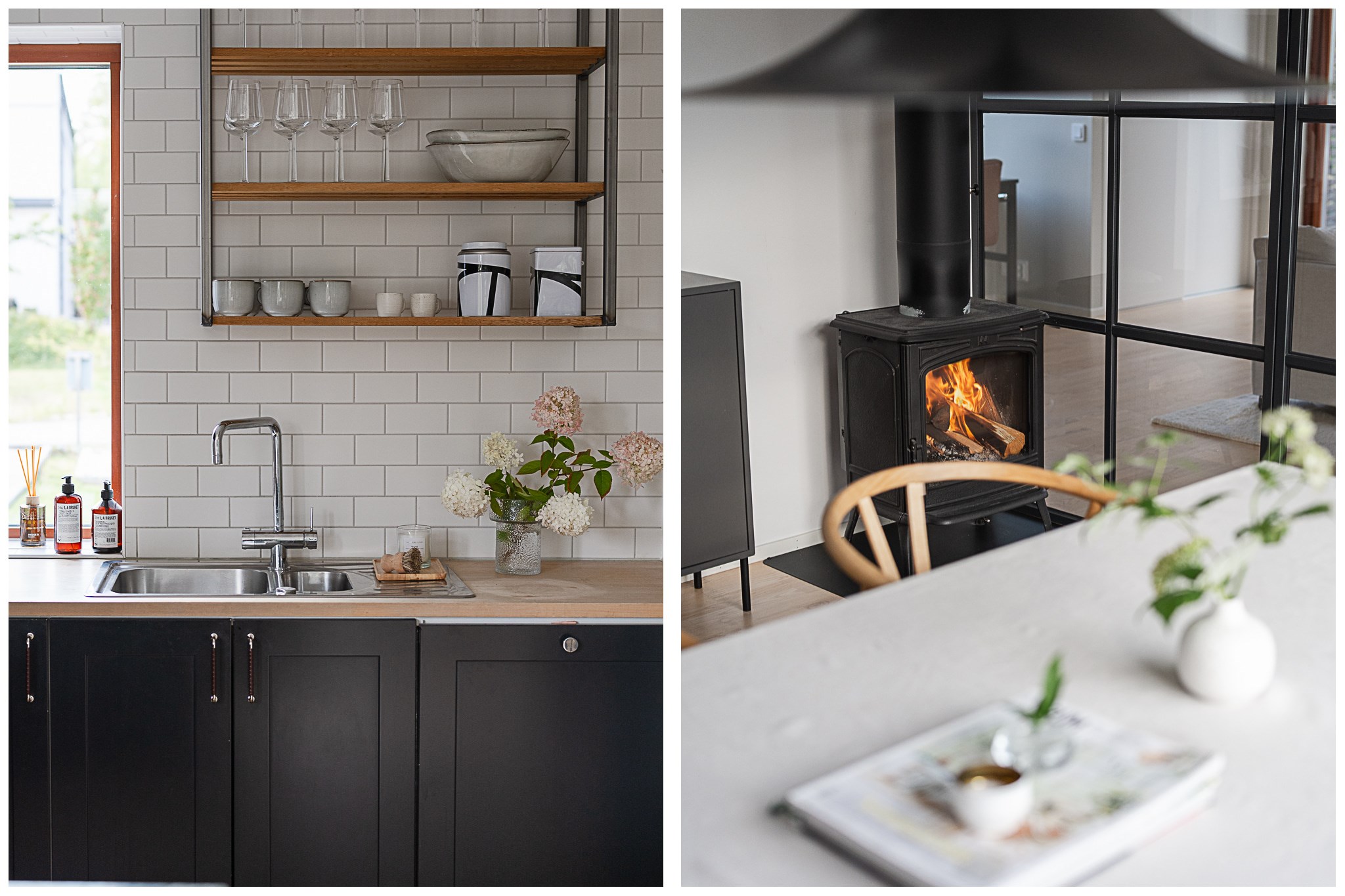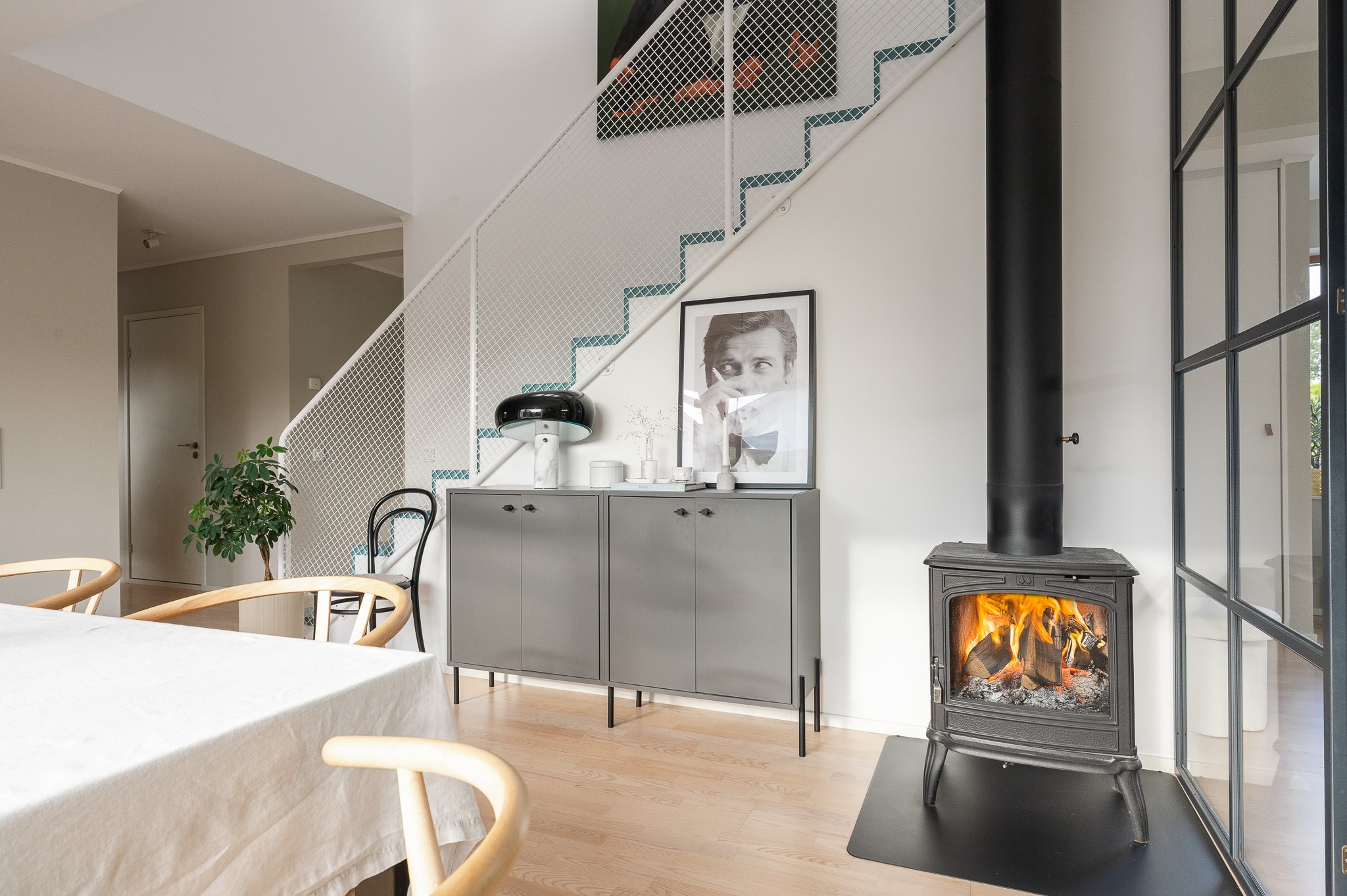 Vardagsrummet är ljust och luftigt med plats för större soffgrupp och umgänge. De stora fönsterpartierna tillsammans med den stilrena eldstaden ger rummet både karaktär och en ombonad känsla under årets kallare månader.