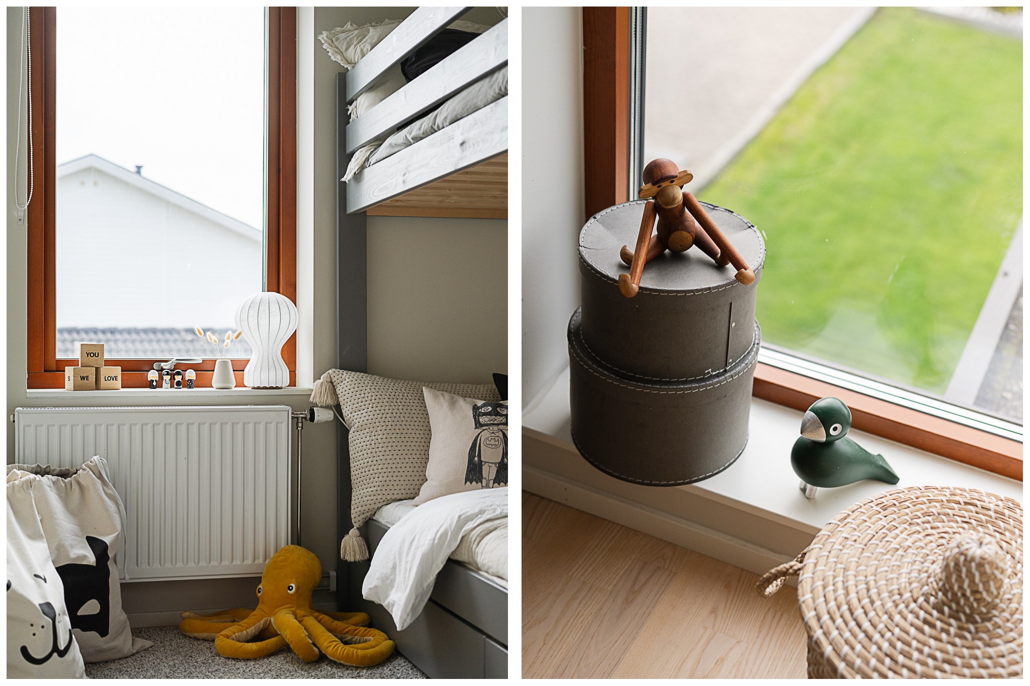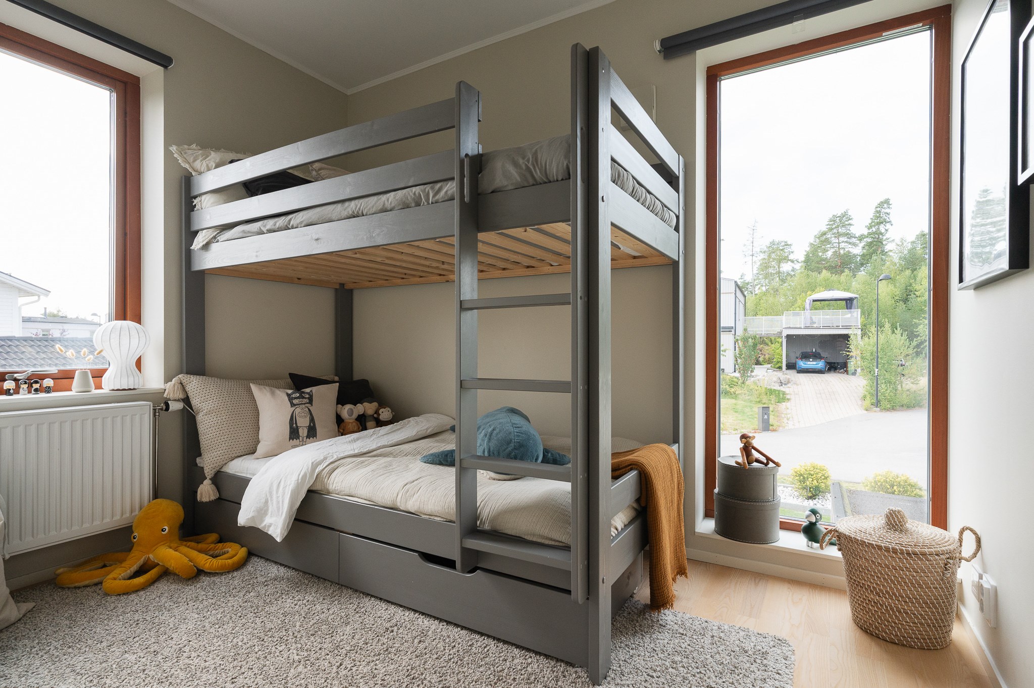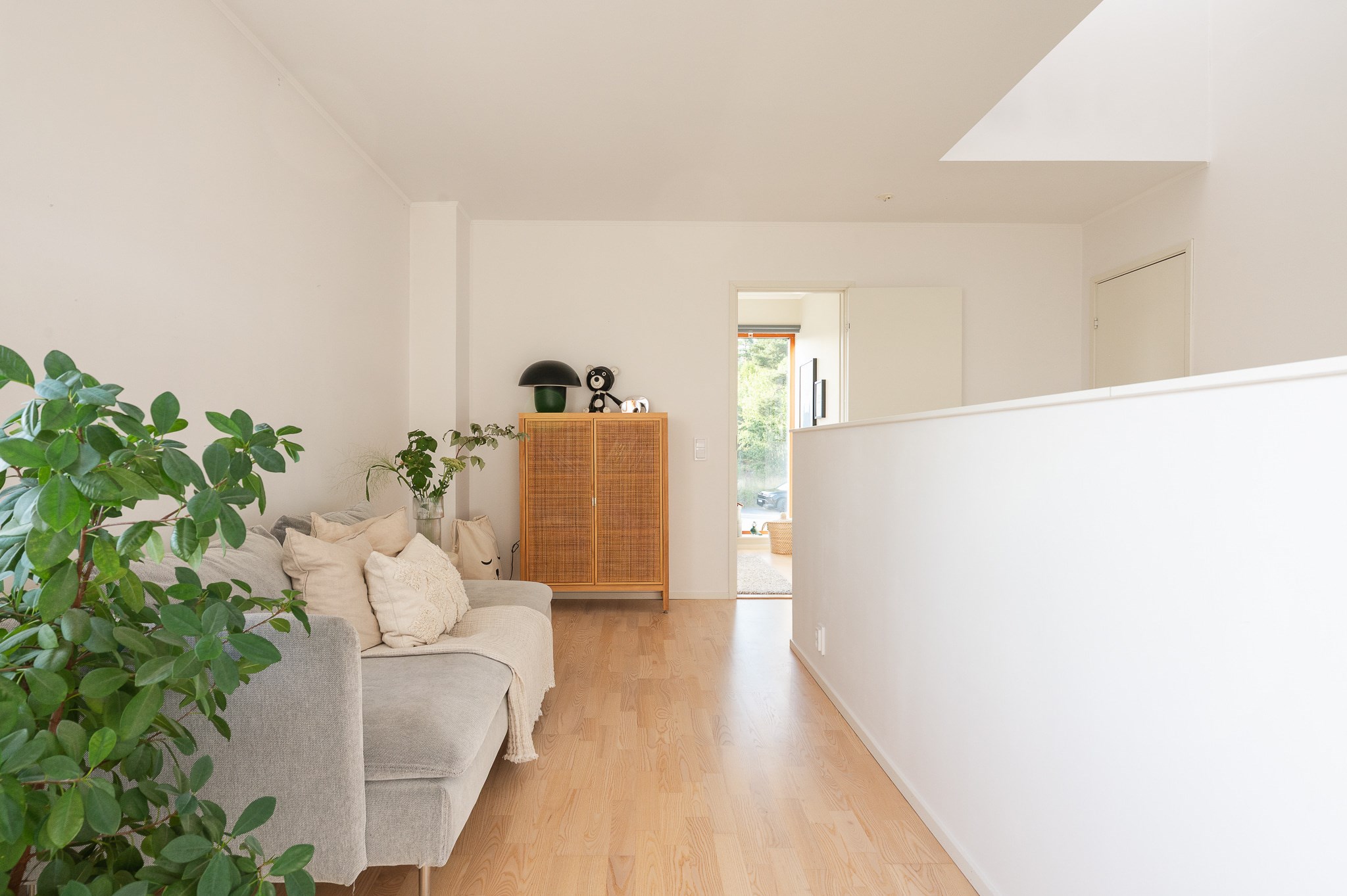 Övre plan rymmer bostadens mer privata delar. Här finns tre väl tilltagna sovrum med lugnt läge och fina ljusinsläpp. Förvaringen är genomtänkt med klädkammare till samtliga rum. Ett allrum fungerar utmärkt som TV-rum, lekrum eller extra vardagsrum för familjen.