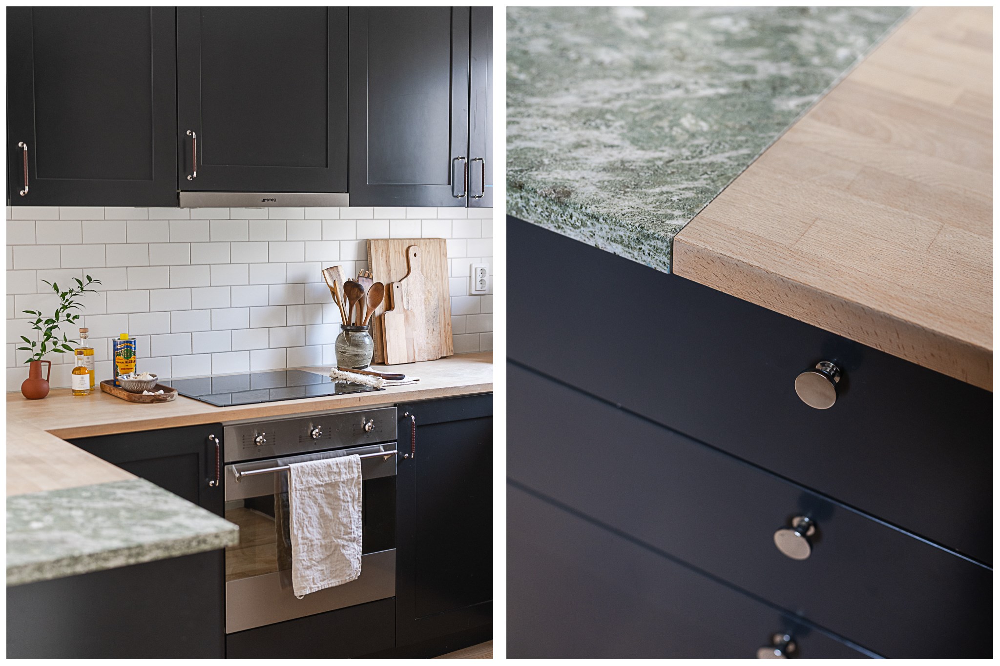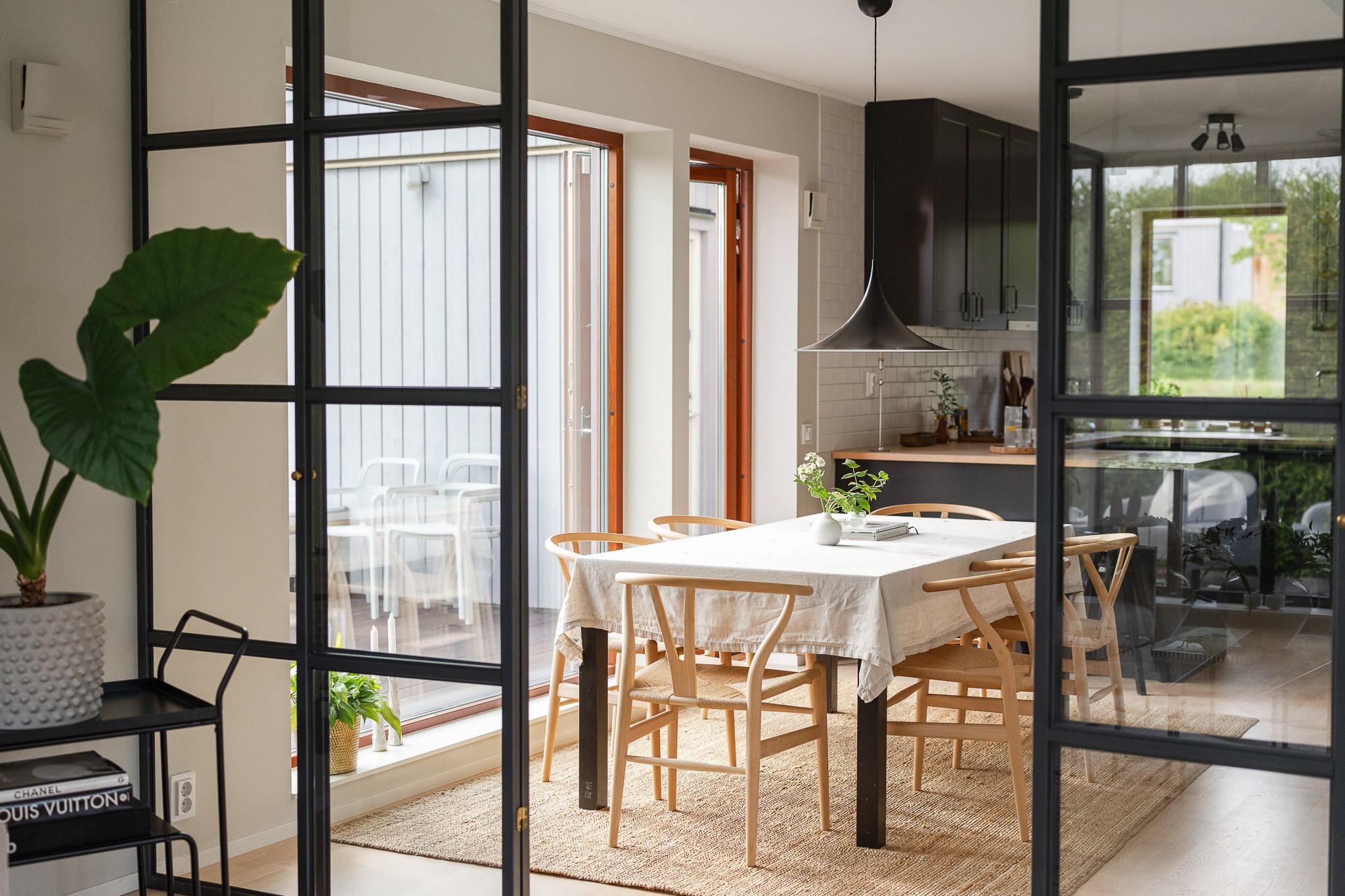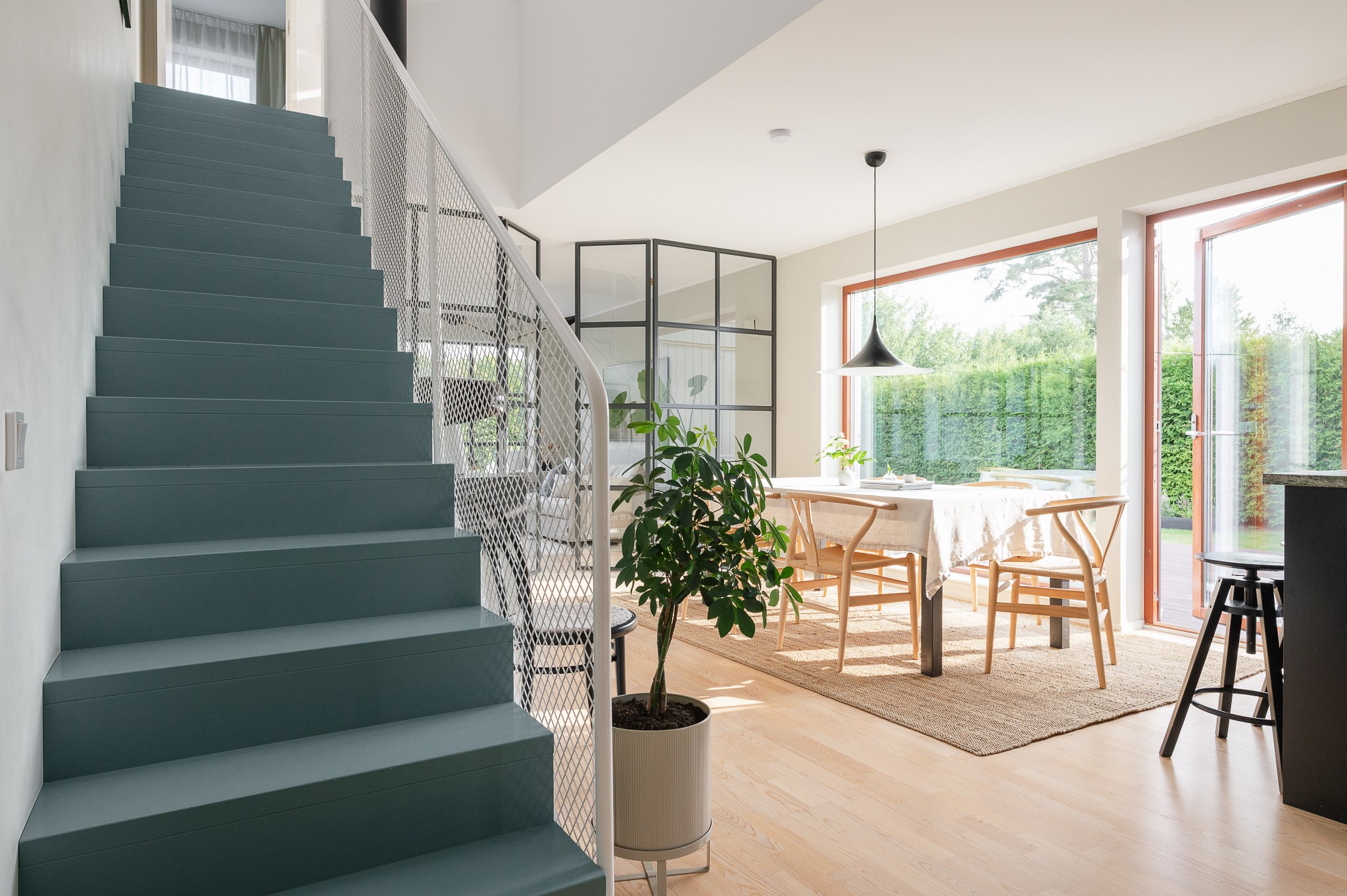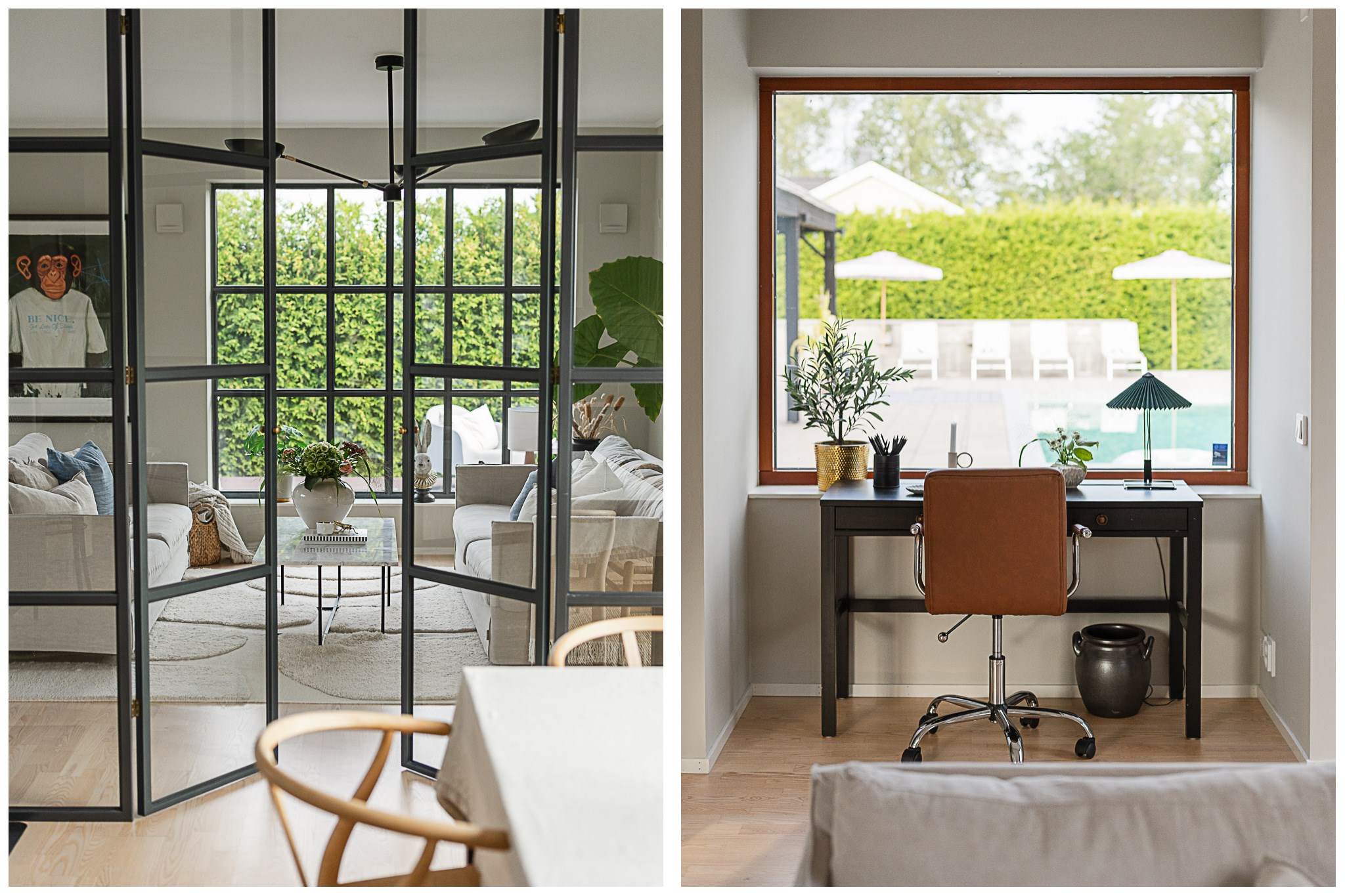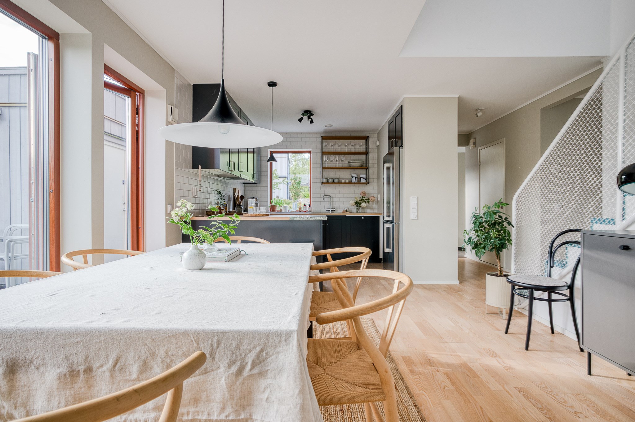 Köket är modernt och funktionellt utformat med mörka snickerier, öppna hyllplan och generösa arbetsytor. Den öppna planlösningen mot matplatsen skapar en social och inbjudande yta där kök och matsal samverkar på ett naturligt sätt. Både från matplatsen och vardagsrummet nås uteplatsen och poolområdet. Stora glaspartier ger ett fantastiskt ljusinsläpp och skapar en stark koppling mellan inne och ute.