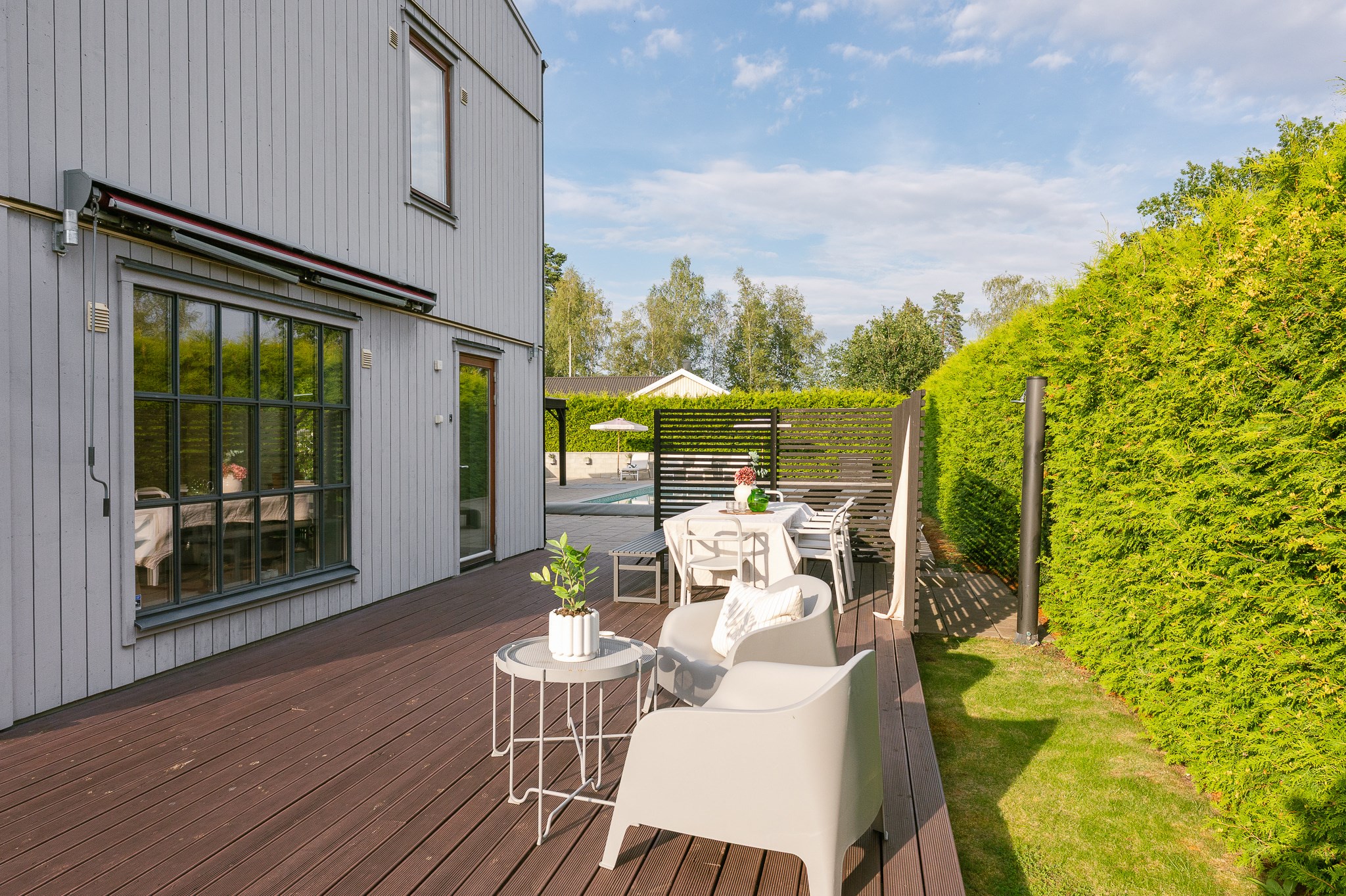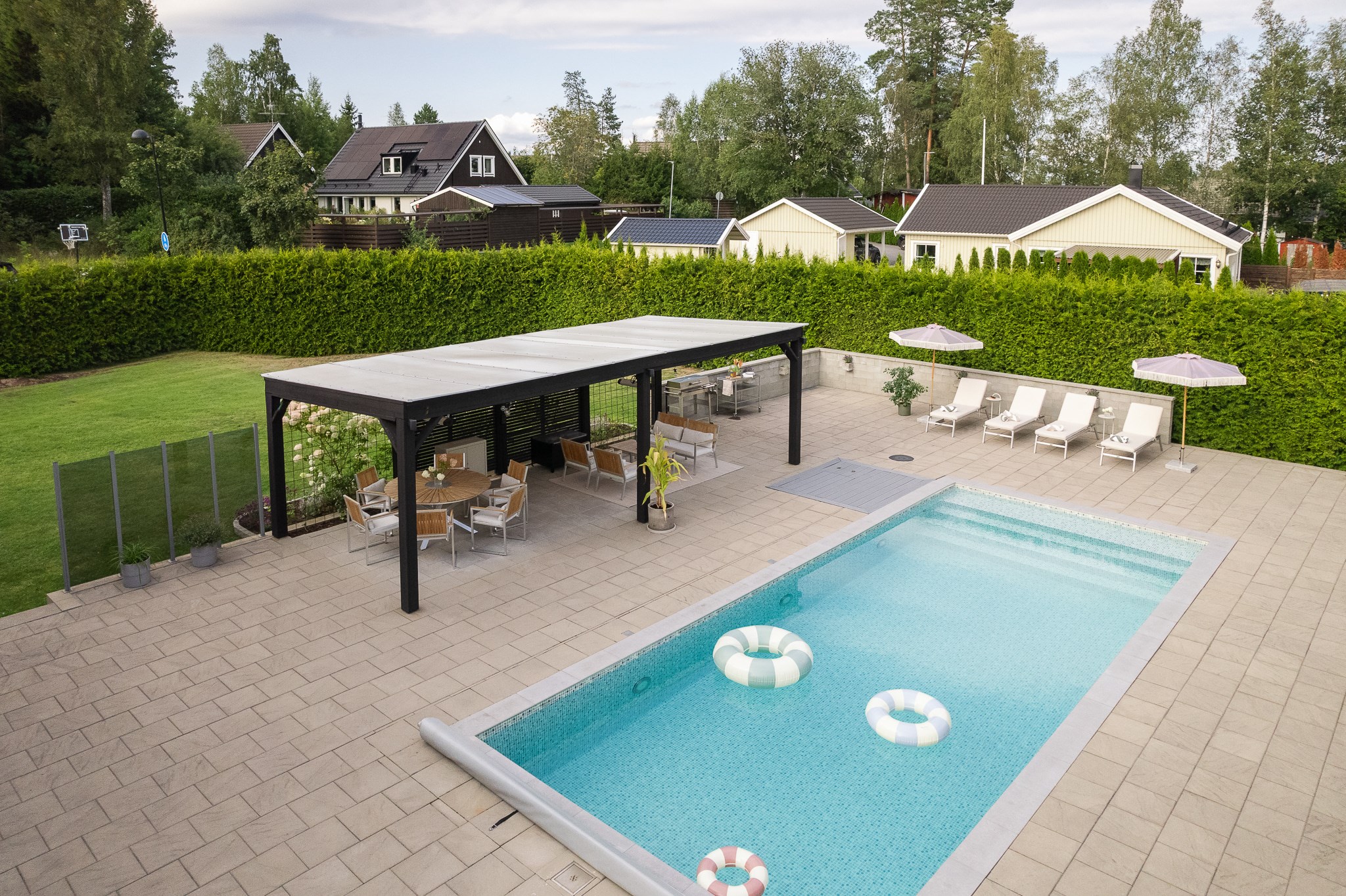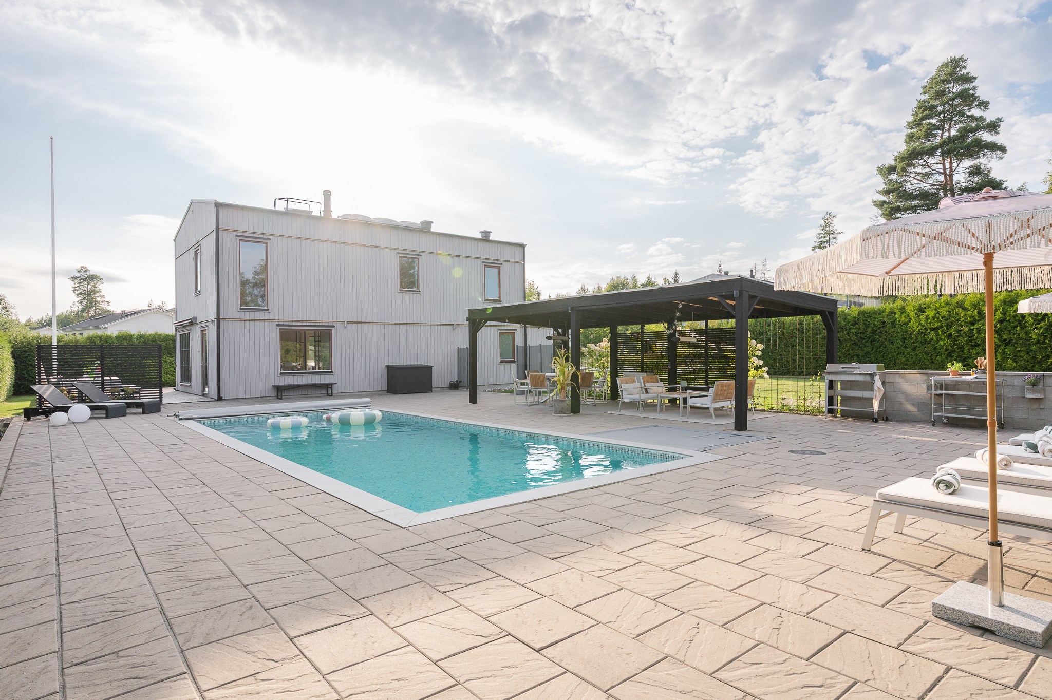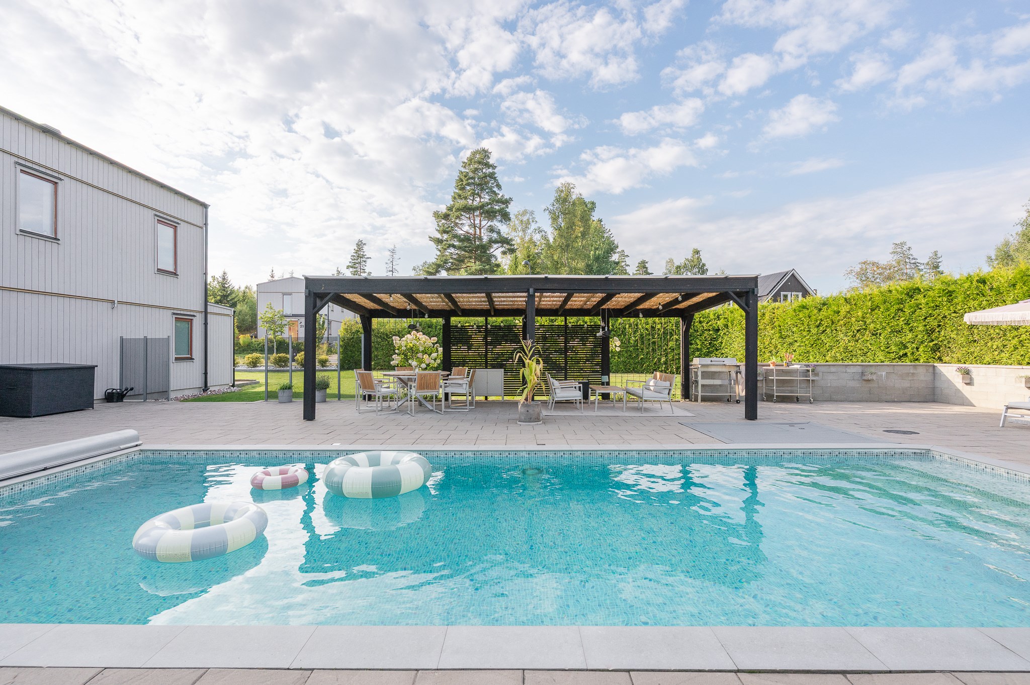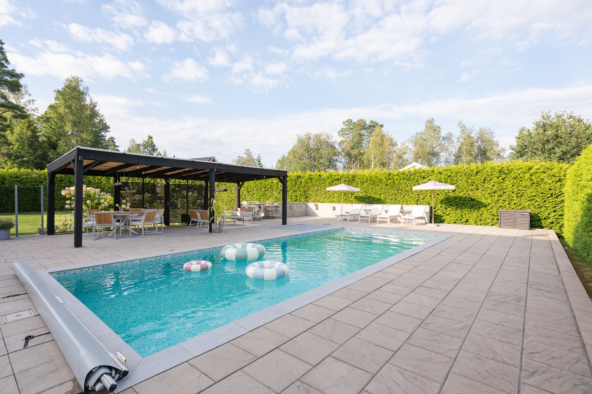 Den insynsskyddade tomten är smakfullt anlagd med stora stenlagda ytor, gräsmatta och ett generöst poolområde som blir en naturlig samlingspunkt under sommarhalvåret. Den pergolaförsedda uteplatsen erbjuder gott om plats för både matgrupp och loungemöbler – perfekt för långa middagar, poolhäng och sociala tillställningar.