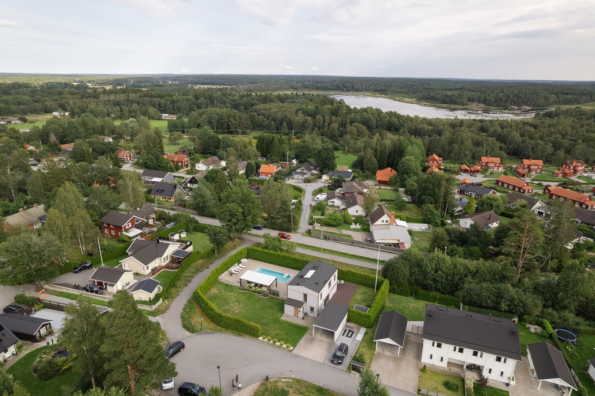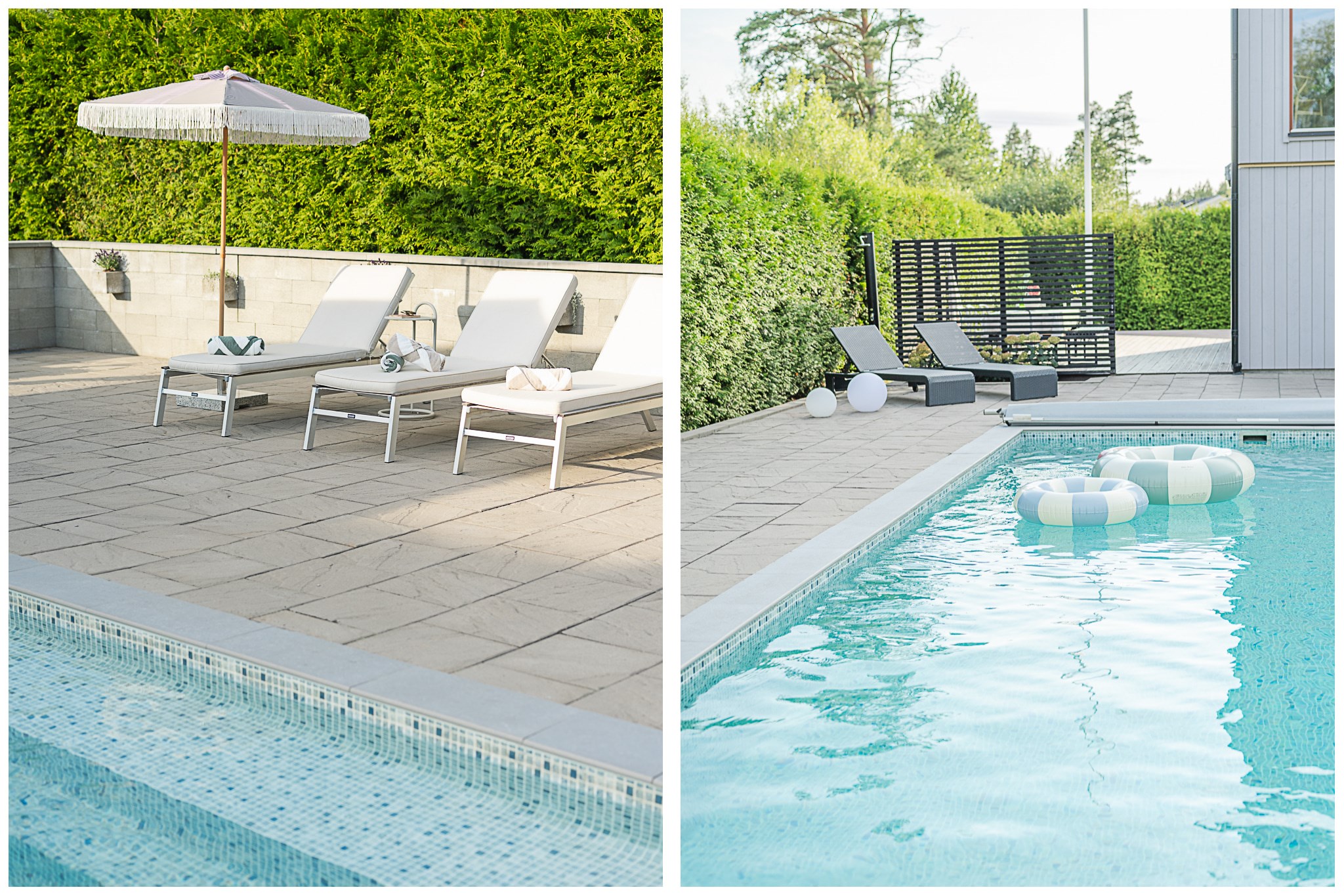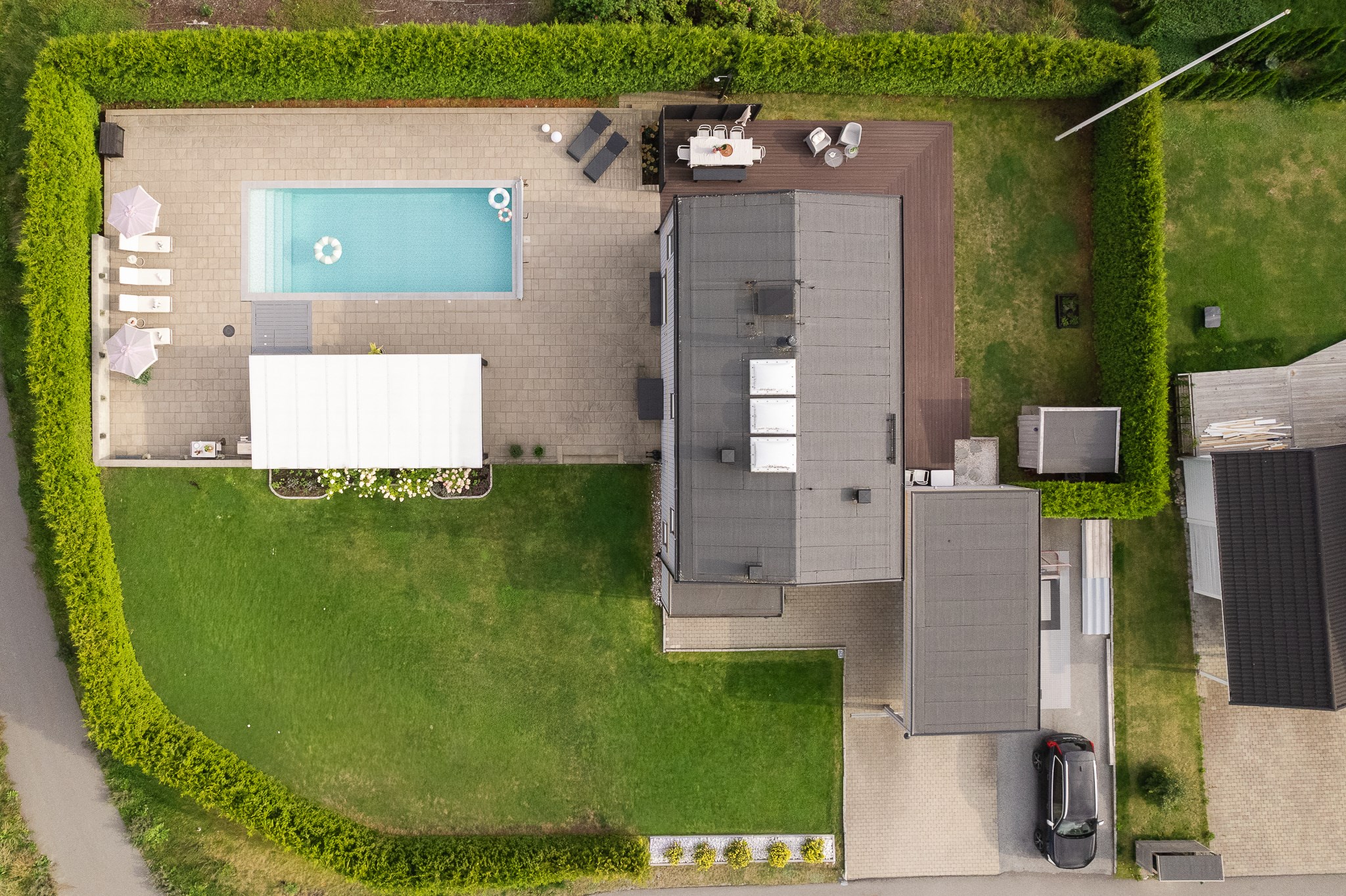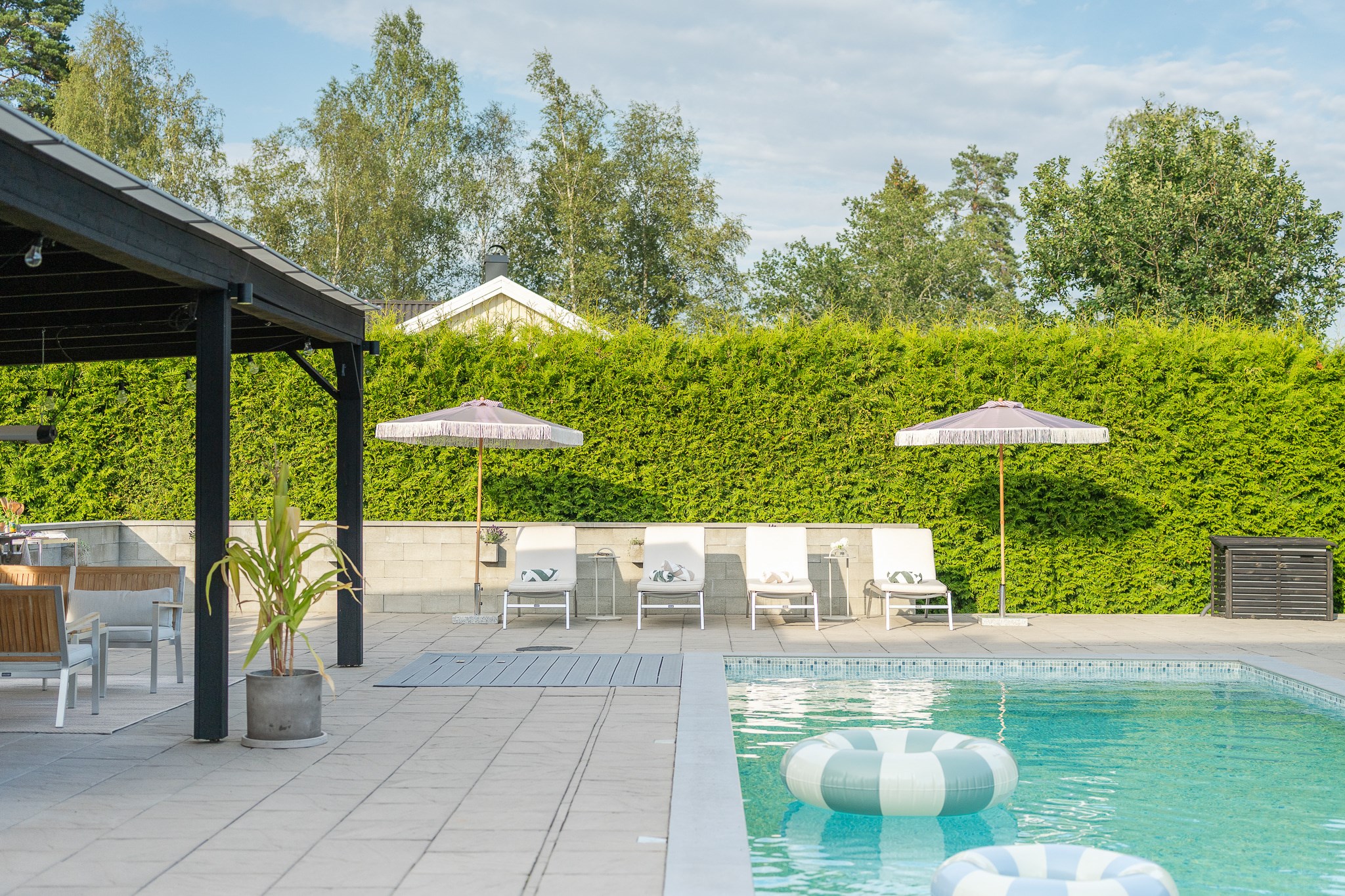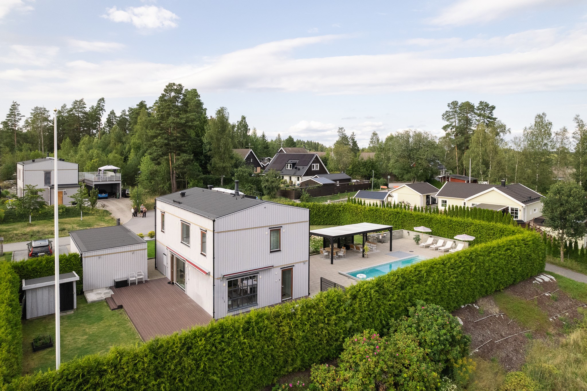 Den insynsskyddade tomten är smakfullt anlagd med stora stenlagda ytor, gräsmatta och ett generöst poolområde som blir en naturlig samlingspunkt under sommarhalvåret. Den pergolaförsedda uteplatsen erbjuder gott om plats för både matgrupp och loungemöbler – perfekt för långa middagar, poolhäng och sociala tillställningar.