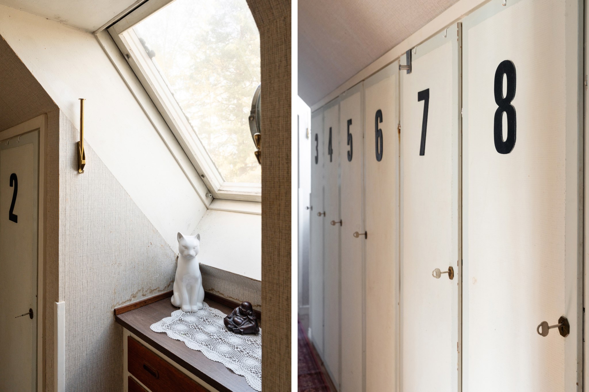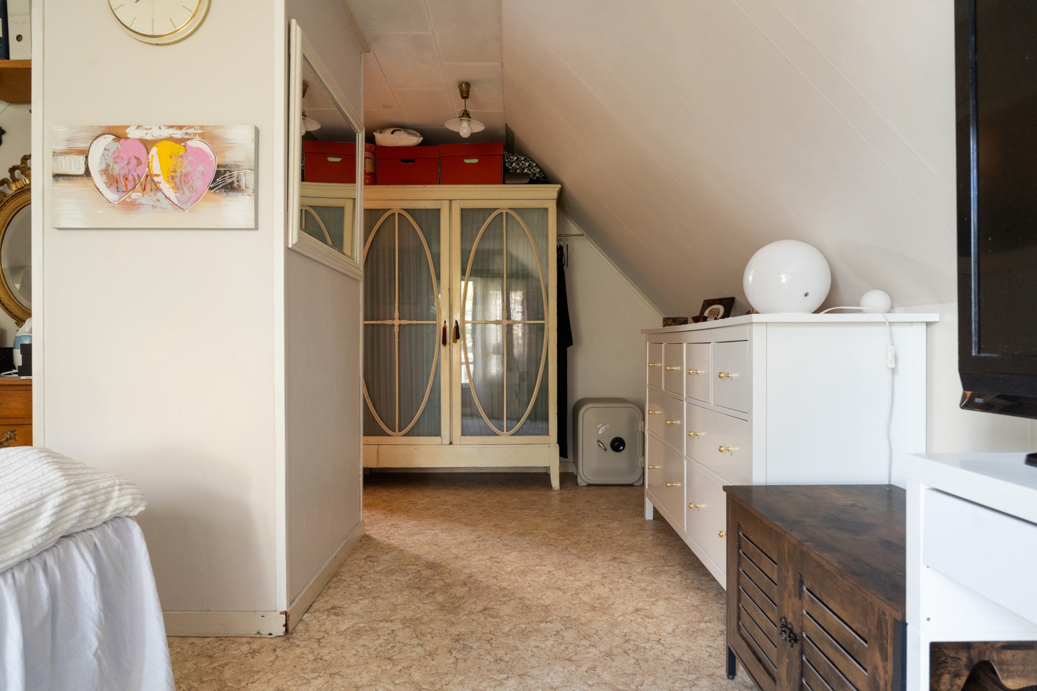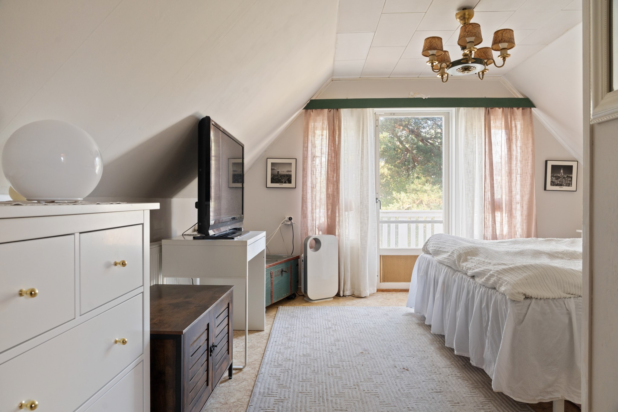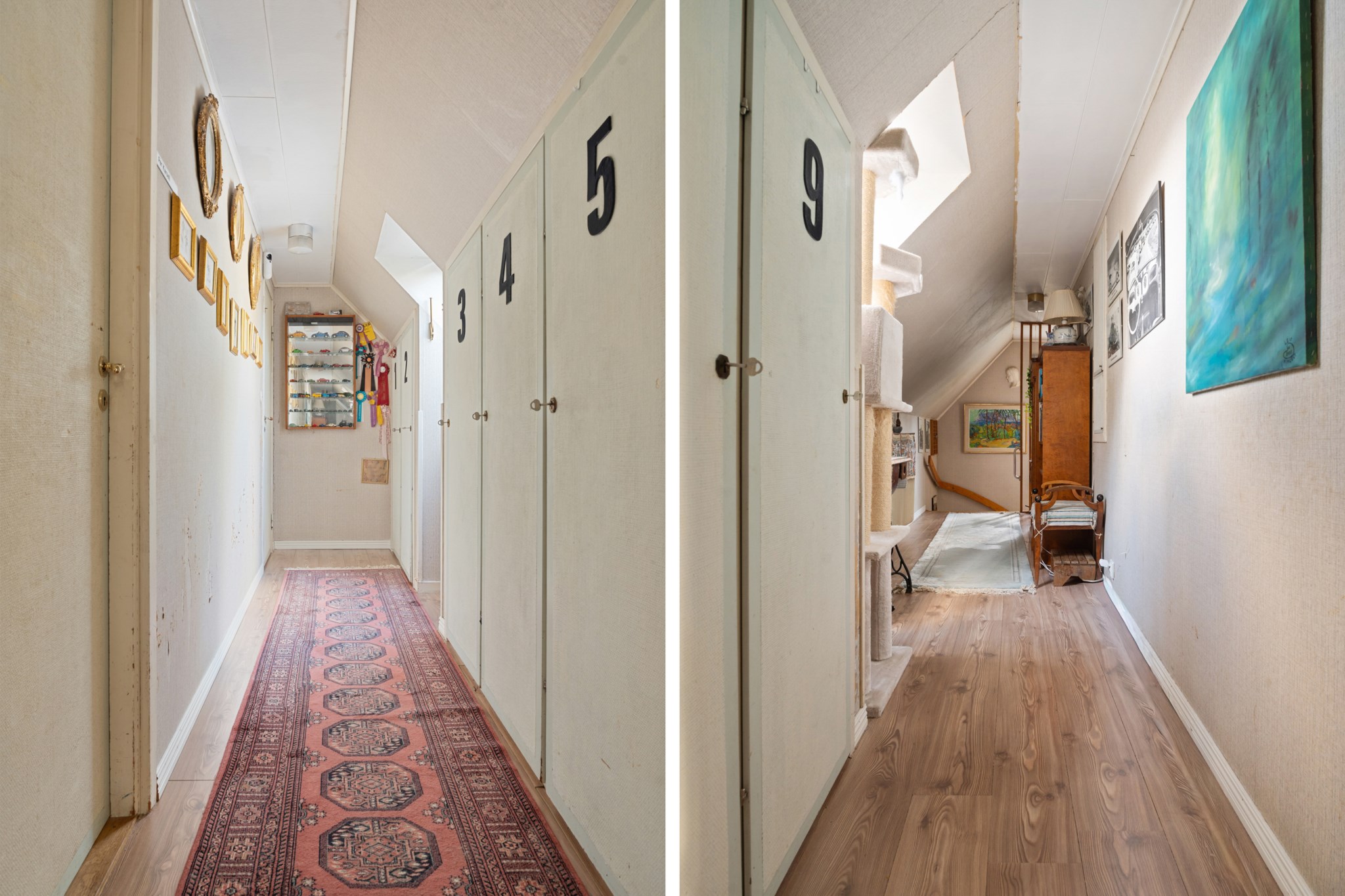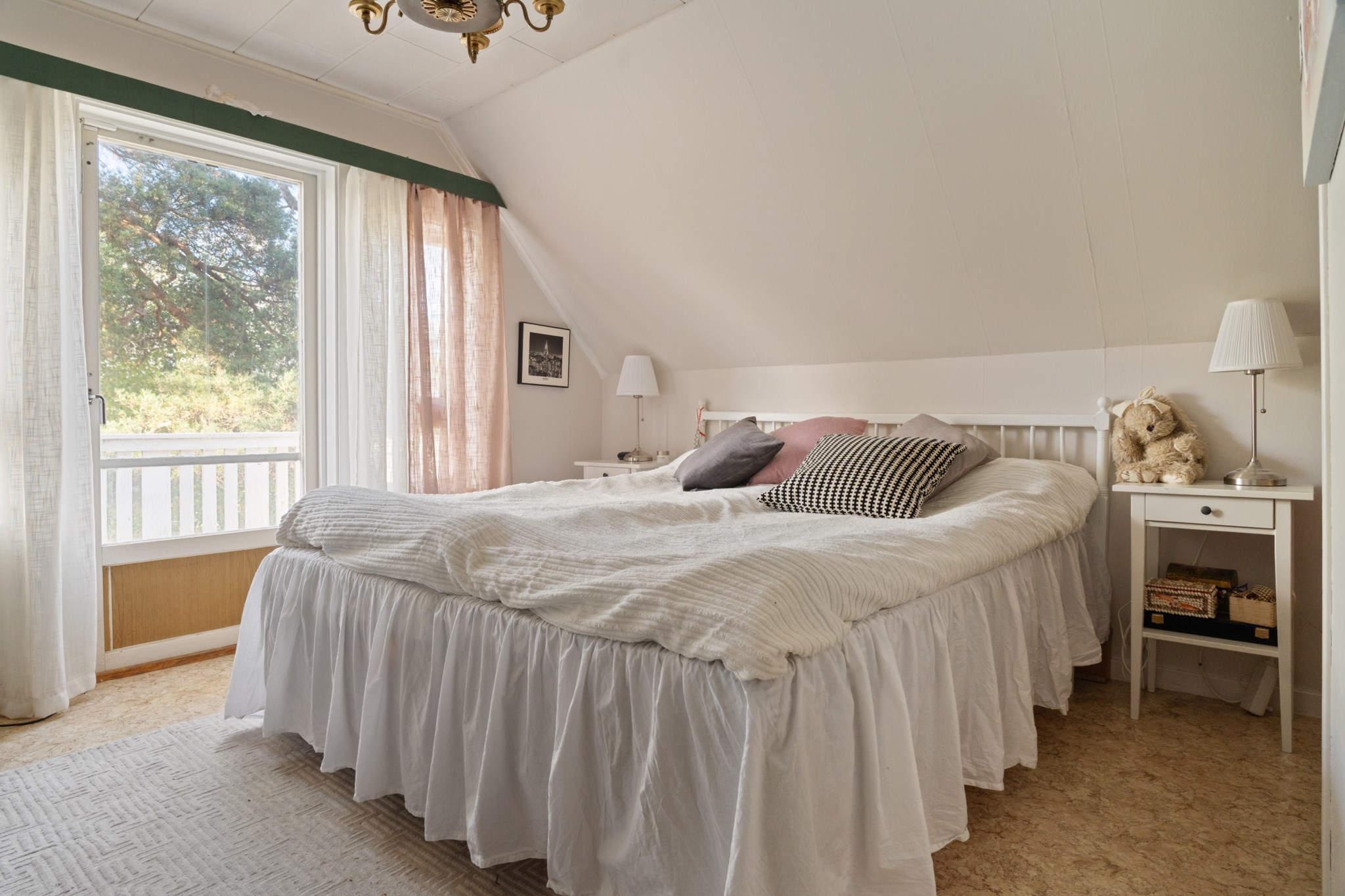 Övervåningen präglas av charmigt snedtak och rymmer tre generösa sovrum, varav ett med utgång till balkong. Flertalet garderober erbjuder gott om förvaring för kläder och diverse tillhörigheter. Här finns även en WC/dusch samt ett extra förråd vilket bidrar till både funktionalitet och bekvämlighet.