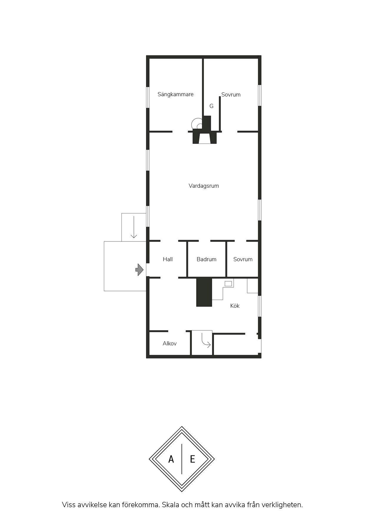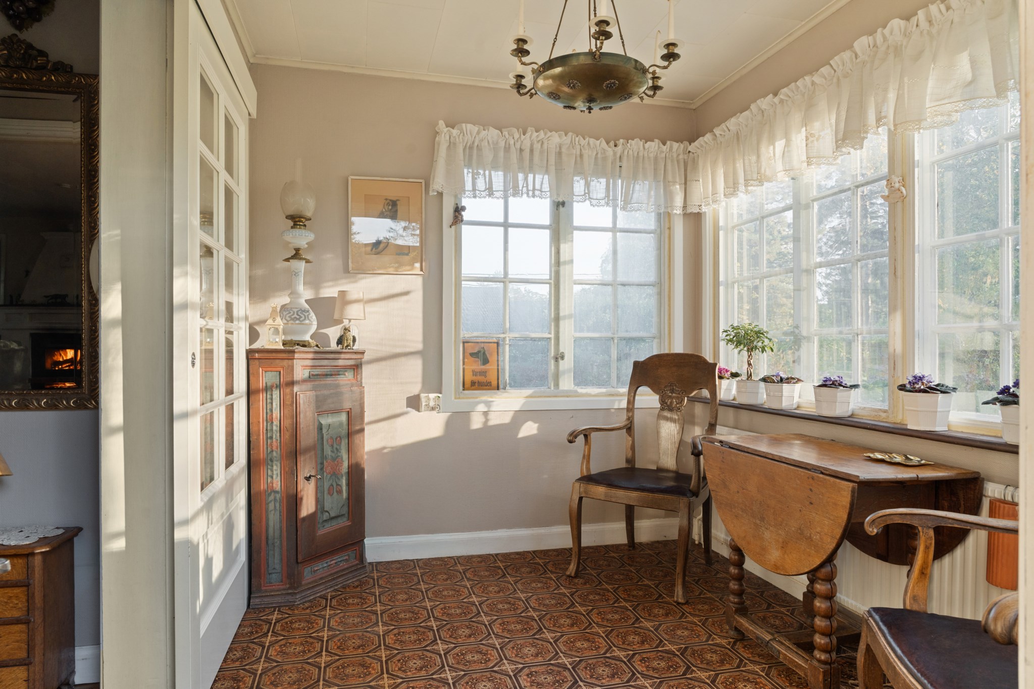 Entré via en underbar veranda med spröjsade fönster som går som en röd tråd genom hela bostaden. Entréplanet erbjuder flera rymliga sovrum samt ett mysigt vardagsrum med en stor öppen spis som graciöst utgör en ståtlig mittpunkt. Här finns gott om plats för soffa, matgrupp och övrigt möblemang. Vidare på entréplanet finns även ett funktionellt kök och ett badrum.