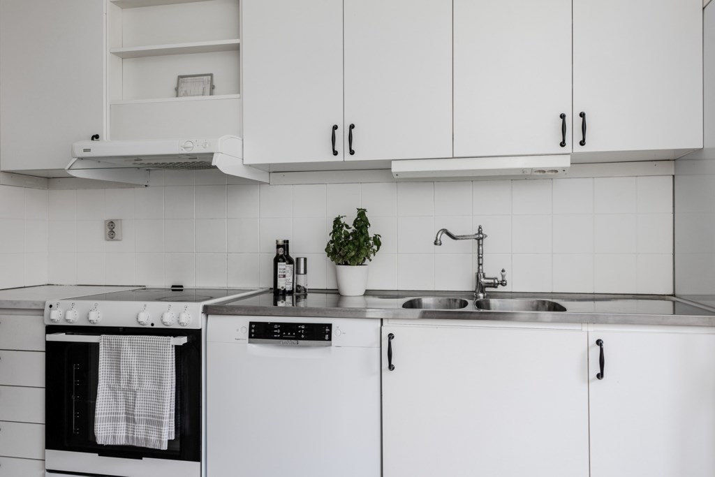 Ljust och och lättarbetat kök med gott om arbetsyta och matplats. Vita köksluckor som kombineras med en rostfri diskbänk och vitt kakel som stänkskydd. Den maskinella utrustningen består av kyl/frys, spis/ugn, diskmaskin och fläkt. Matplats vid fönster med plats för ca 4 personer.