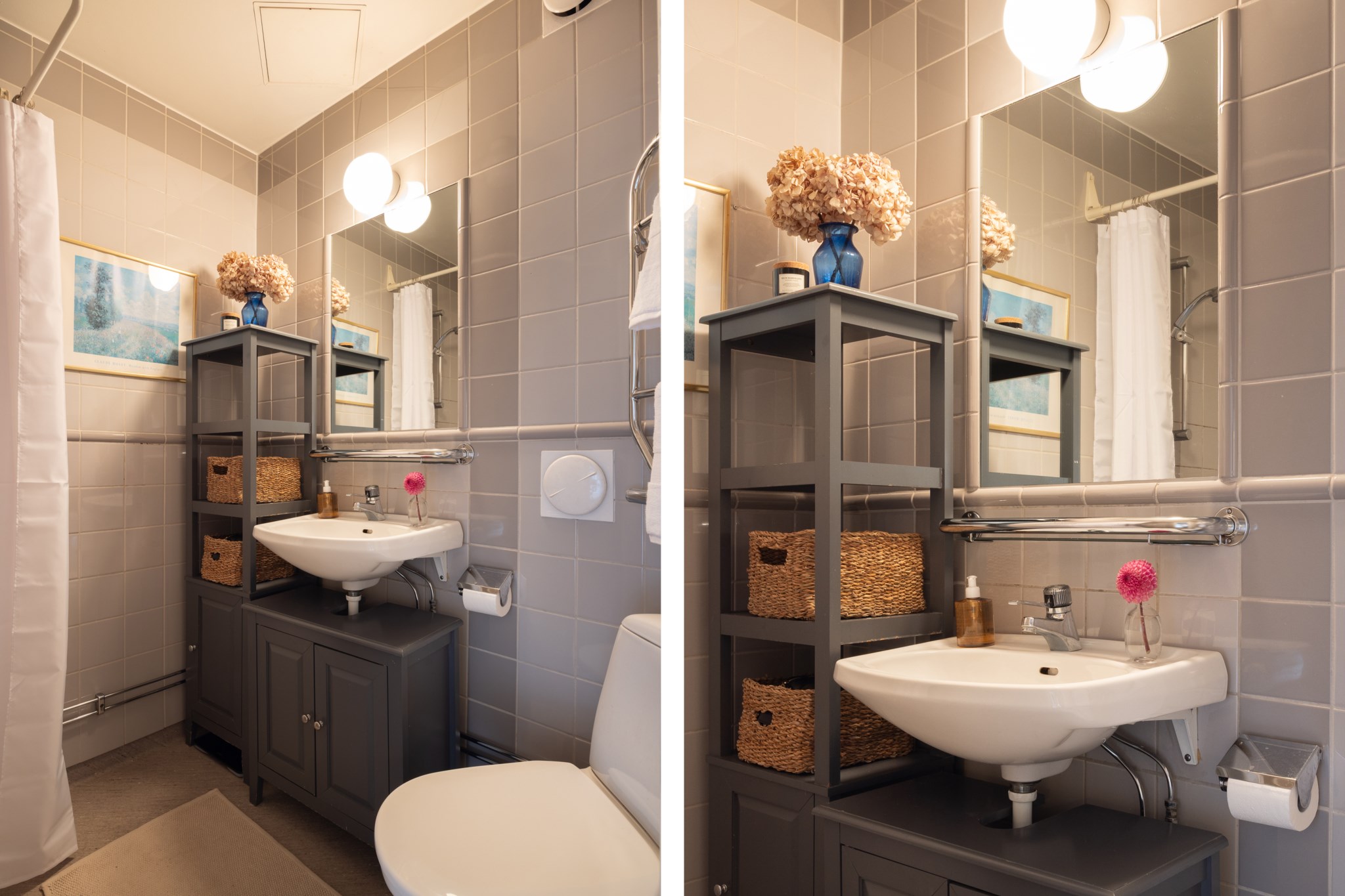 Köket är smakfullt renoverat med stilrena materialval och goda arbetsytor. Här lagar du mat med lätthet och kan samtidigt njuta av en social planlösning. Badrummet är fräscht och praktiskt, med allt du behöver för en bekväm vardag.