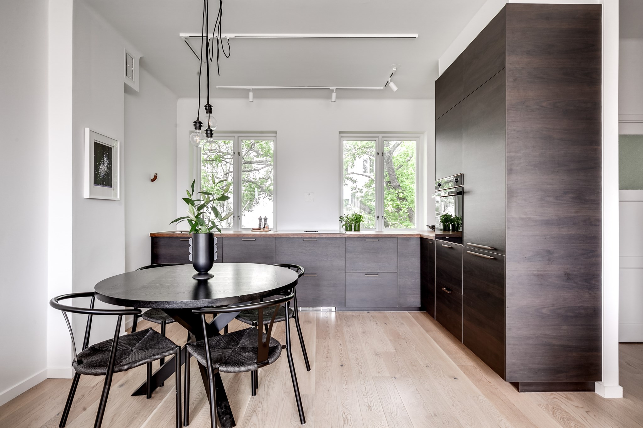 Påkostat och stilrent kök med ekparkett och allt man behöver i form av integrerad diskmaskin, kyl/frys, spis, ugn från Smeg och fläkt. Den öppna planlösningen mot vardagsrummet skapar en social och inbjudande känsla.