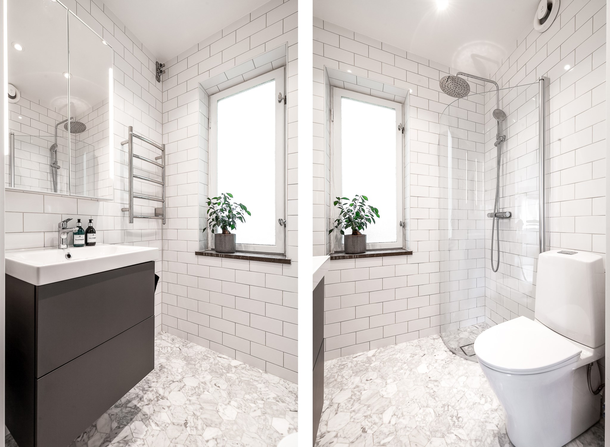 Stilrent och exklusivt badrum renoverat 2021, klätt i Carraramarmor på golv och vita kaklade väggar. Här finns allt man kan önska: handfat på kommod, handdukstork, dusch med glasväggar, spegelskåp och WC. Golvvärme ger en extra lyxig känsla och det praktiska vädringsfönstret ger både ljus och god ventilation.
