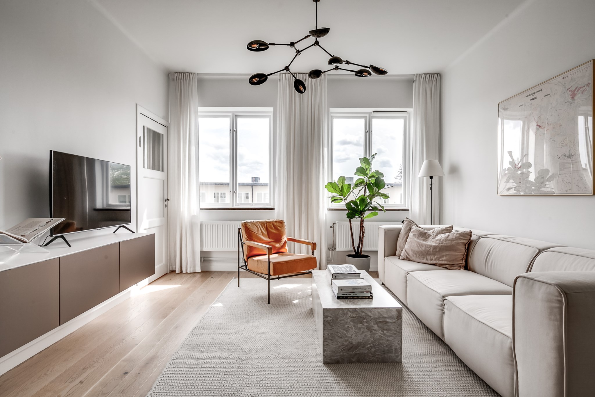 Ljust och trivsamt rum med ekparkett och smakfullt ljusmålade väggar. Här finns gott om plats för både soffa och matbord vilket gör rummet lättmöblerat och socialt. De dubbla fönstren i högt läge släpper in ett generöst ljusflöde och skapar en härlig atmosfär. Lägenheten är utrustad med Plejd smartbelysning för ett modernt och flexibelt ljus i varje rum.