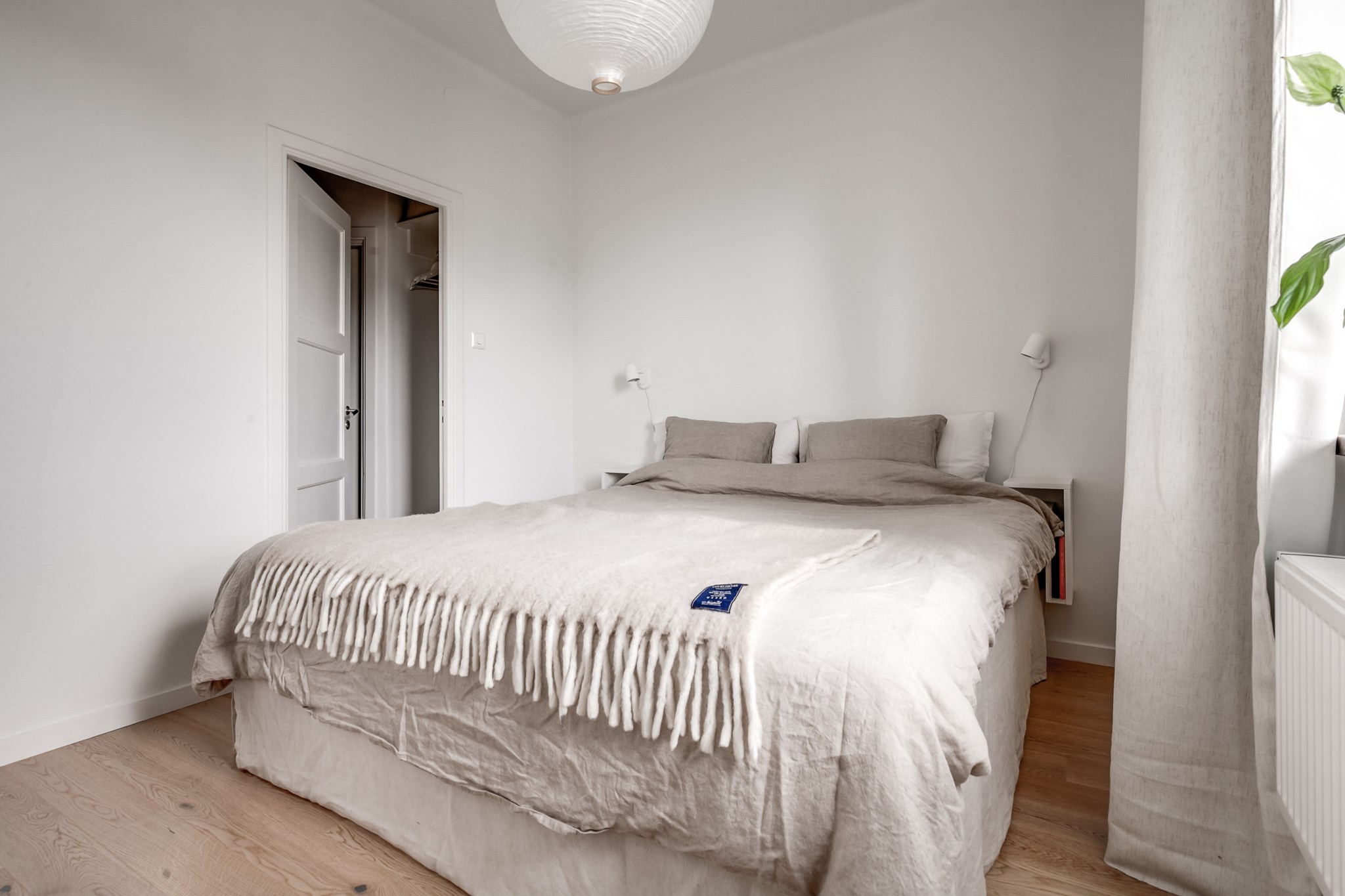 Ljust sovrum med plats för en dubbelsäng samt utmärkt förvaring i de platsbyggda garderoberna. Fönstret vetter mot ett insynsskyddat läge och bidrar till en lugn och avskild atmosfär.