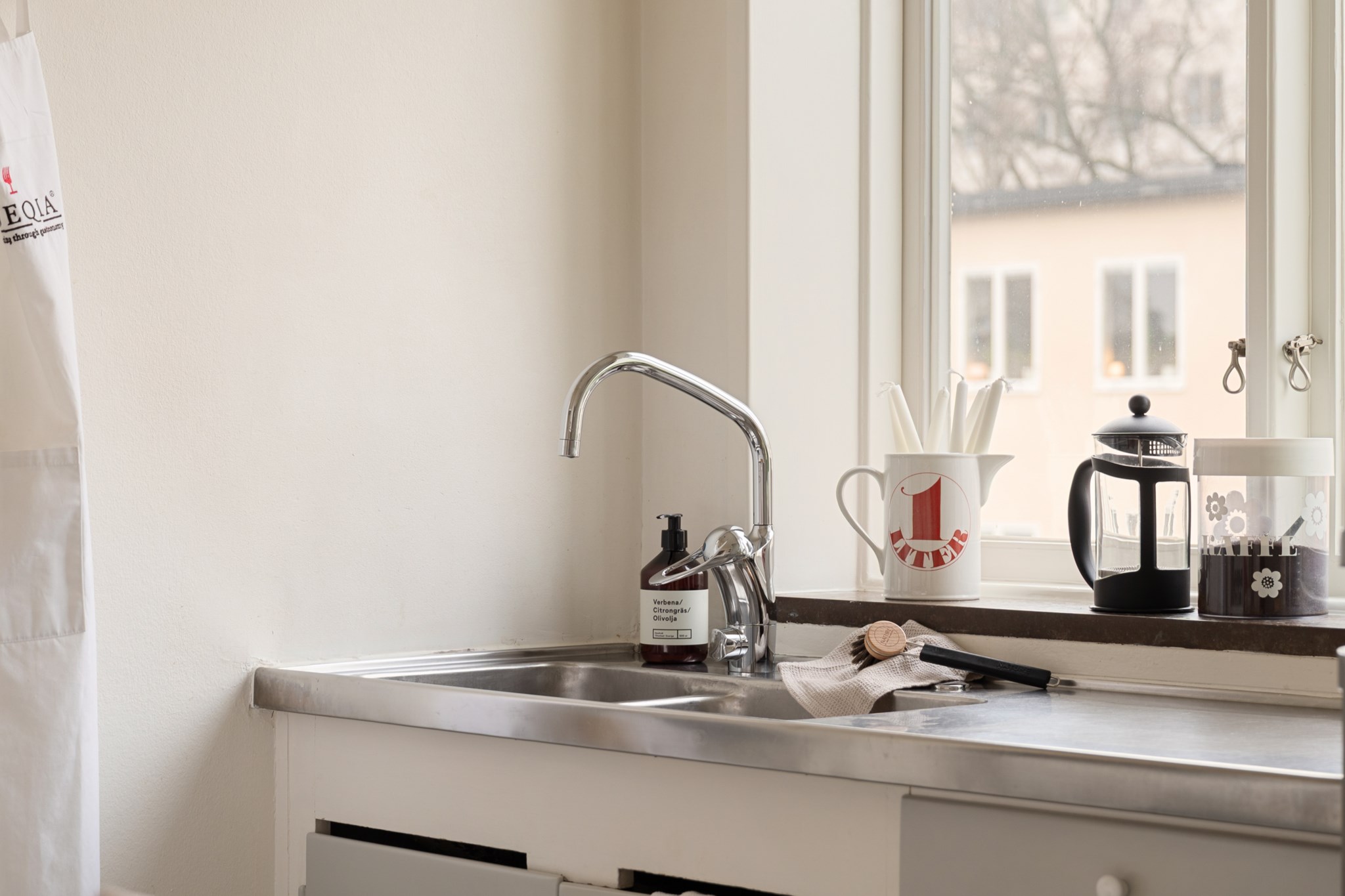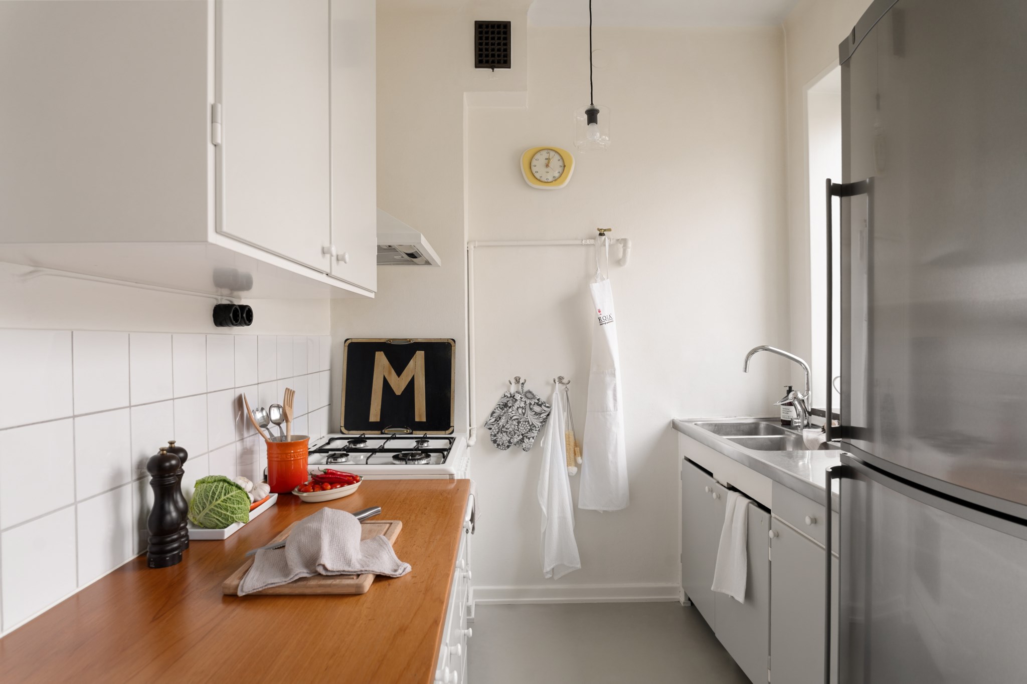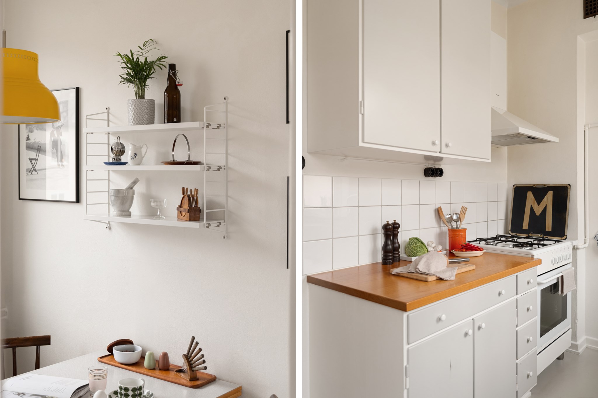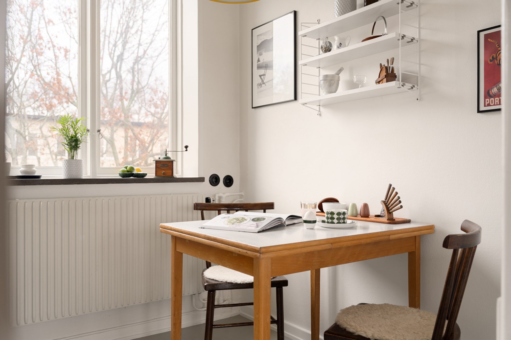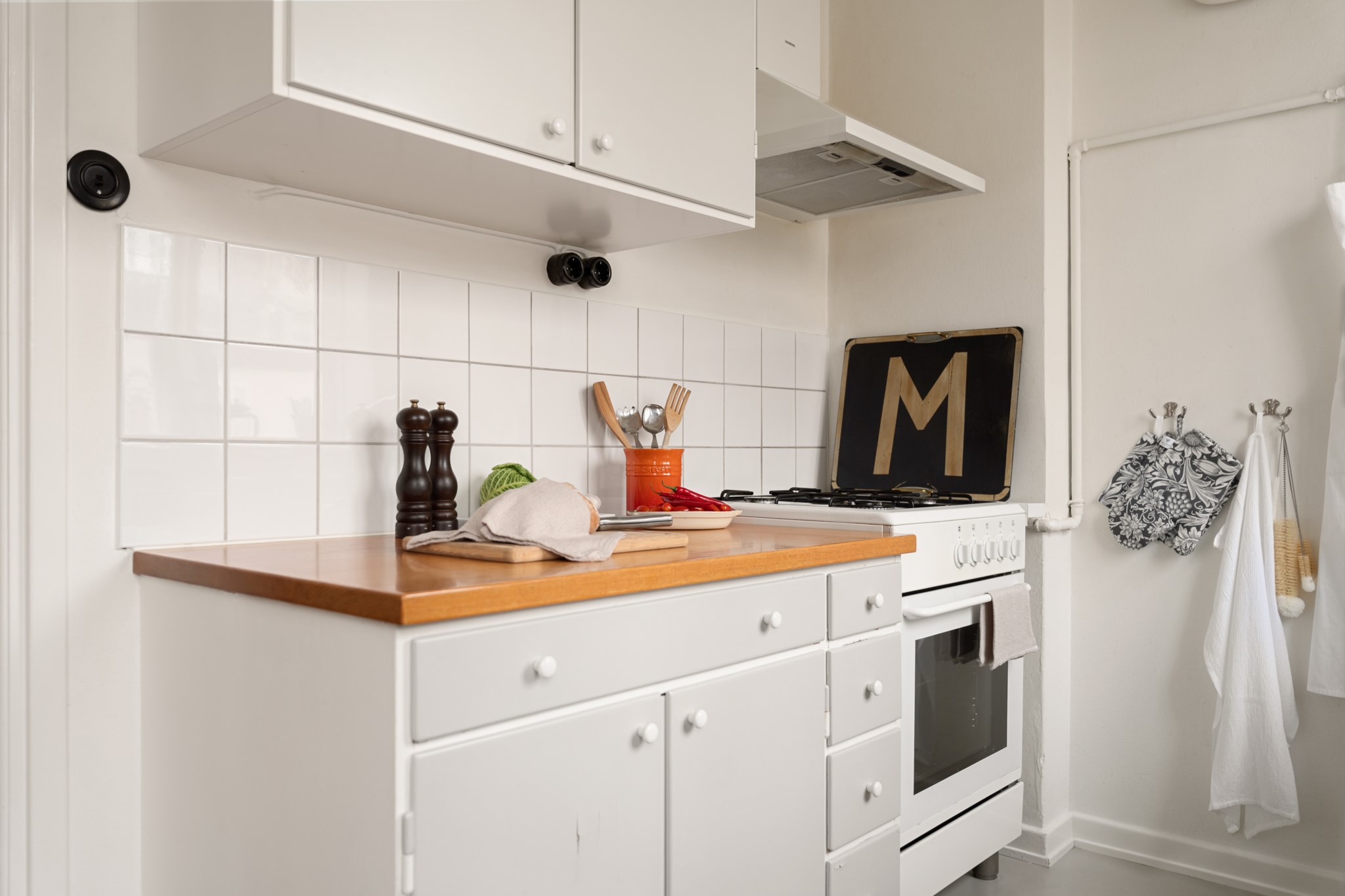 Köket nås smidigt från vardagsrummet och får ett fint ljus tack vare både sina två egna fönsterpartier och glasdörren som förbinder rummen. Här möts ljusa väggar och ett ljusgrått golv av ett kök med ljusgrå skåpsluckor, bänkskiva i trä och vitt kaklat stänkskydd. Utrustat med kyl, frys, spis, fläkt och en diskho placerad vid fönstret. Det finns dessutom plats för ett matbord för två.