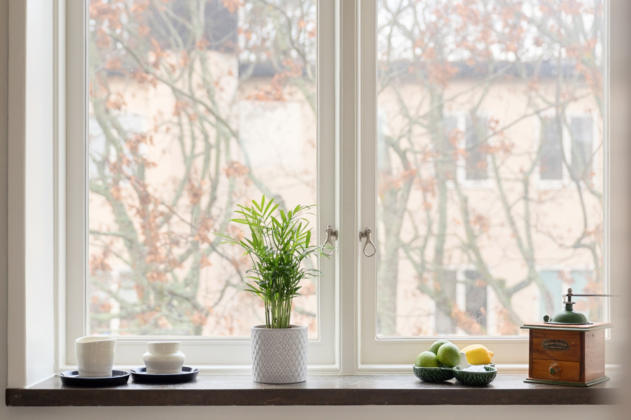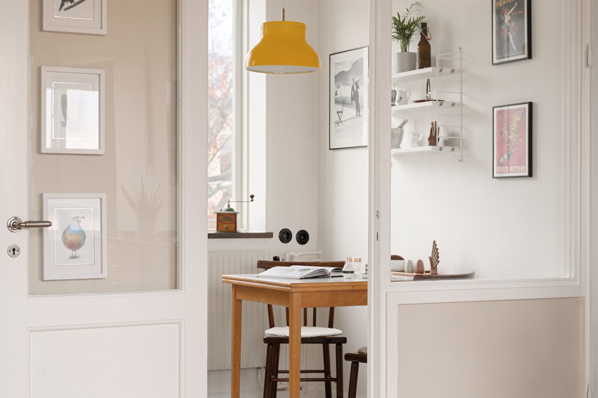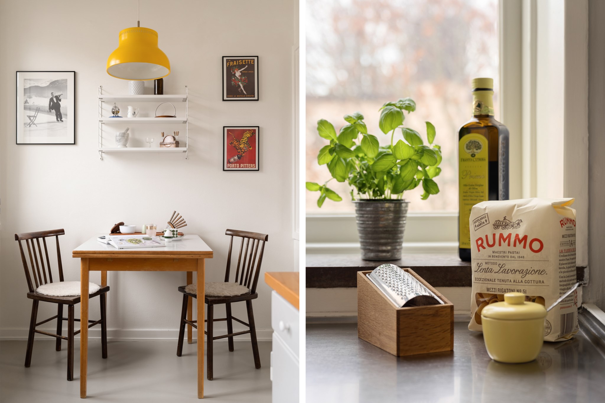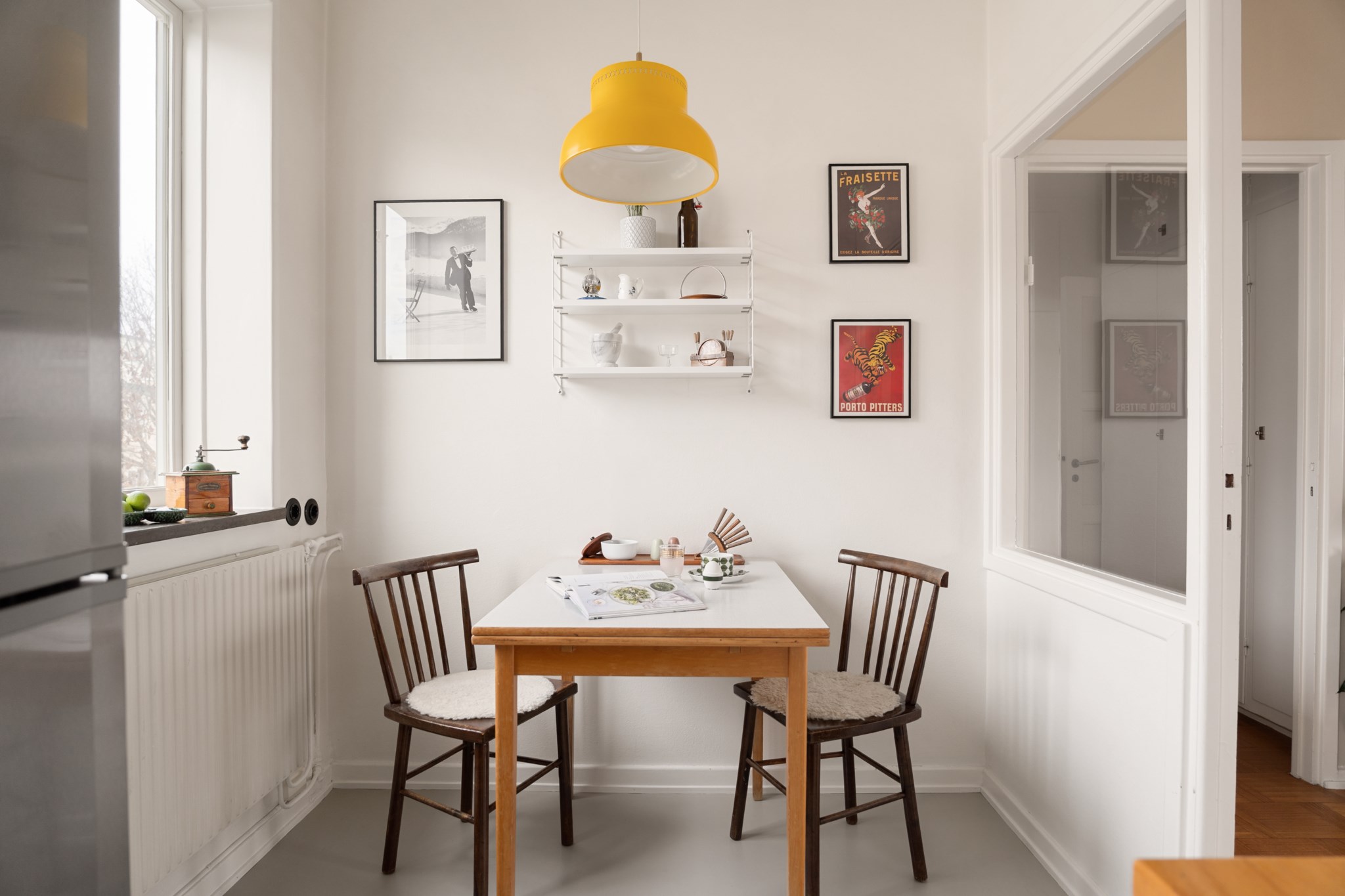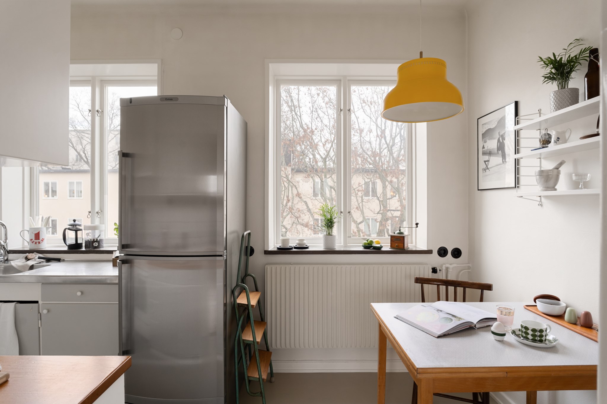Köket nås smidigt från vardagsrummet och får ett fint ljus tack vare både sina två egna fönsterpartier och glasdörren som förbinder rummen. Här möts ljusa väggar och ett ljusgrått golv av ett kök med ljusgrå skåpsluckor, bänkskiva i trä och vitt kaklat stänkskydd. Utrustat med kyl, frys, spis, fläkt och en diskho placerad vid fönstret. Det finns dessutom plats för ett matbord för två.