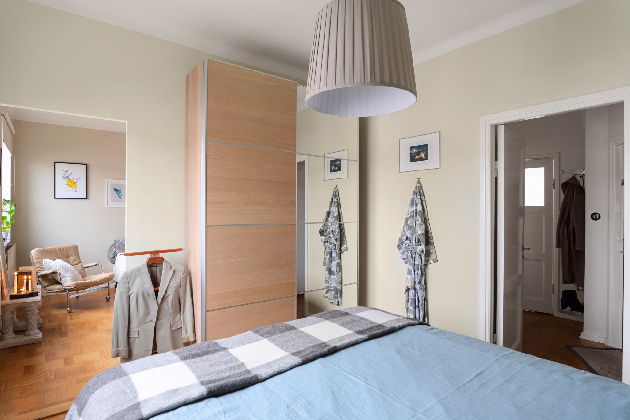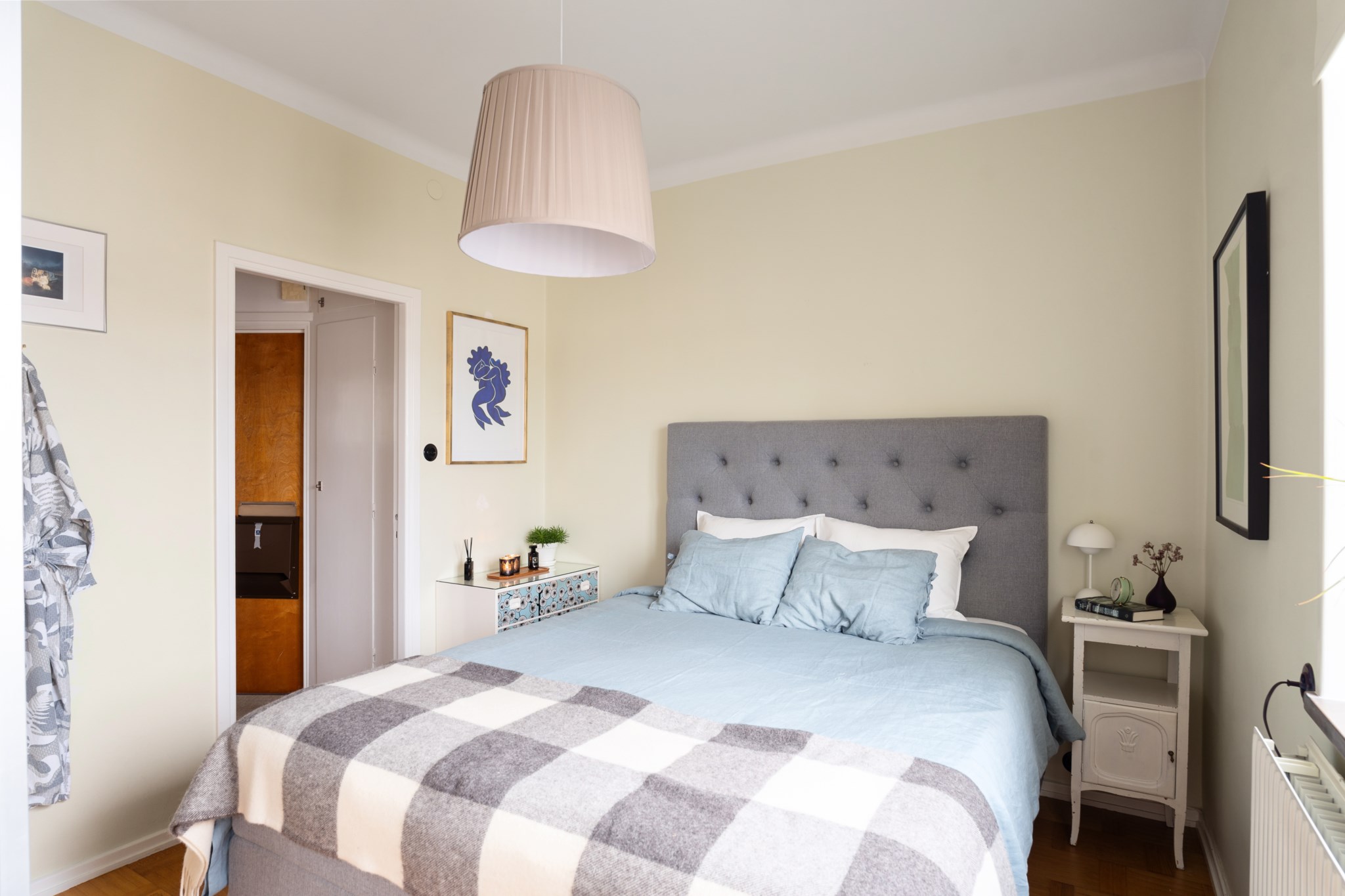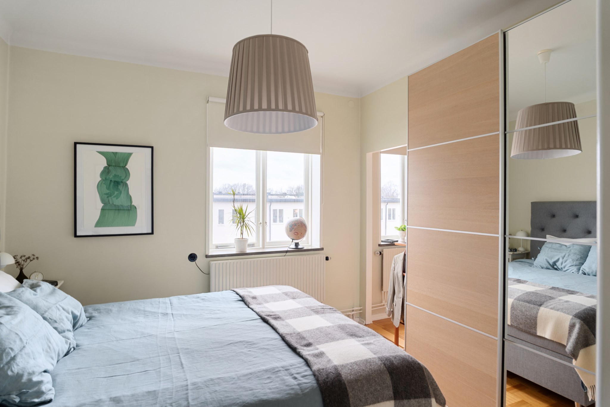 Generöst sovrum med samma vackra träparkett som i övriga delar av bostaden, här kombinerad med lugna, ljusgröna väggar. Rummet rymmer dubbelsäng, sängbord och avlastningsbord och har dessutom en stor garderob samt ett trevligt fönsterparti.
