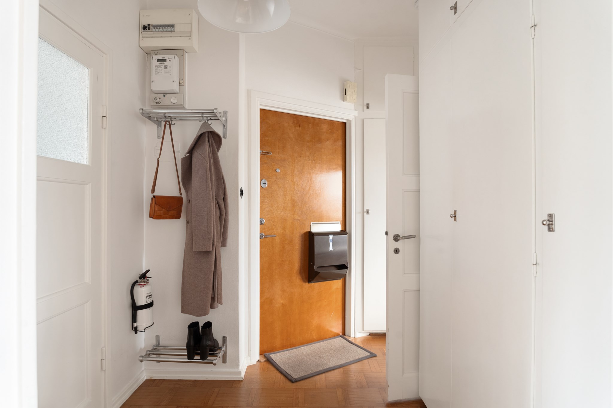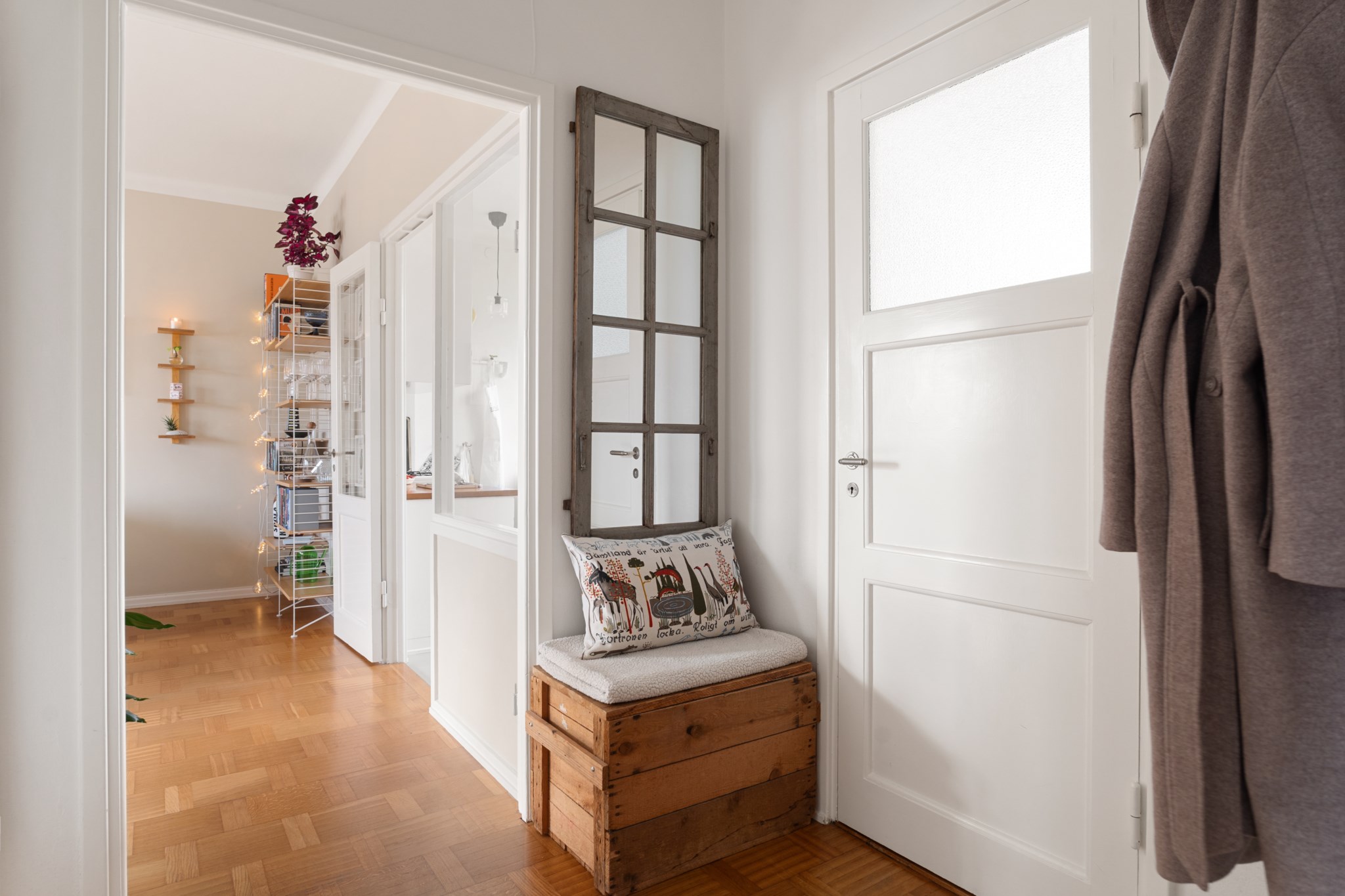 Välkomnande och ljus hall med vacker träparkett. Innanför dörren finns praktisk avhängningsmöjlighet och en smidig skohylla. Här erbjuds även tre rymliga garderober samt en sittmöjlighet, perfekt när skorna ska av eller på.