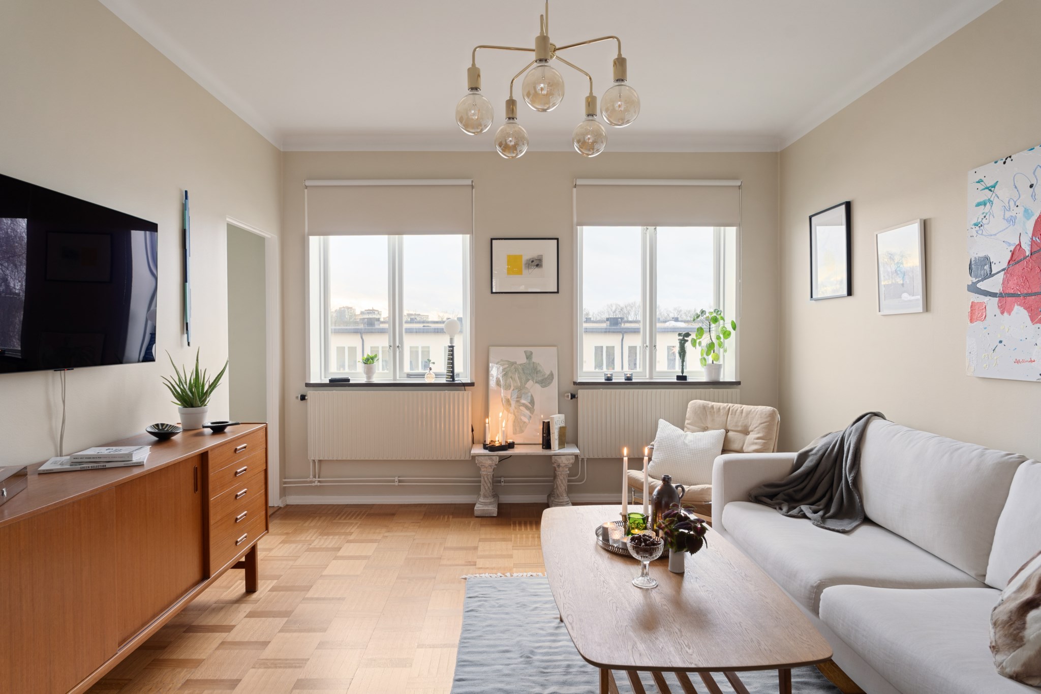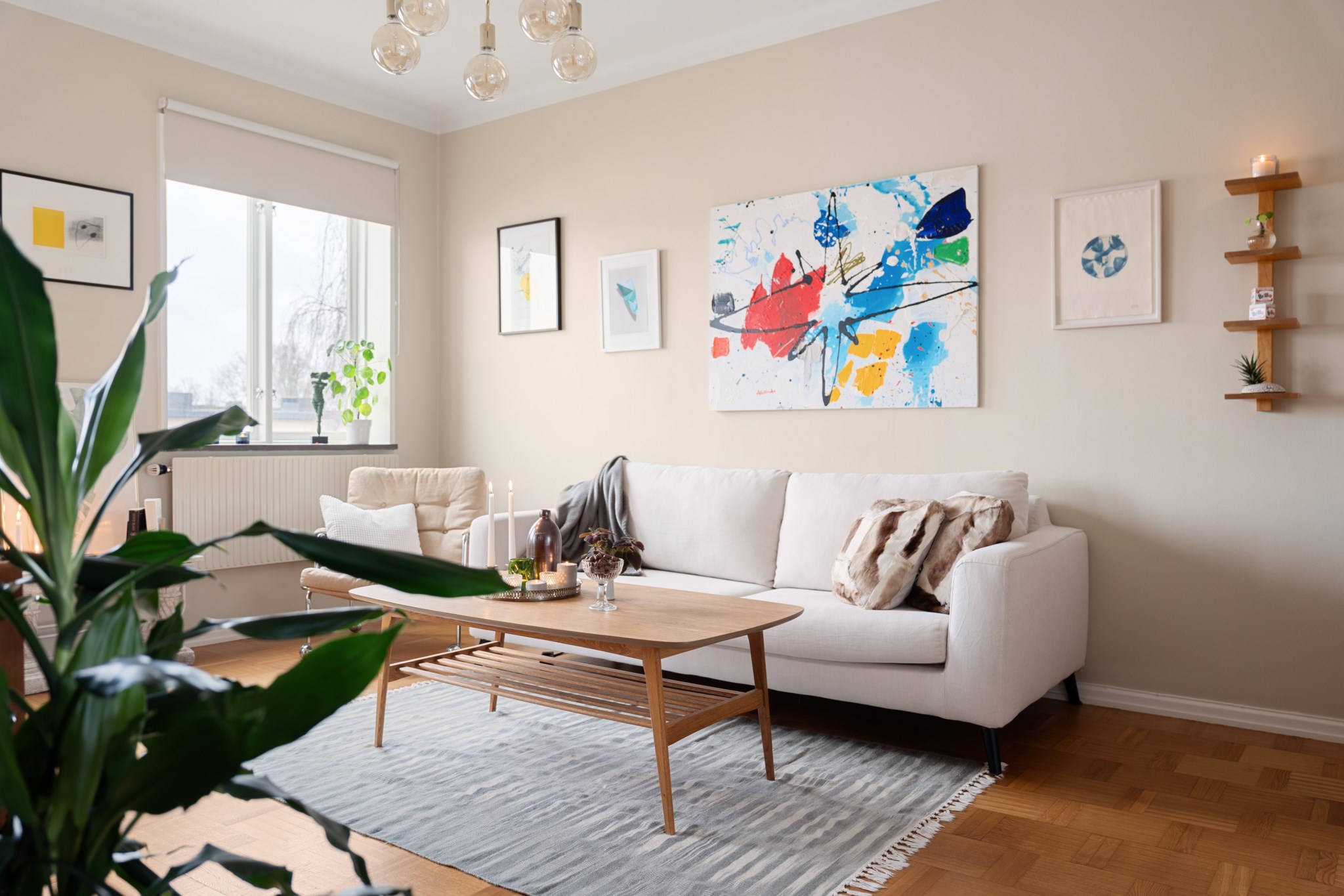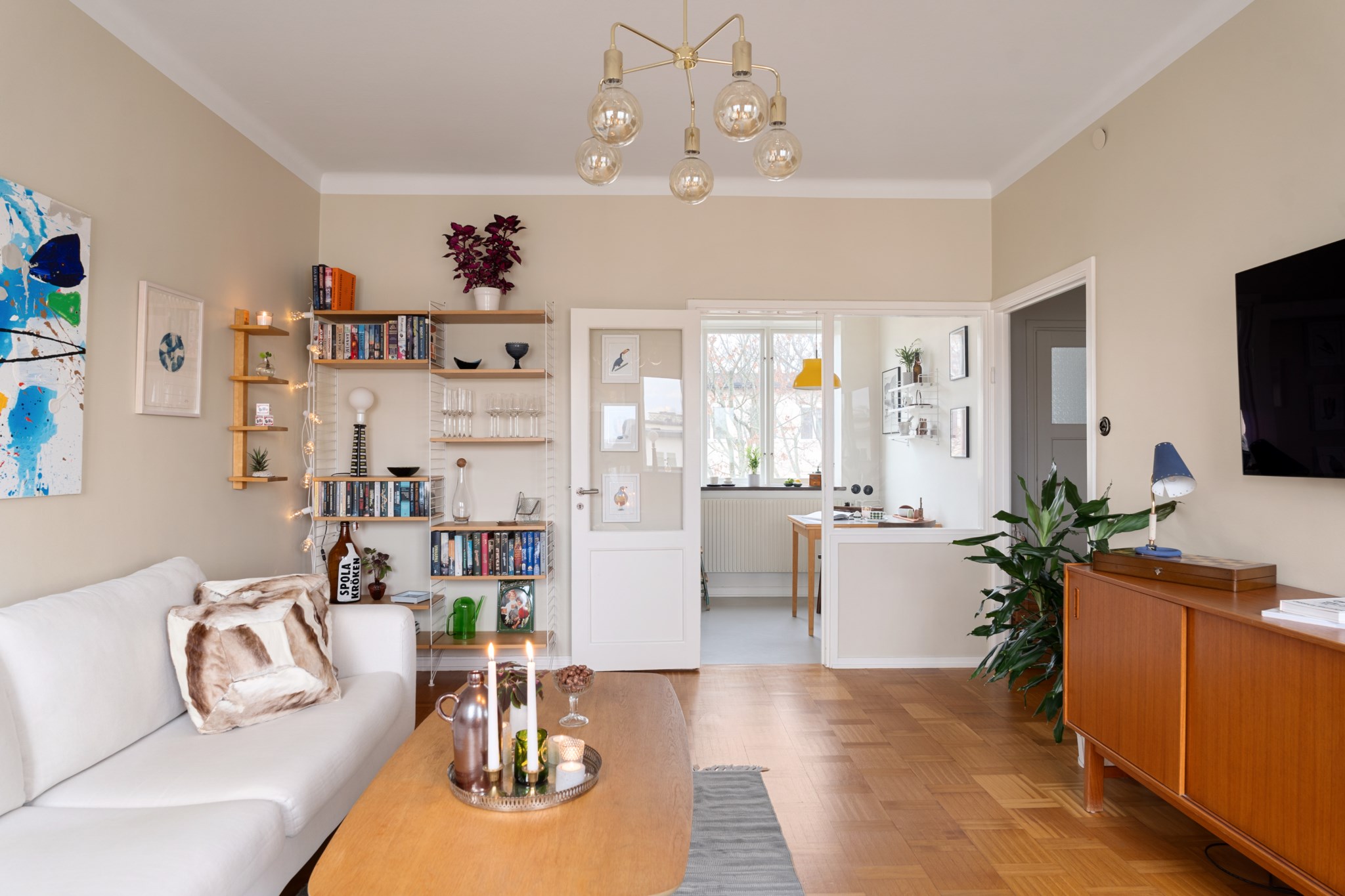 Genom en generös dörröppning nås det luftiga vardagsrummet, där de ljusa väggarna och den vackra träparketten fortsätter. Två fina fönsterpartier ger rikligt med ljus och bidrar till rummets öppna känsla. Här finns gott om plats för både soffa, bokhylla, byrå, avlastningsbord och fåtölj.