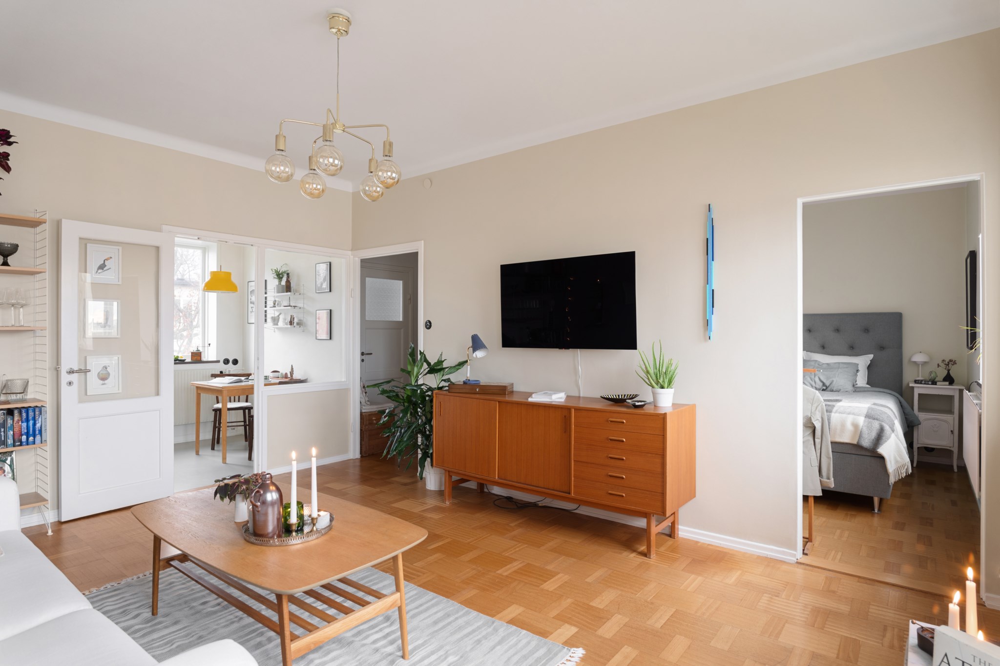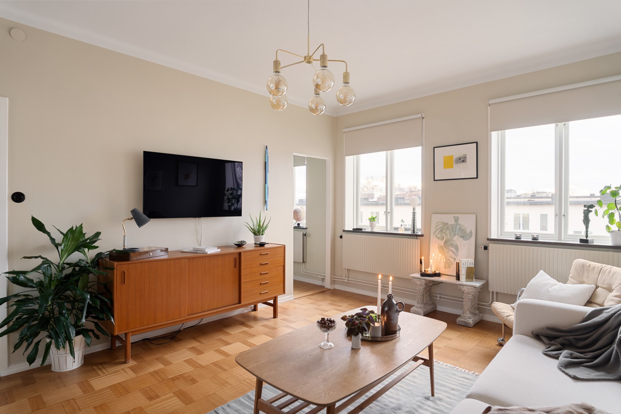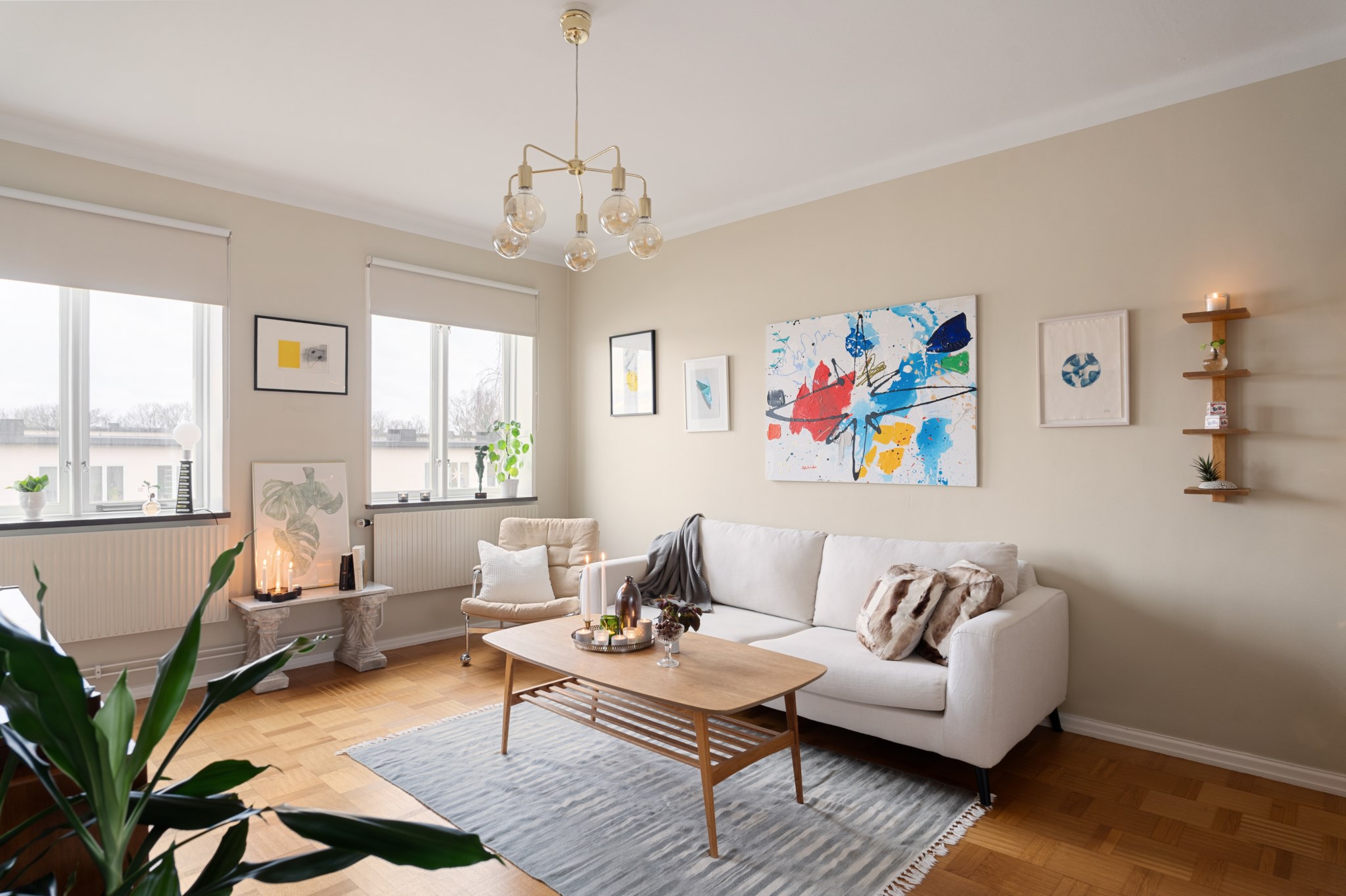 Genom en generös dörröppning nås det luftiga vardagsrummet, där de ljusa väggarna och den vackra träparketten fortsätter. Två fina fönsterpartier ger rikligt med ljus och bidrar till rummets öppna känsla. Här finns gott om plats för både soffa, bokhylla, byrå, avlastningsbord och fåtölj.