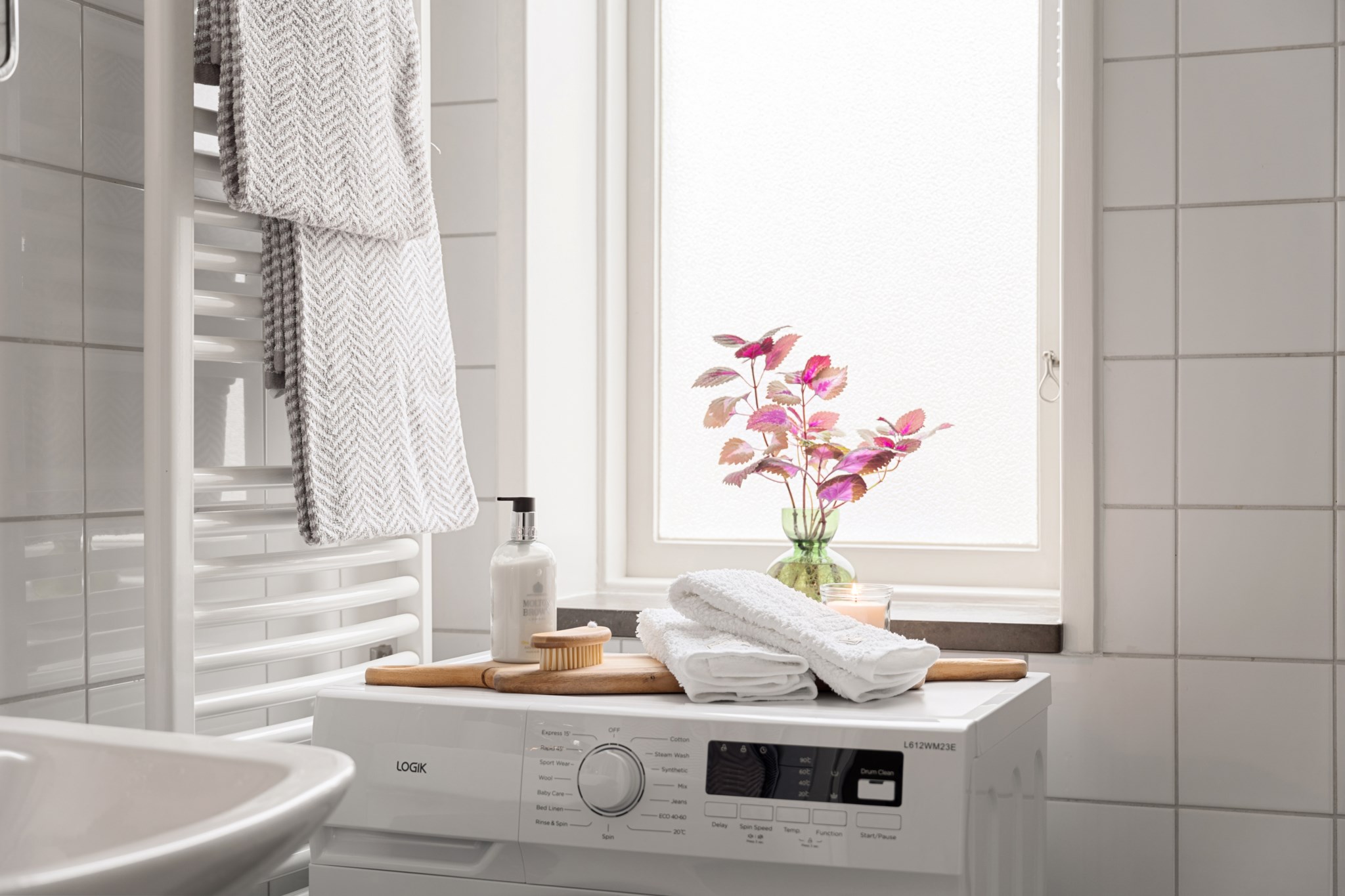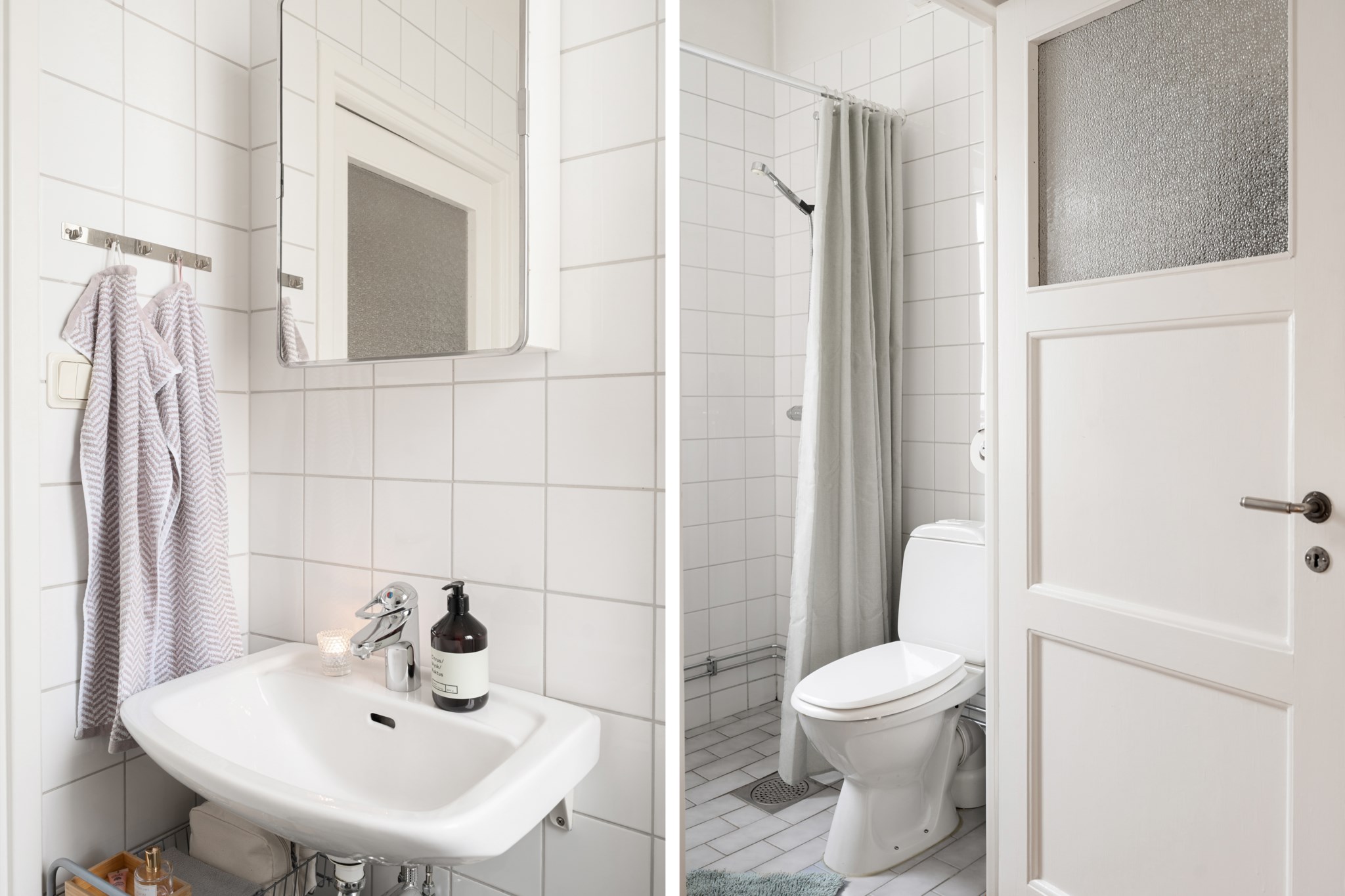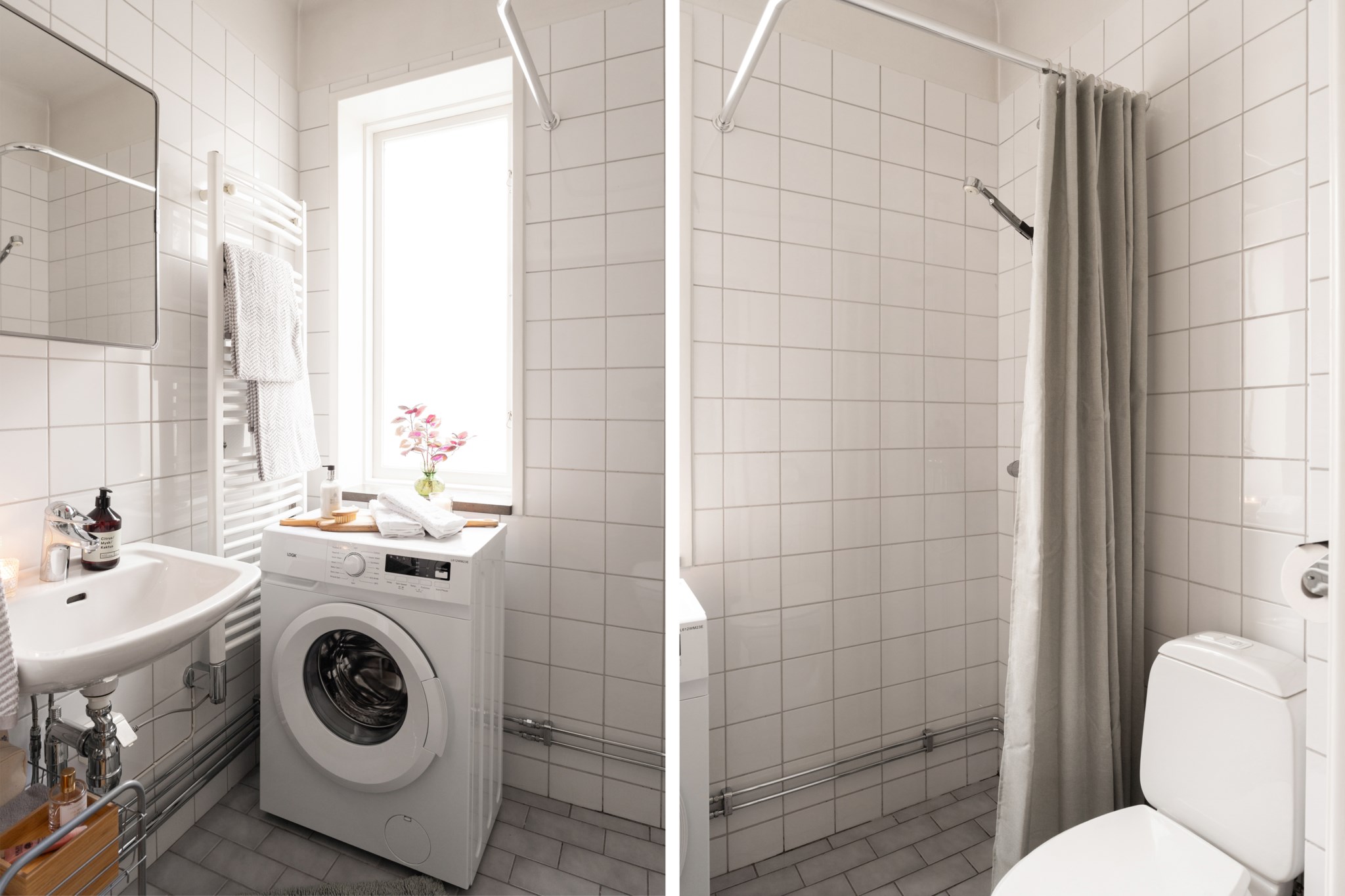 Ljust och fräscht badrum med grått klinkergolv och vita kakelväggar. Ett fönster ger både dagsljus och möjlighet till vädring. Här finns dusch, WC, handfat samt spegel med förvaring på baksidan. Badrummet är dessutom utrustat med tvättmaskin för extra bekvämlighet.