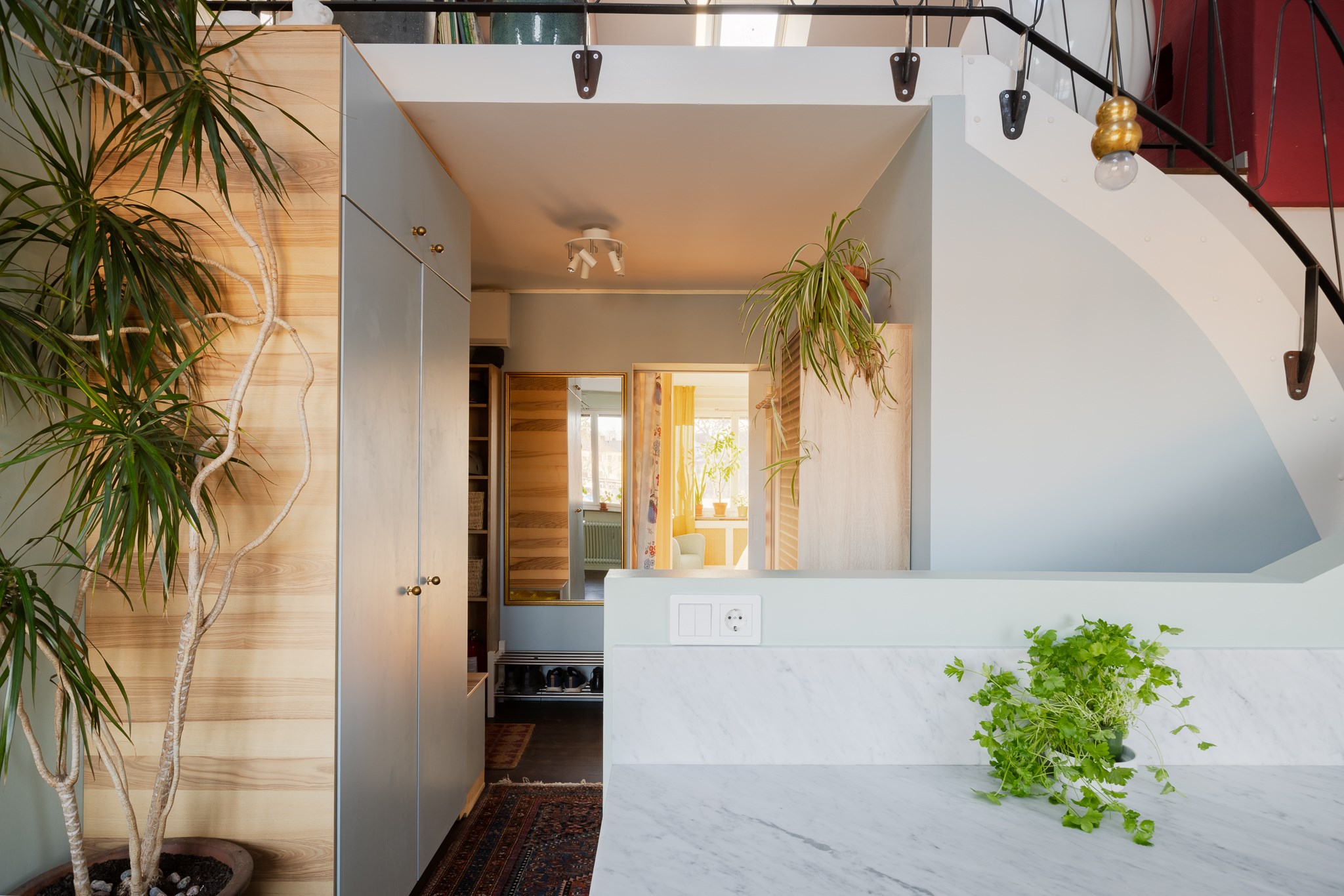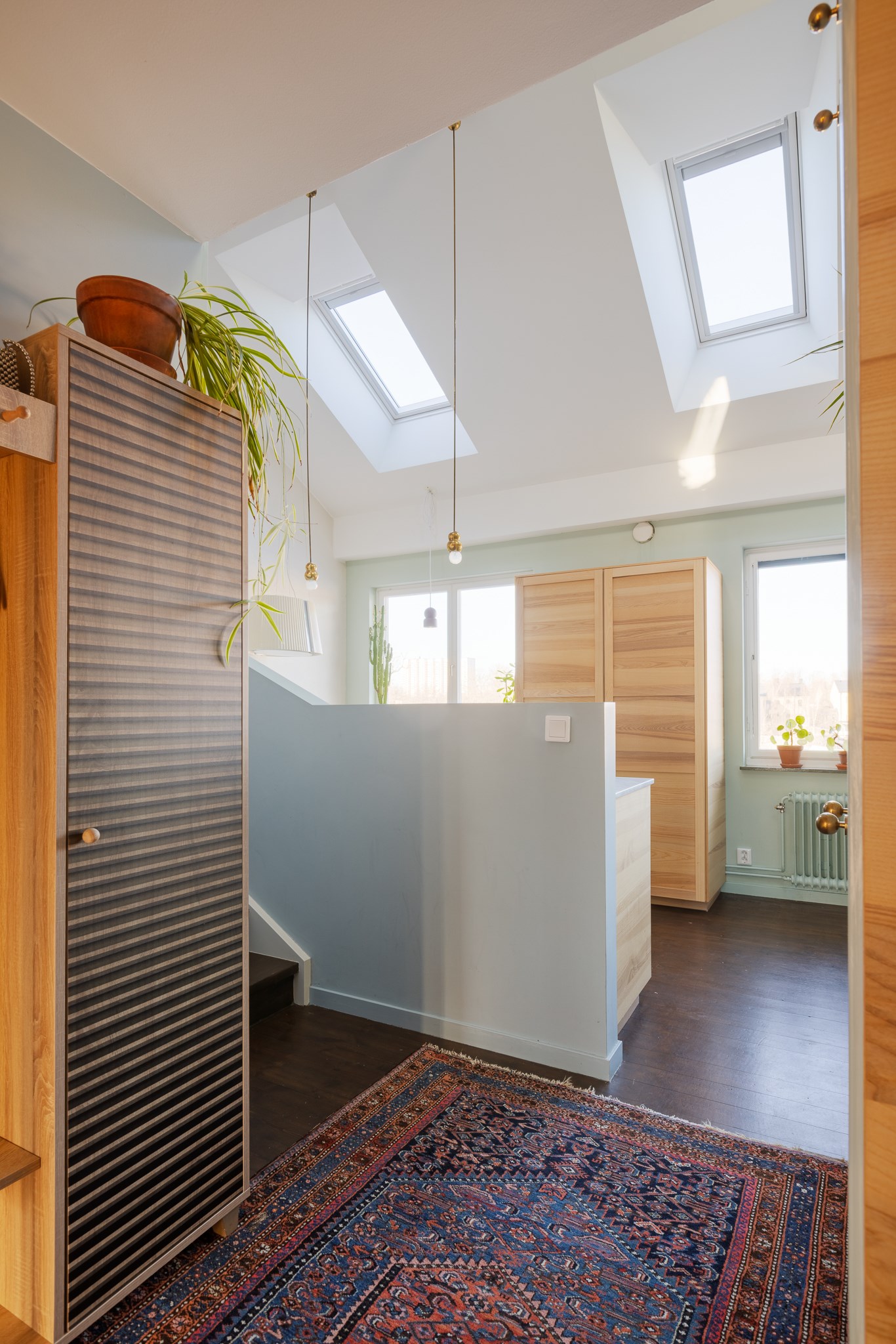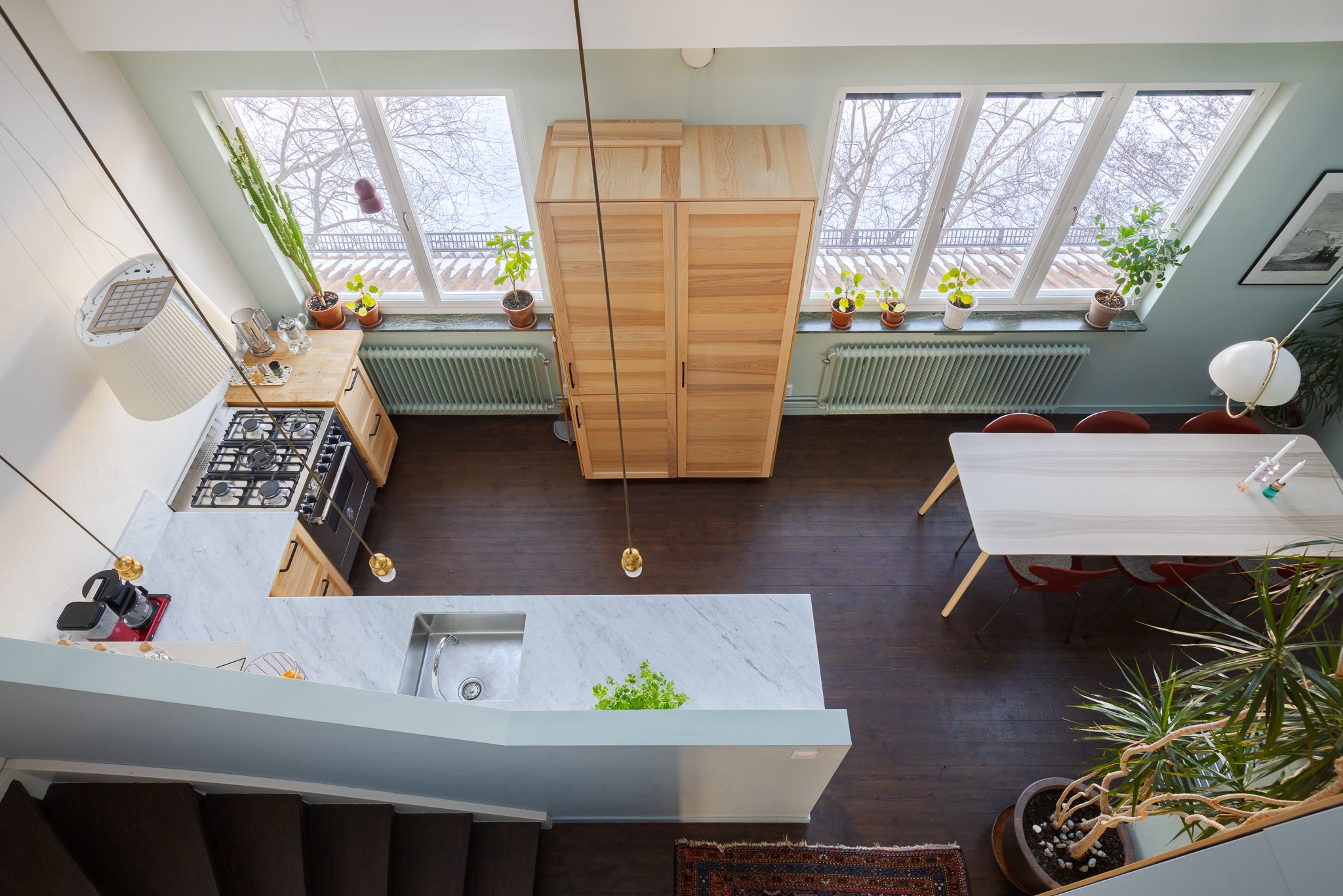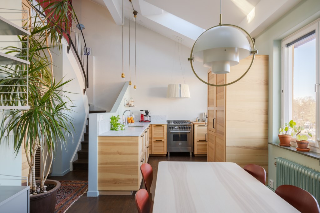 Bostaden har en genomgående planlösning med härlig rymd och fint ljusinsläpp. Ombyggnaden är arkitektritad av Ivar Kardell. Hallen erbjuder platsbyggd förvaring i varm träton och säkerhetsdörr. Köket är smakfullt utformat med carrarabänkskiva, gasspis från Bertazzoni och designfläkt från franska XX. Den öppna planlösningen, generösa takhöjden, takfönstren och de stora fönsterpartierna skapar ett fantastiskt ljusflöde. Intill finns en trivsam matplats med rogivande utsikt mot Pålsundet och Långholmen.