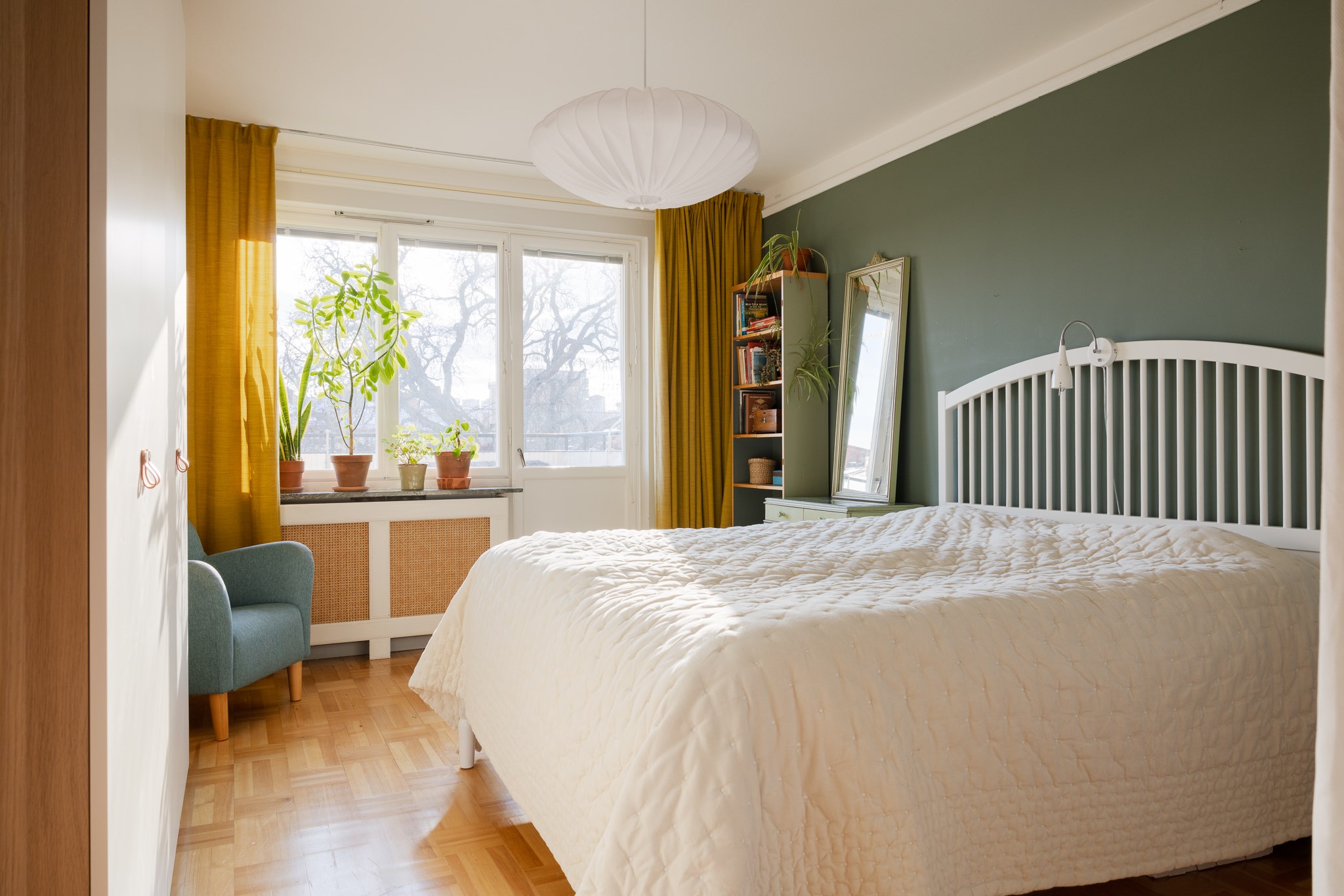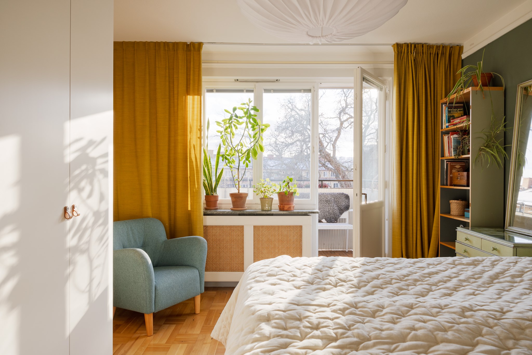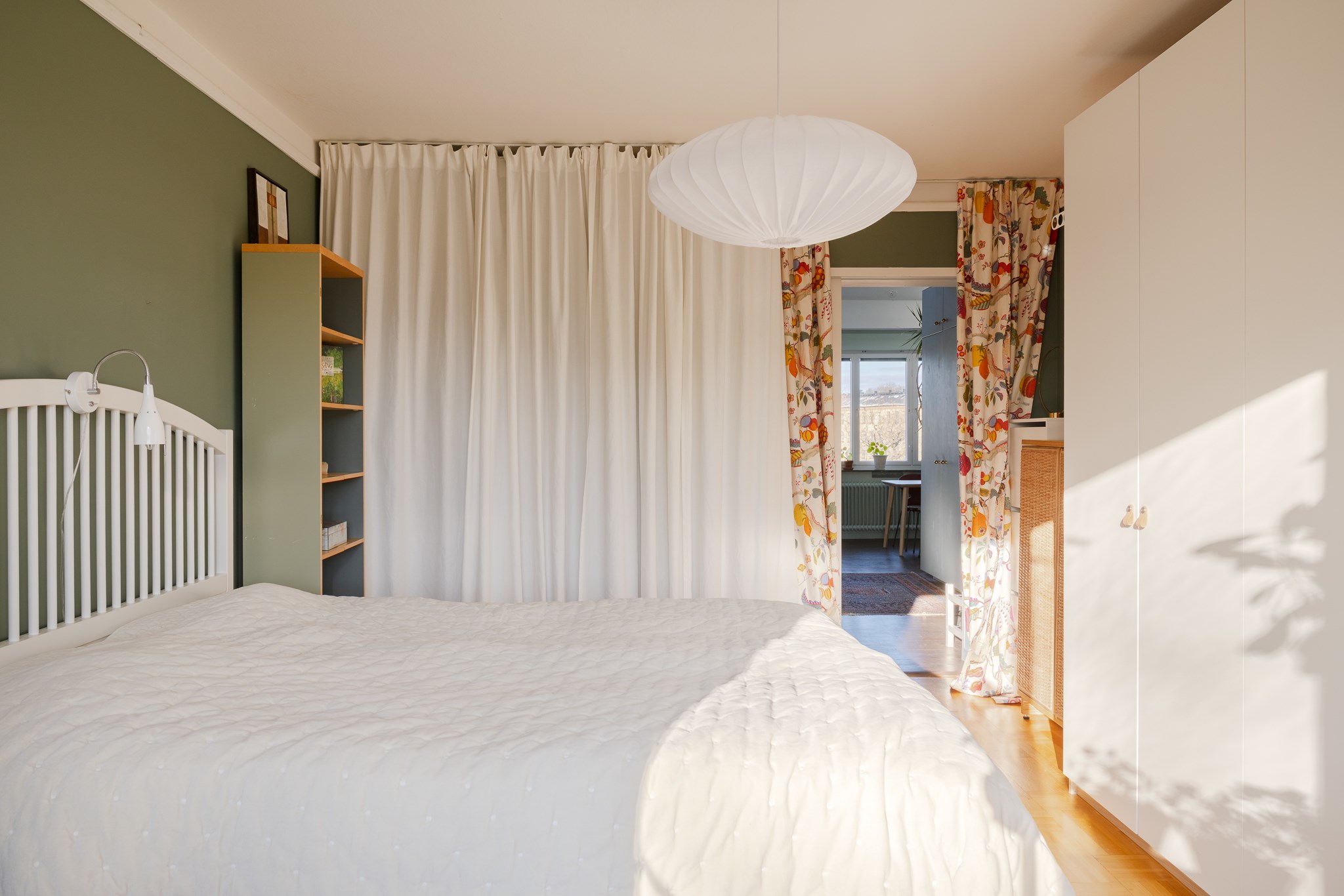 Ljuvligt sovrum med stort fönsterparti mot Anders Reimers malmgård som ger ett fint ljusinsläpp och rogivande utsikt. Rummet har gott om plats för dubbelsäng, arbetsbord och förvaring i garderober. Vacker ekparkett löper genom rummet och under fönstret sitter ett stilfullt elementskydd som förstärker den genomtänkta känslan. Härifrån nås även bostadens balkong i söderläge – en solig förlängning av rummet med fri och grönskande vy.