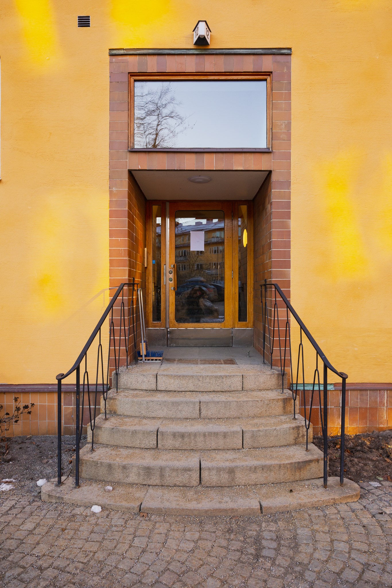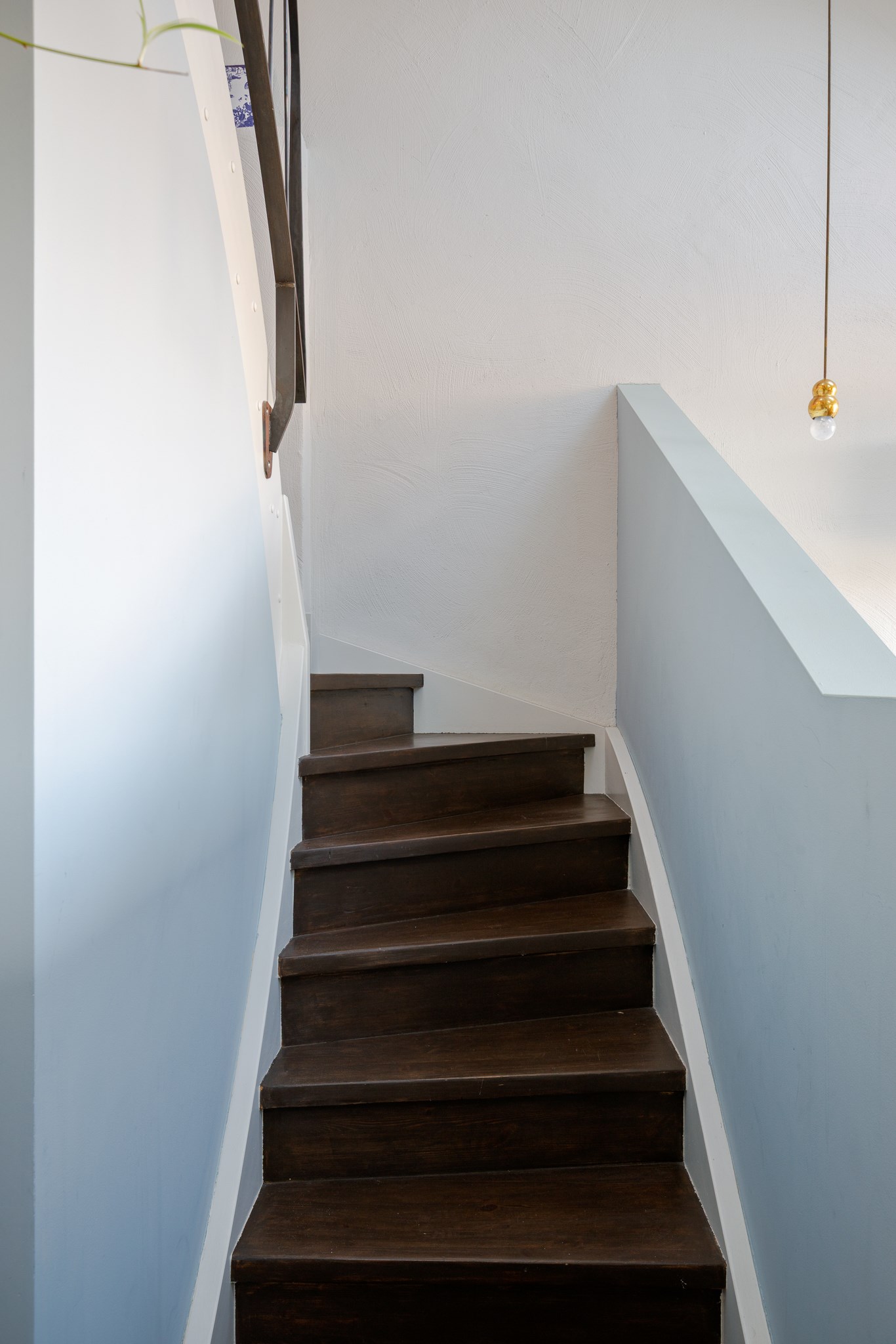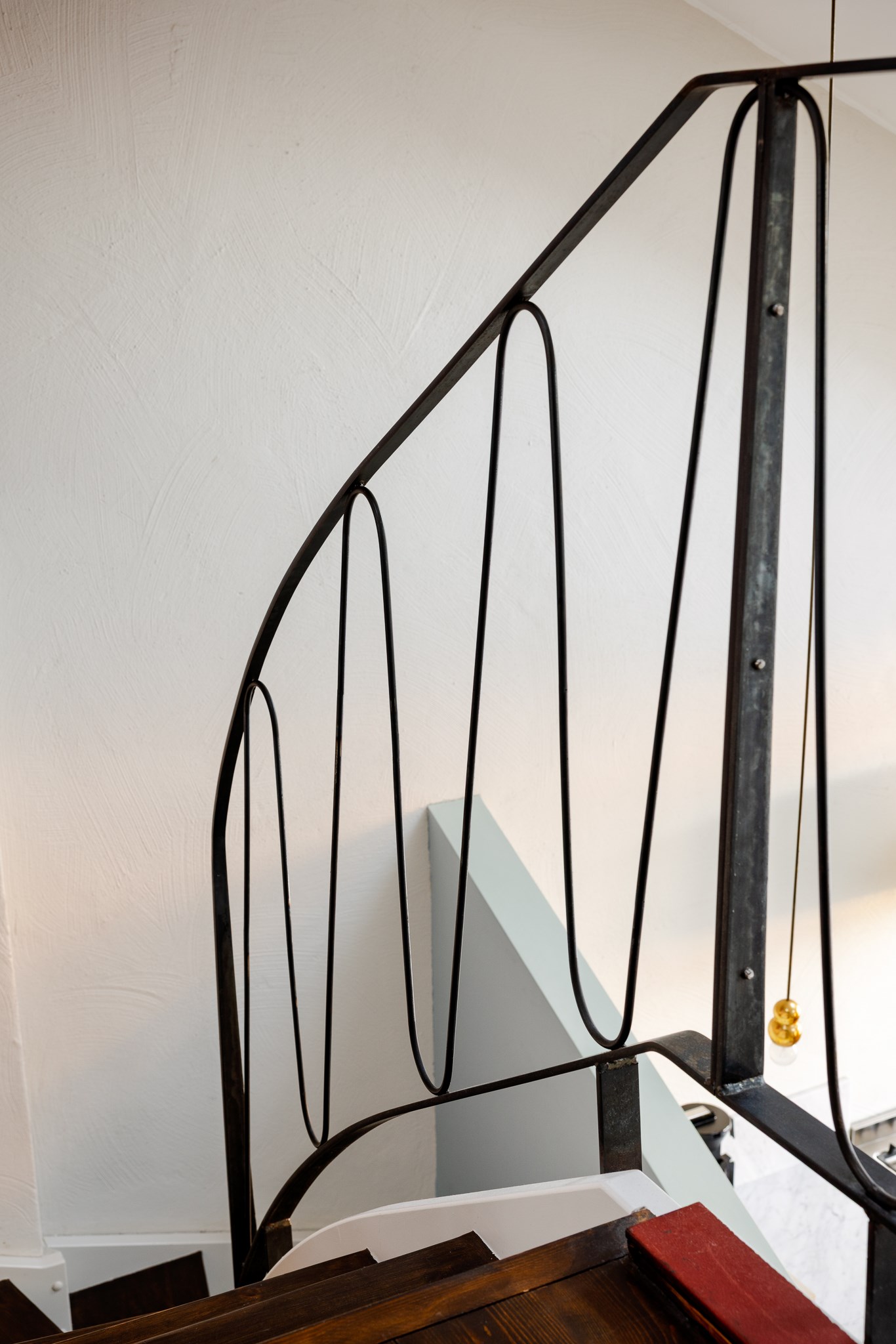Invändig trappa med mörkbetsade trästeg och nätt smidesräcke i svart, utformad i samma arkitektoniska stil som husets originalräcken i trapphuset. Ett elegant och tidstypiskt inslag som förstärker bostadens karaktär.
