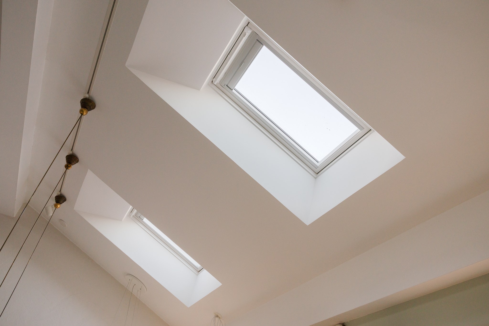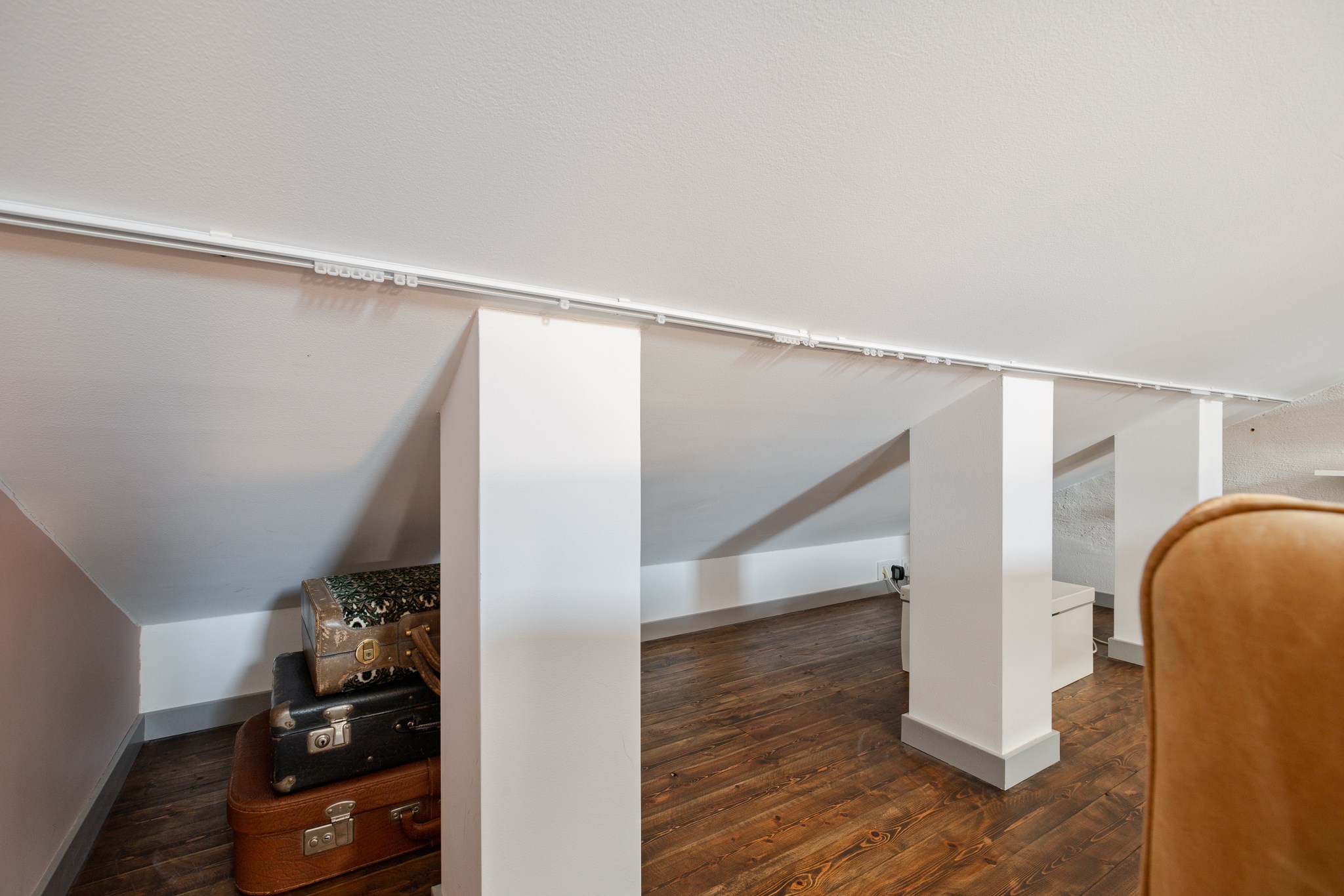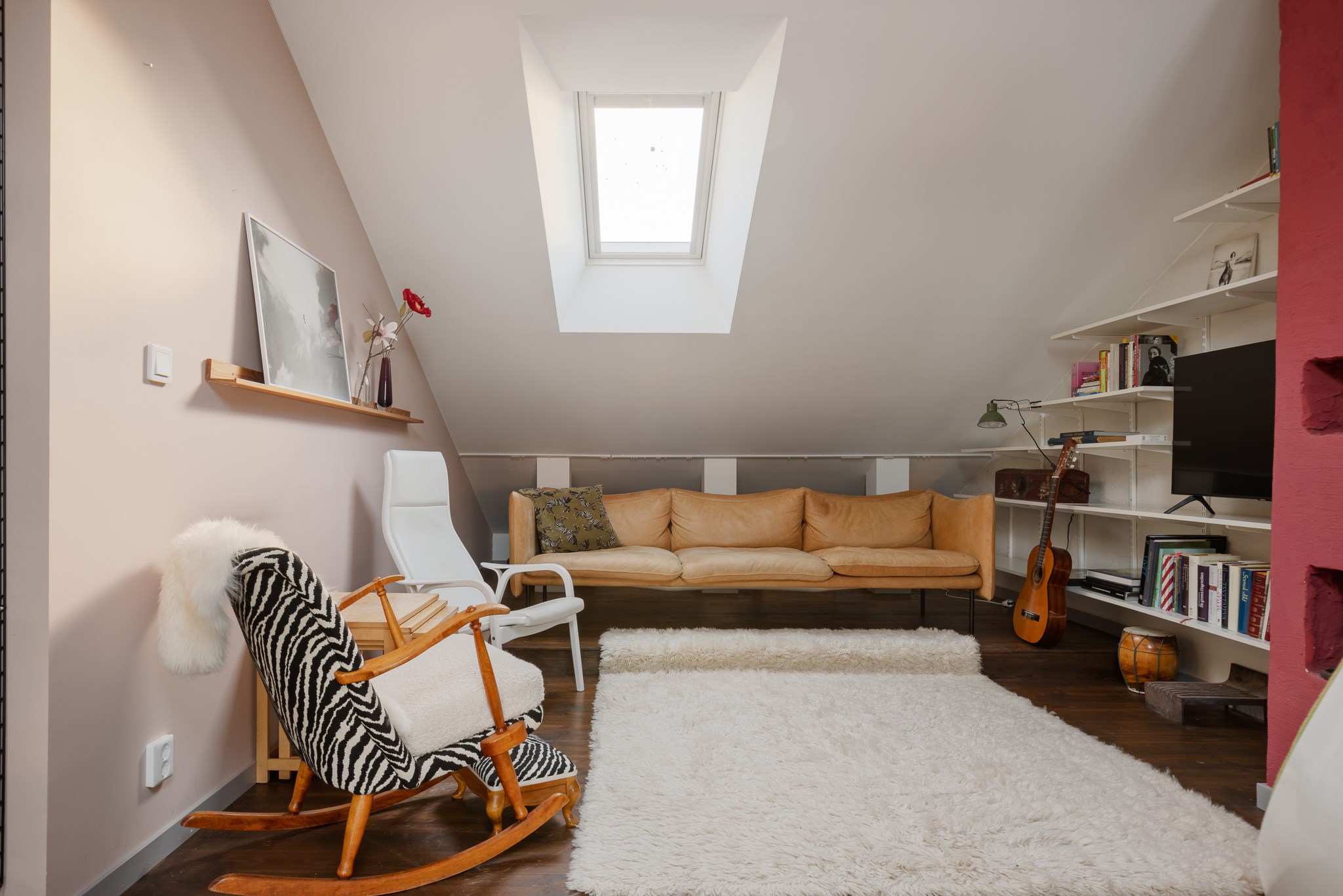 Generöst och luftigt vardagsrum med härlig rymd, takfönster och fint ljusinsläpp. Den öppna planlösningen tillsammans med snedtak skapar en unik karaktär med gott om plats för både soffgrupp och möblering. En vacker röd murstock blir ett arkitektoniskt inslag som ger rummet personlighet och värme. Takfönster från Velux, som smidigt styrs via fjärrkontroll, förstärker komforten. Övre planet erbjuder även praktiska förvaringsytor i kattvindar som diskret integreras i rummet.
