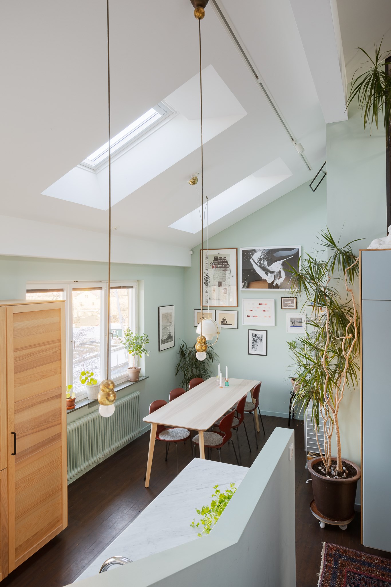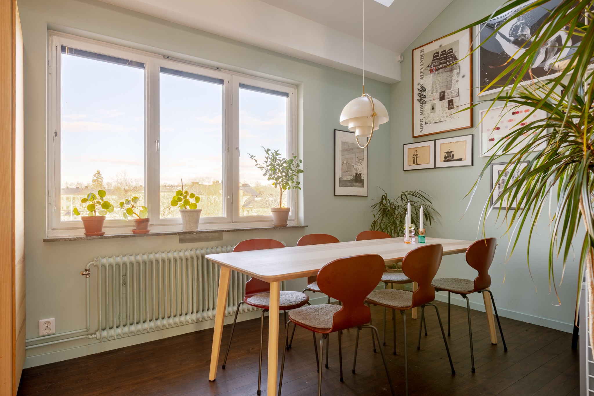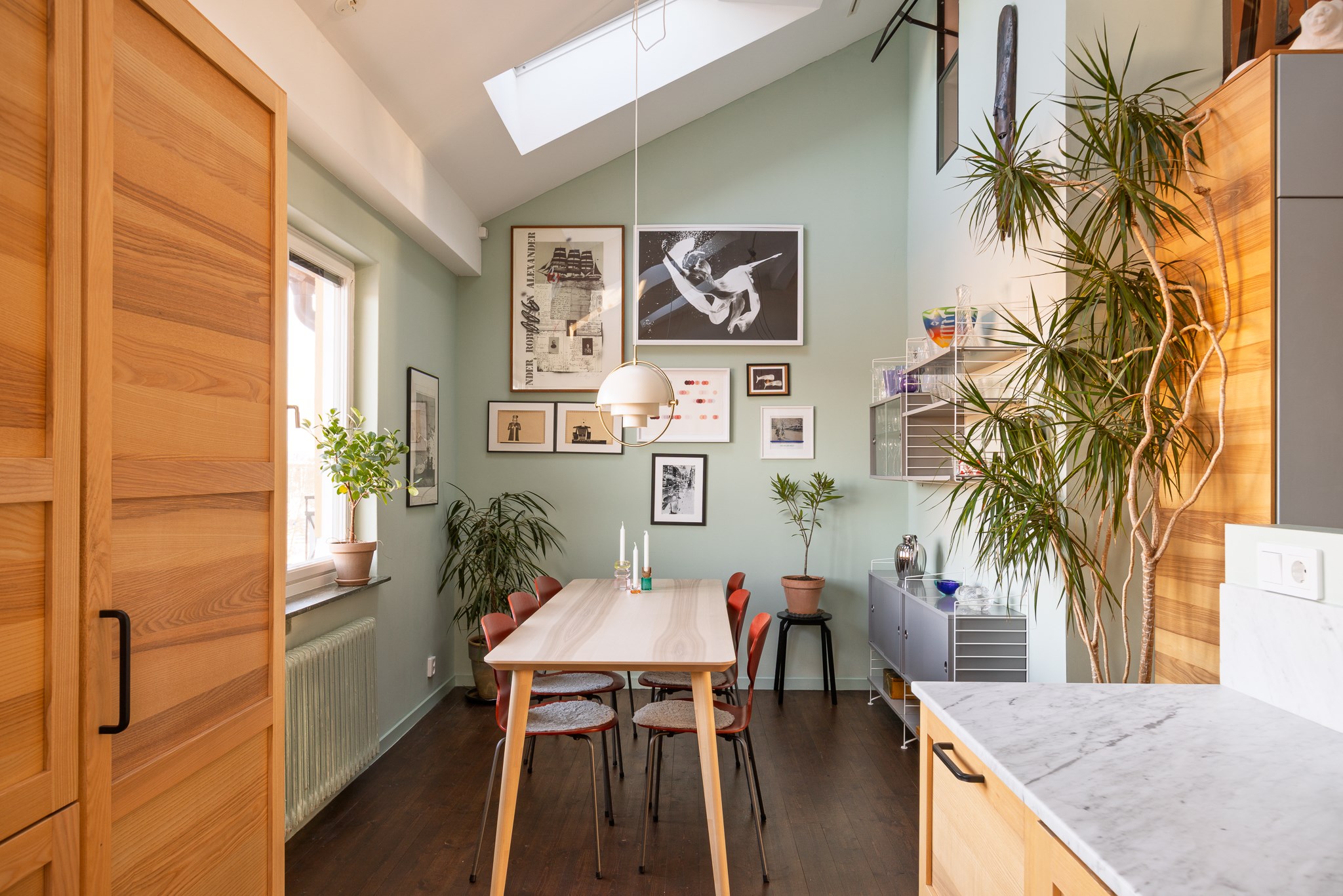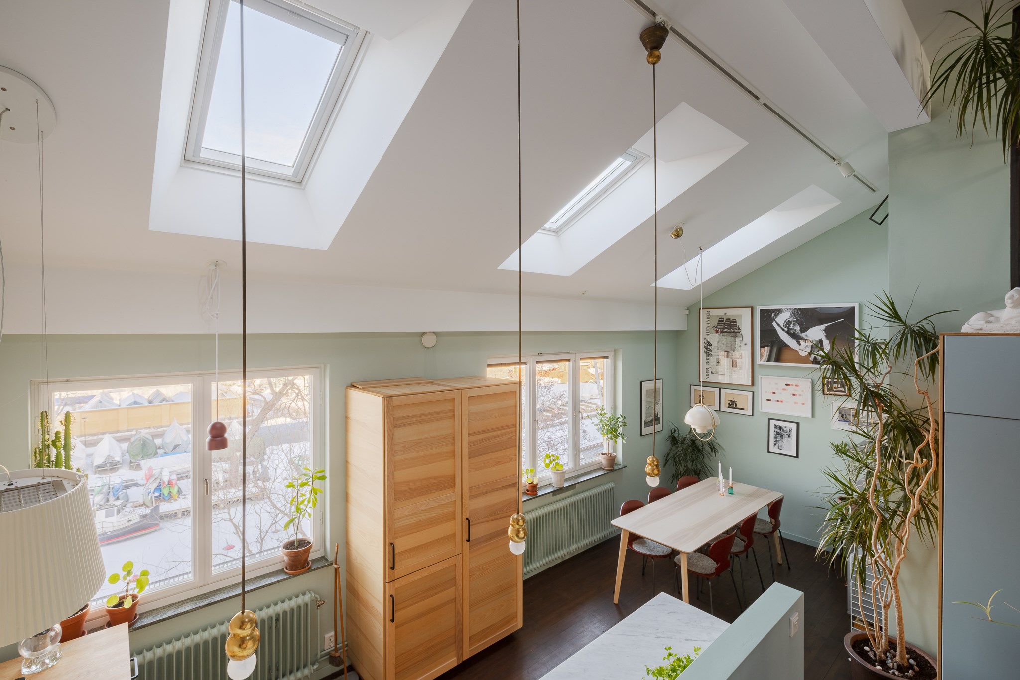 Intill fönstret finns en trivsam matplats med fri utsikt mot Pålsundet och Långholmen – en rogivande vy över vatten och grönska som ger köket en särskilt harmonisk atmosfär.