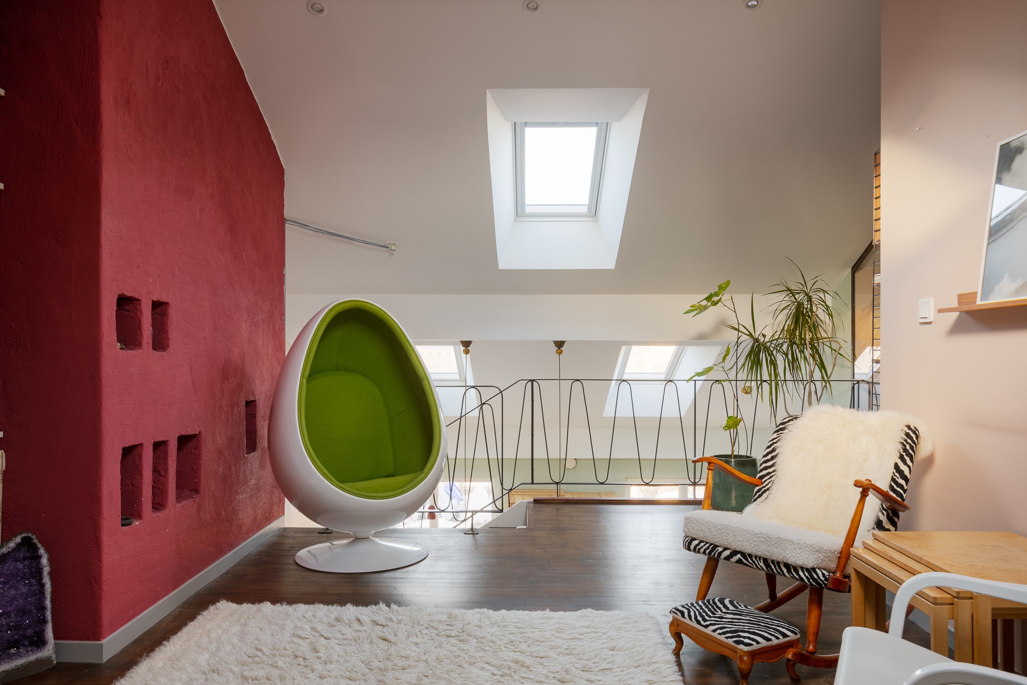 Sovrummet vetter mot Anders Reimers malmgård och har utgång till en solig balkong i söderläge med markis. En invändig trappa med smidesräcke i originalstil leder upp till övre plan där ett luftigt vardagsrum möter med vacker röd murstock, Velux-takfönster med fjärrstyrning och praktiska förvaringsytor i kattvindar. Intill ligger ett avskilt rum med industriglas och flera fönster – perfekt som extra sovrum, arbetsrum eller gästrum.