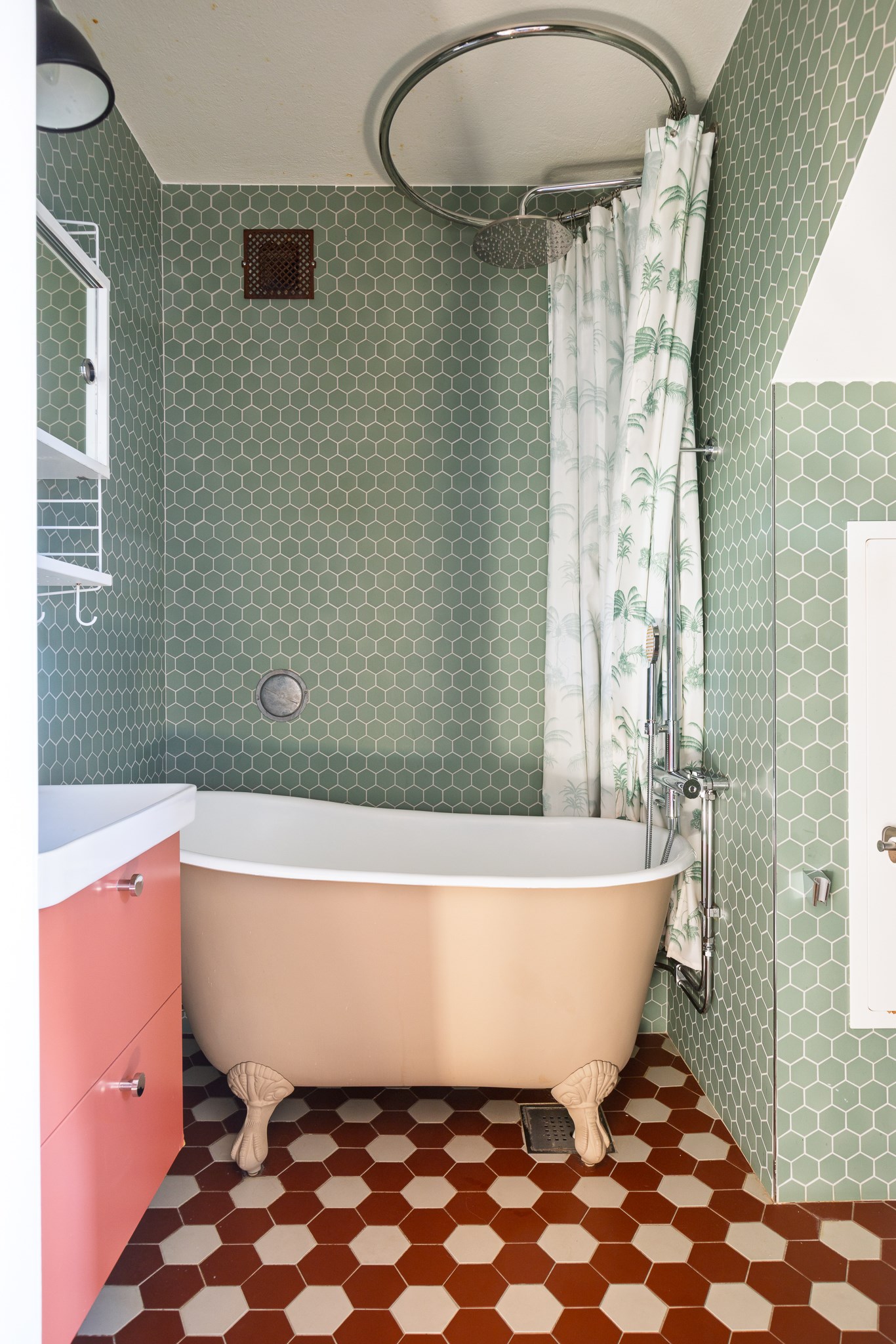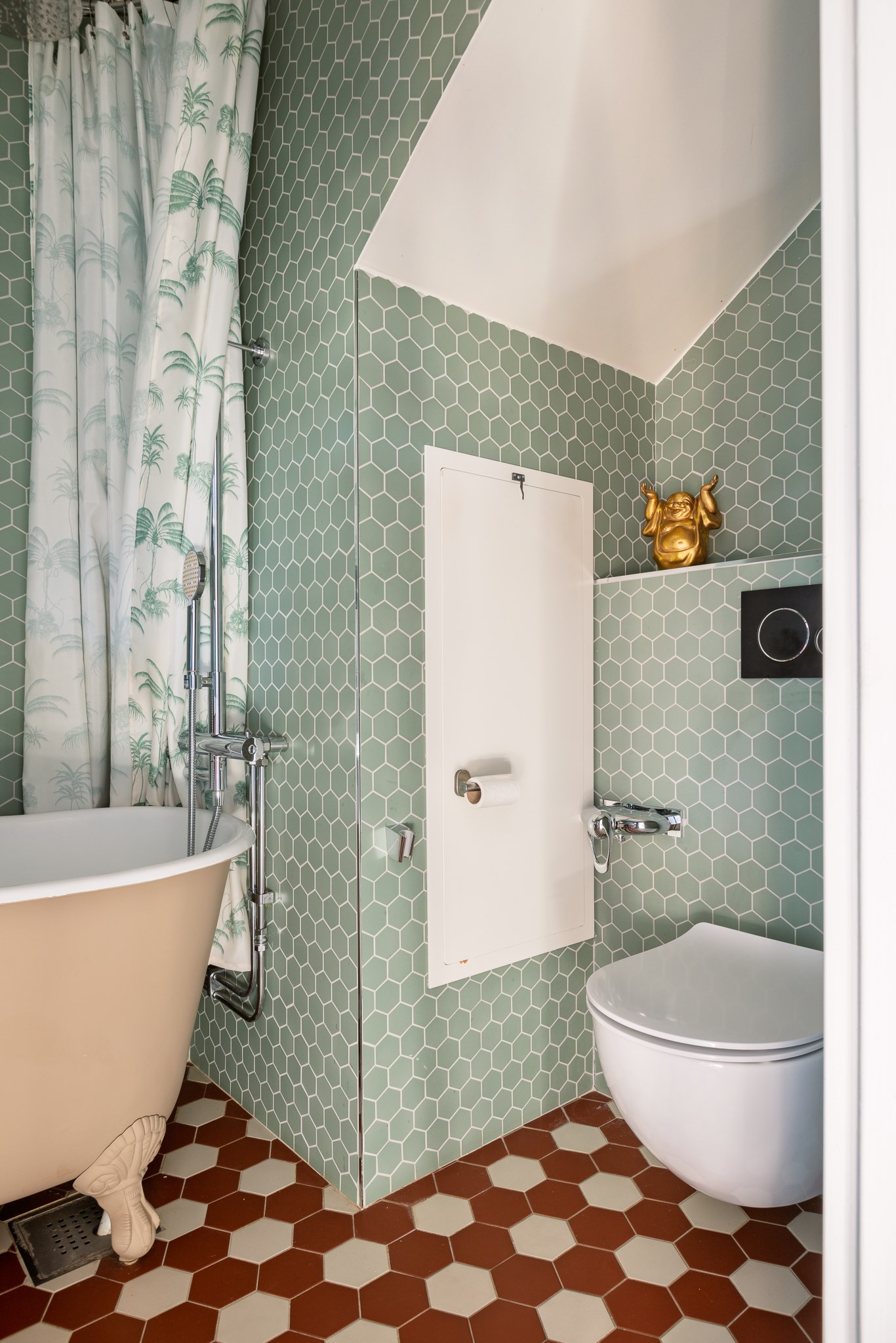 Stilfullt badrum med modern och personlig karaktär. Väggarna kläs av grönt kakel i elegant mönster som möter ett dekorativt klinkergolv i varma terrakottatoner. Här finns ett svensktillverkat badkar från XX med tassar och duschmöjlighet som ger rummet en klassisk känsla. Badrummet är utrustat med kommod, vägghängd toalett samt ett inbyggt skåp som erbjuder mycket bra förvaring. Ovan tvättstället sitter ett klassiskt spegelskåp i stringmodell som förstärker den stilrena och genomtänkta designen.