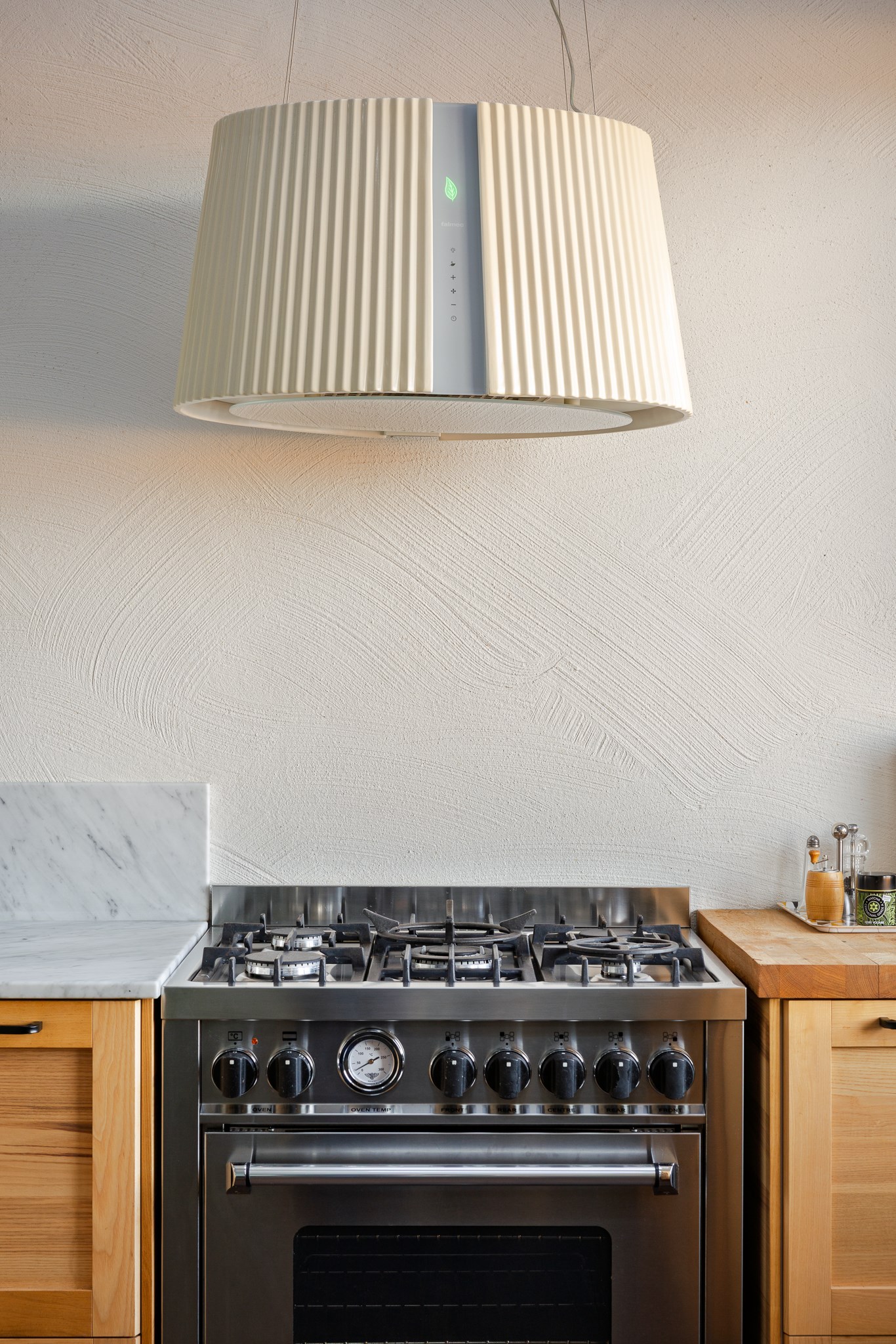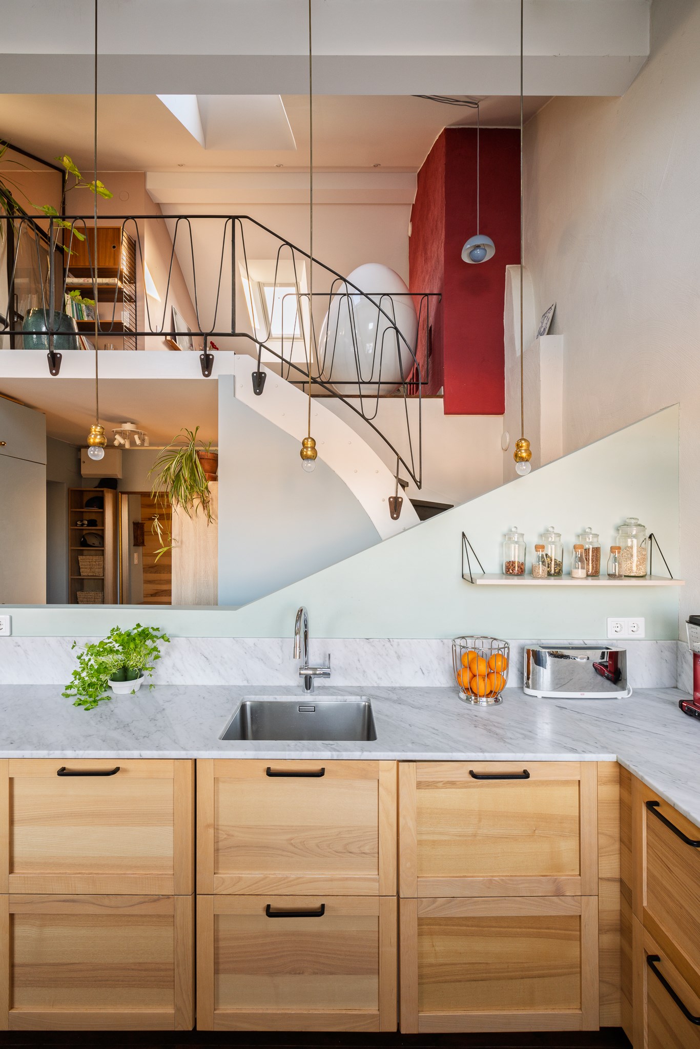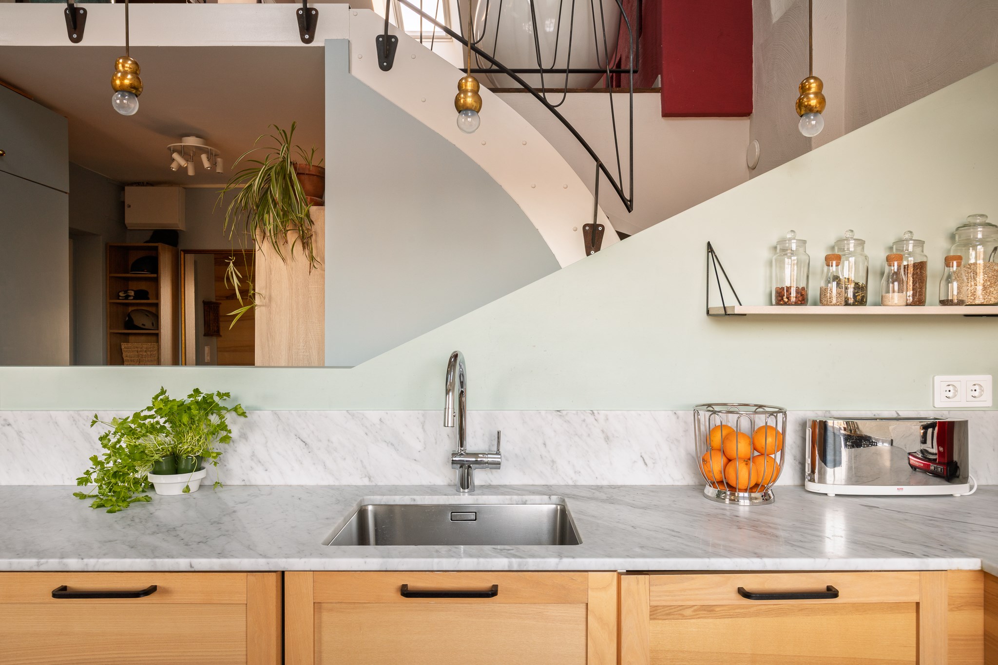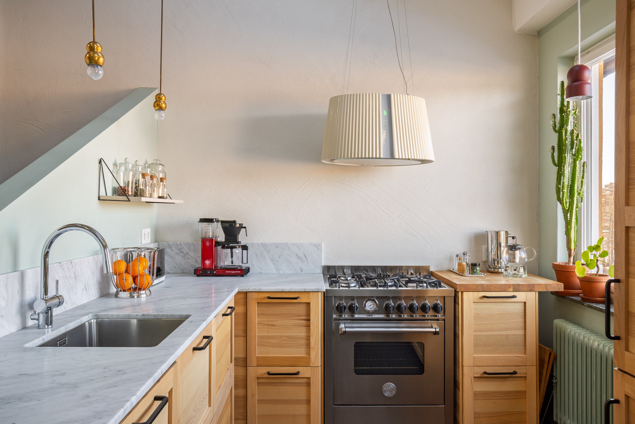 Det moderna köket är smakfullt utformat med släta luckor i ljus träton, svarta beslag och en ljus carrarabänkskiva som löper generöst längs arbetsytorna. Här möts design och funktion i en öppen planlösning med härlig rymd och takhöjd om ca XX meter. Tillsammans med takfönster och stora fönsterpartier skapas ett fantastiskt ljusflöde som ger rummet en luftig och inbjudande känsla. Köket är välutrustat med en gasspis från Bertazzoni samt en karaktärsfull designfläkt från franska XX som fungerar som ett elegant blickfång.