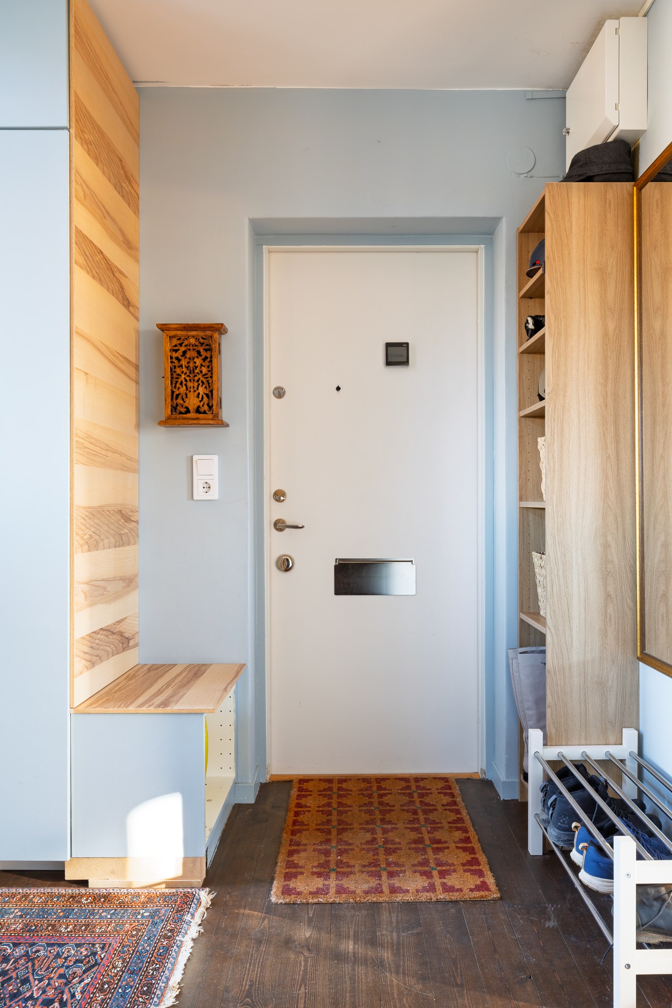 Välkomnande hall med genomtänkt och stilren förvaring i form av platsbyggda lösningar i varm träton. Öppna hyllplan kombineras med skjutdörrsgarderob i ribbad design som ger ett modernt och arkitektoniskt uttryck. Här finns gott om plats för ytterkläder, skor och förvaring i korgar, samtidigt som helheten upplevs luftig och harmonisk. Lägenheten är försedd med säkerhetsdörr.