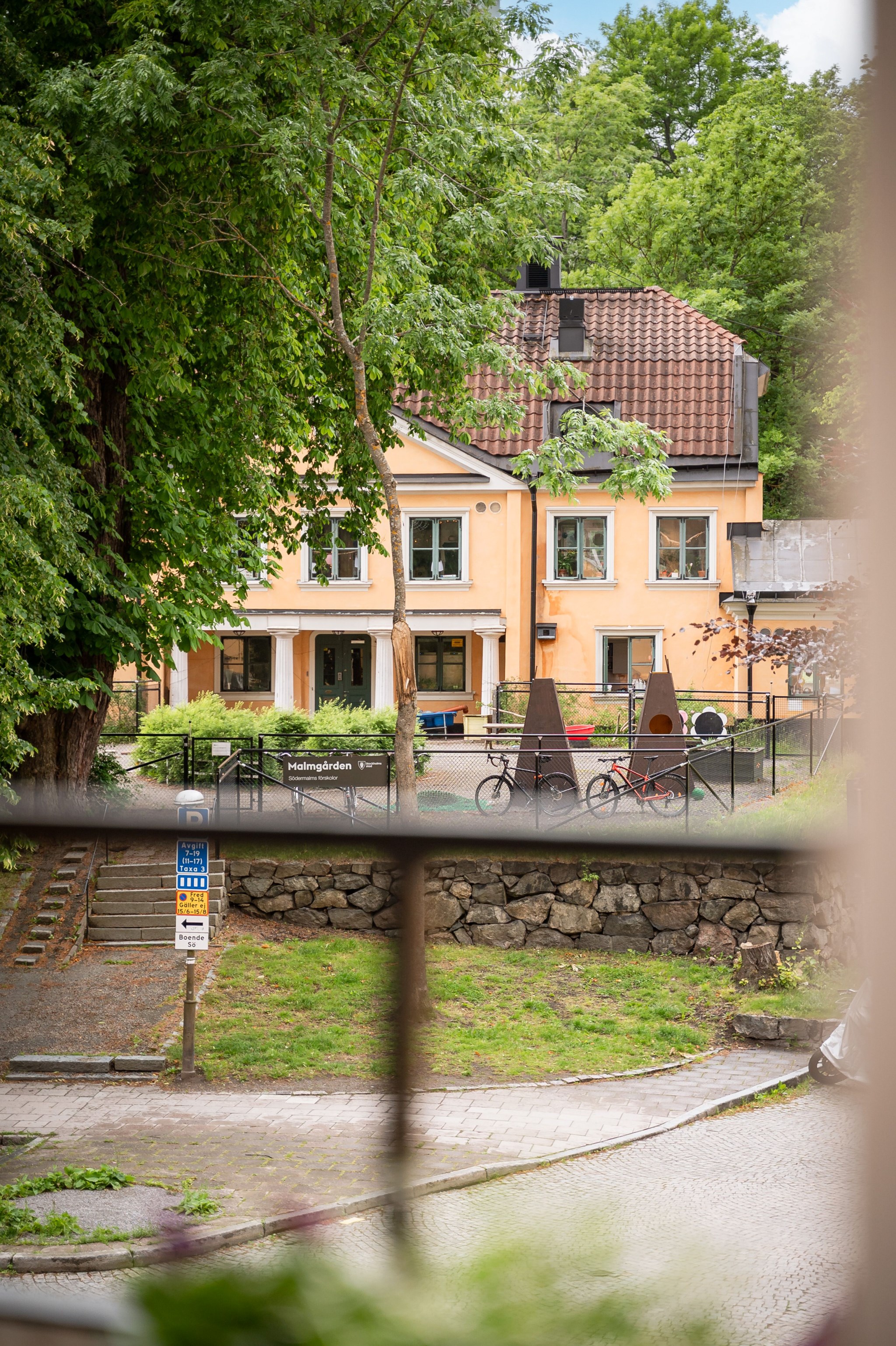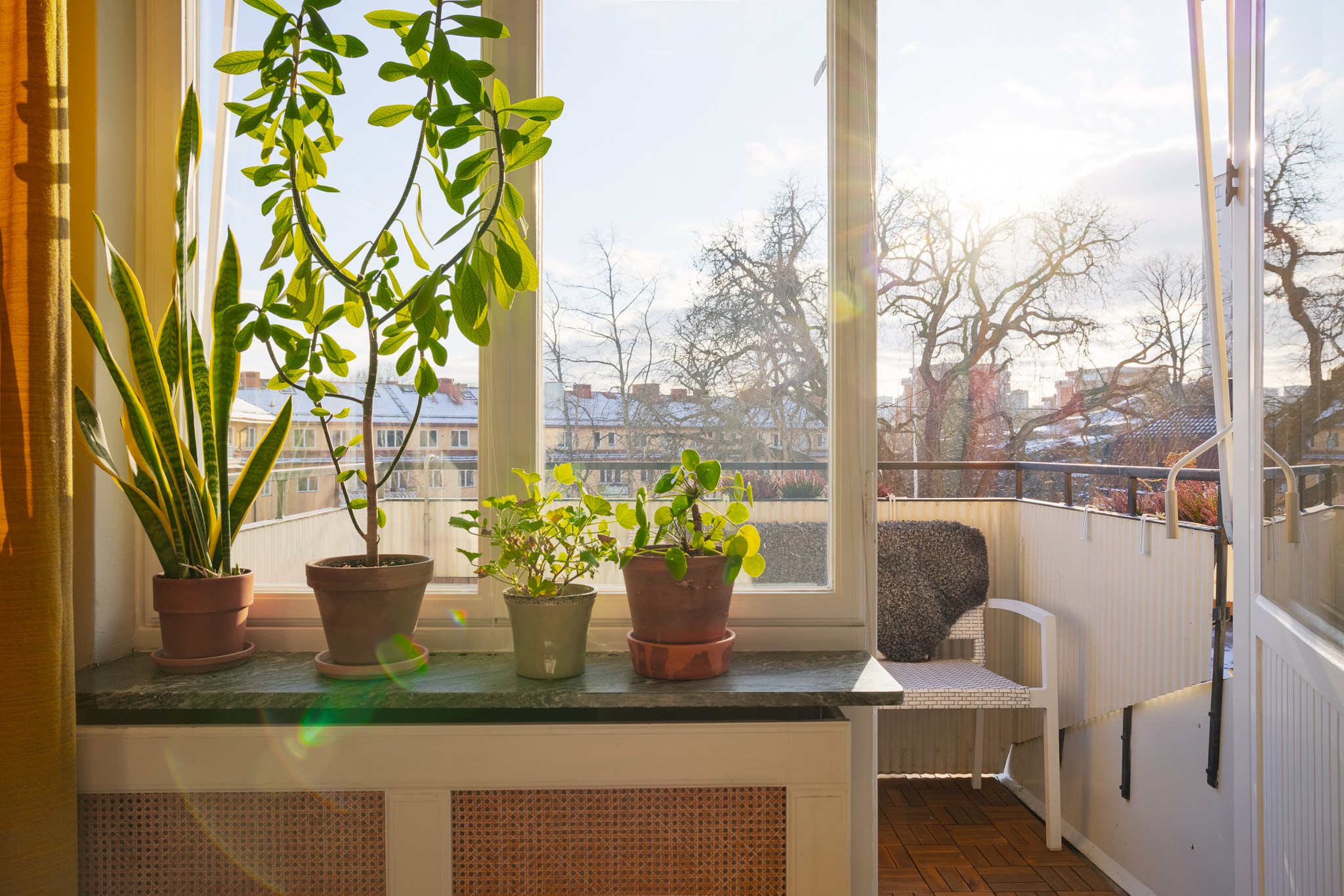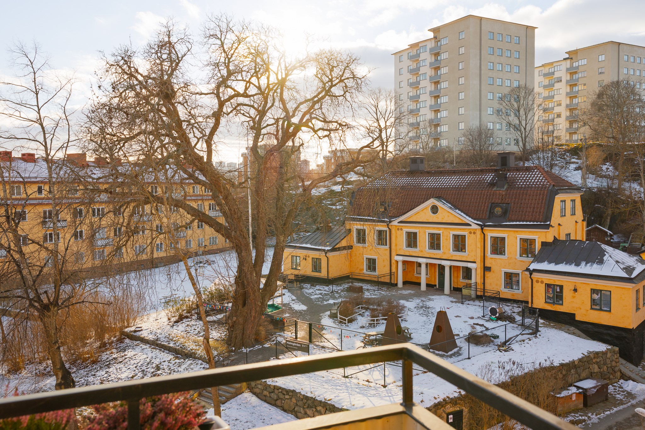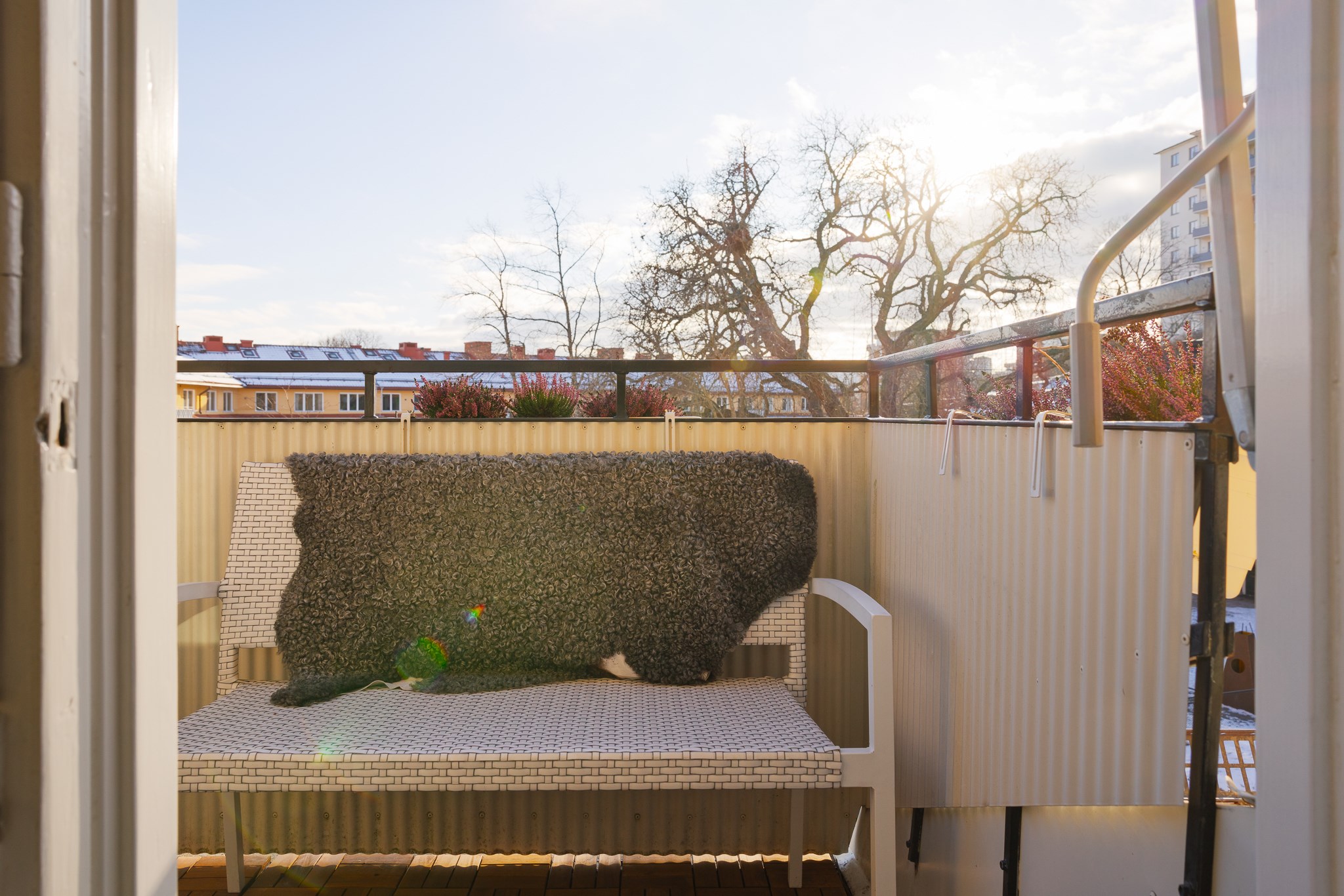 Solig balkong i söderläge med utsikt över Anders Reimers malmgård och grönskande omgivningar. Här finns plats för sittmöbler och en rofylld vy över charmig bebyggelse och trädtoppar. Balkongen är försedd med markis.