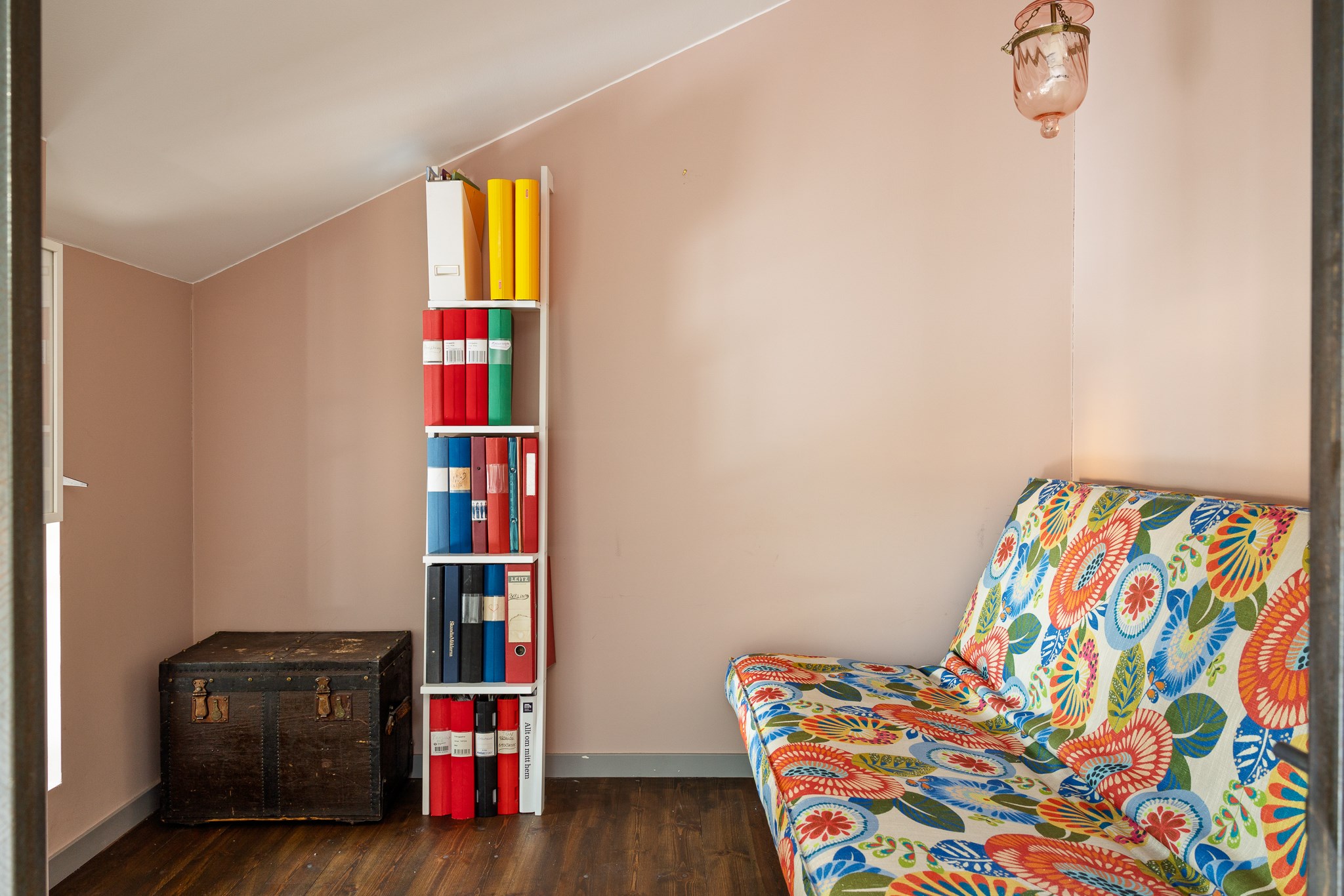 Avskilt och rofyllt rum på övre plan med fint ljusinsläpp från flera fönster. Rummet ramas in av stilfulla industriglaspartier som skapar en modern och luftig känsla samtidigt som det ger en tydlig rumsindelning. Här finns plats för säng, arbetsplats eller gästrum samt goda möjligheter till förvaring. Ett harmoniskt rum med ombonad atmosfär och flexibla användningsmöjligheter.
