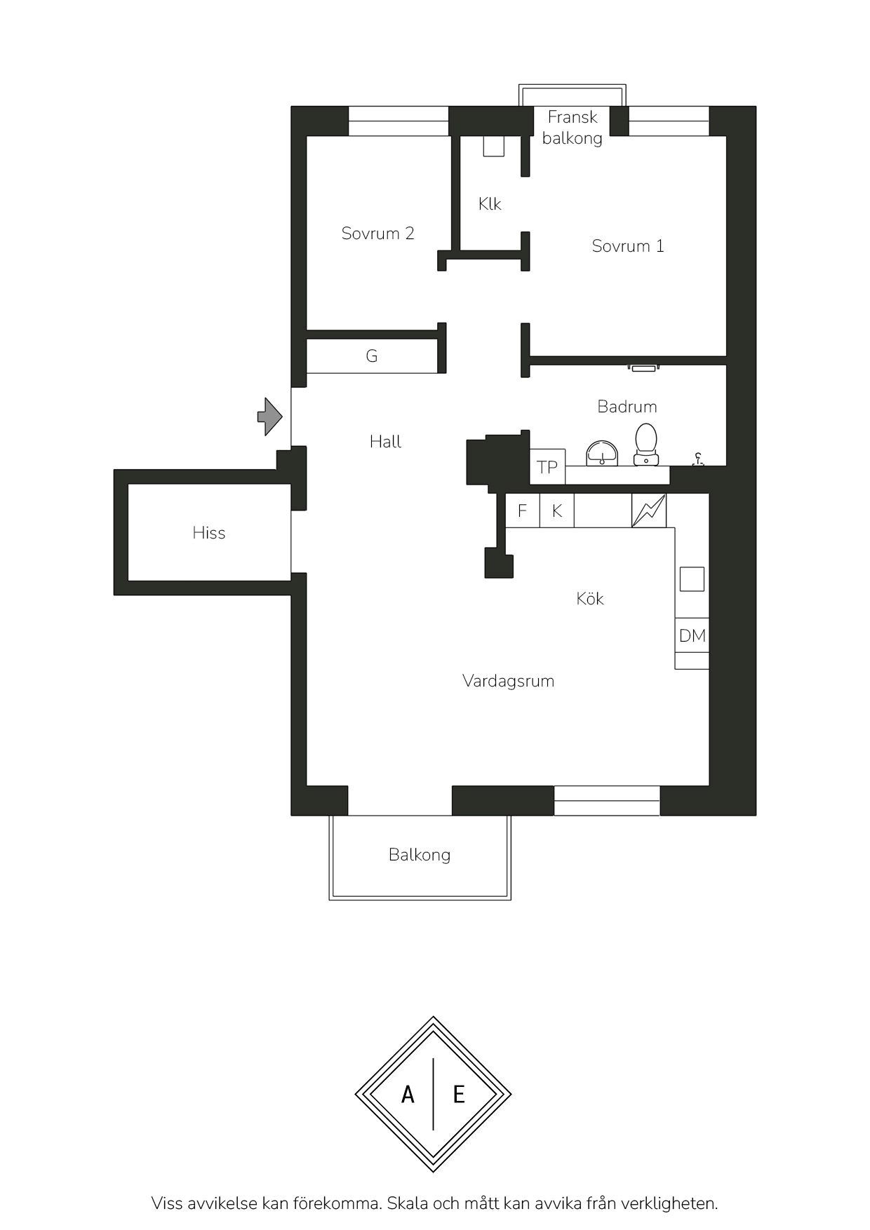Här finns två inbjudande sovrum, varav det ena med fransk balkong och morgonsol. Öppen planlösning mellan kök och vardagsrum gör hemmet idealiskt för både vardag och umgänge. Det rymliga, helkaklade badrummet är stilrent och utrustat med både tvättmaskin och torktumlare samt påkostat med golvvärme.