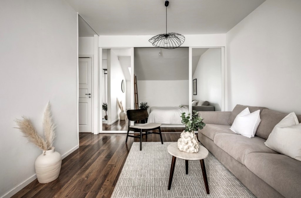 Trevligt vardagsrum med ljusa ytskikt och parkettgolv för en hemtrevlig känsla. Ett fint fönsterparti släpper in generöst med ljus och tillsammans med det charmiga snedtaket ges rummet extra karaktär. Här finns gott om plats för en soffgrupp, annan personlig inredning samt en trivsam matplats intill fönstret. Sovalkov finns med plats för större säng för avskildhet.