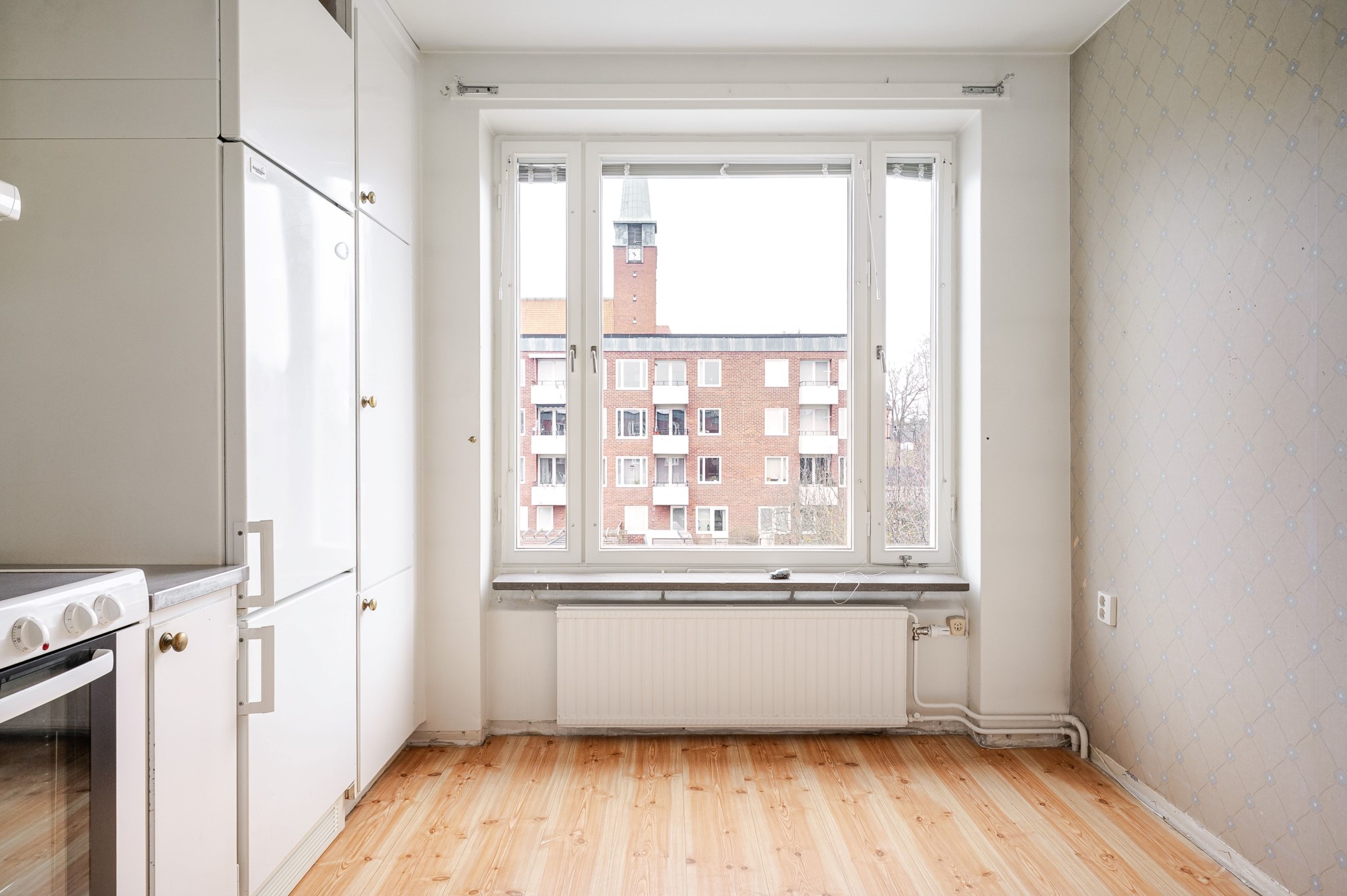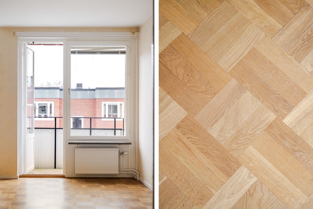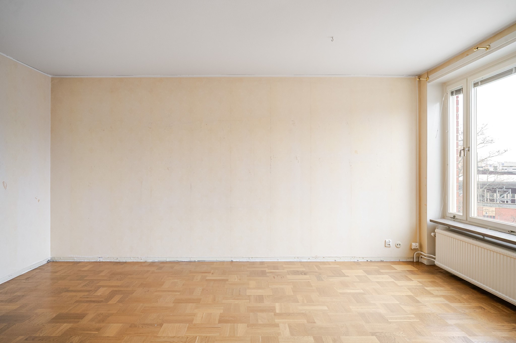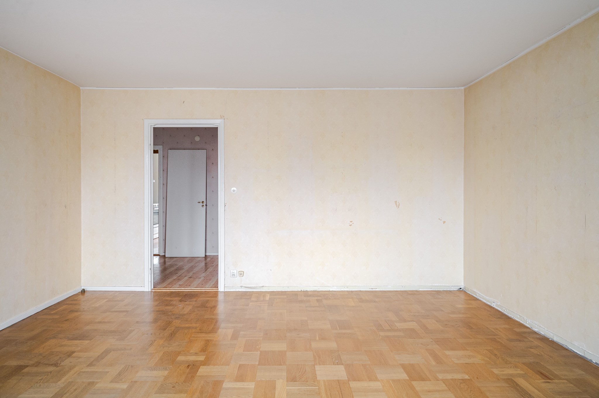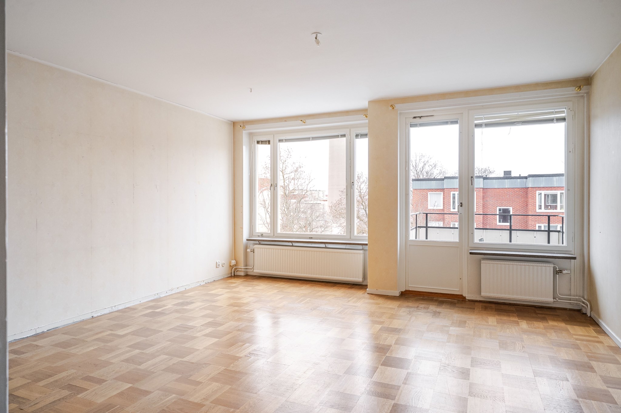 Ljust vardagsrum med tapetserade väggar och originellt parkettgolv. Fint ljusinsläpp från stora fönsterpartier varav ett kombinerat med balkongöppning. Plats för soffa, matgrupp och annan möblering efter behov och smak.