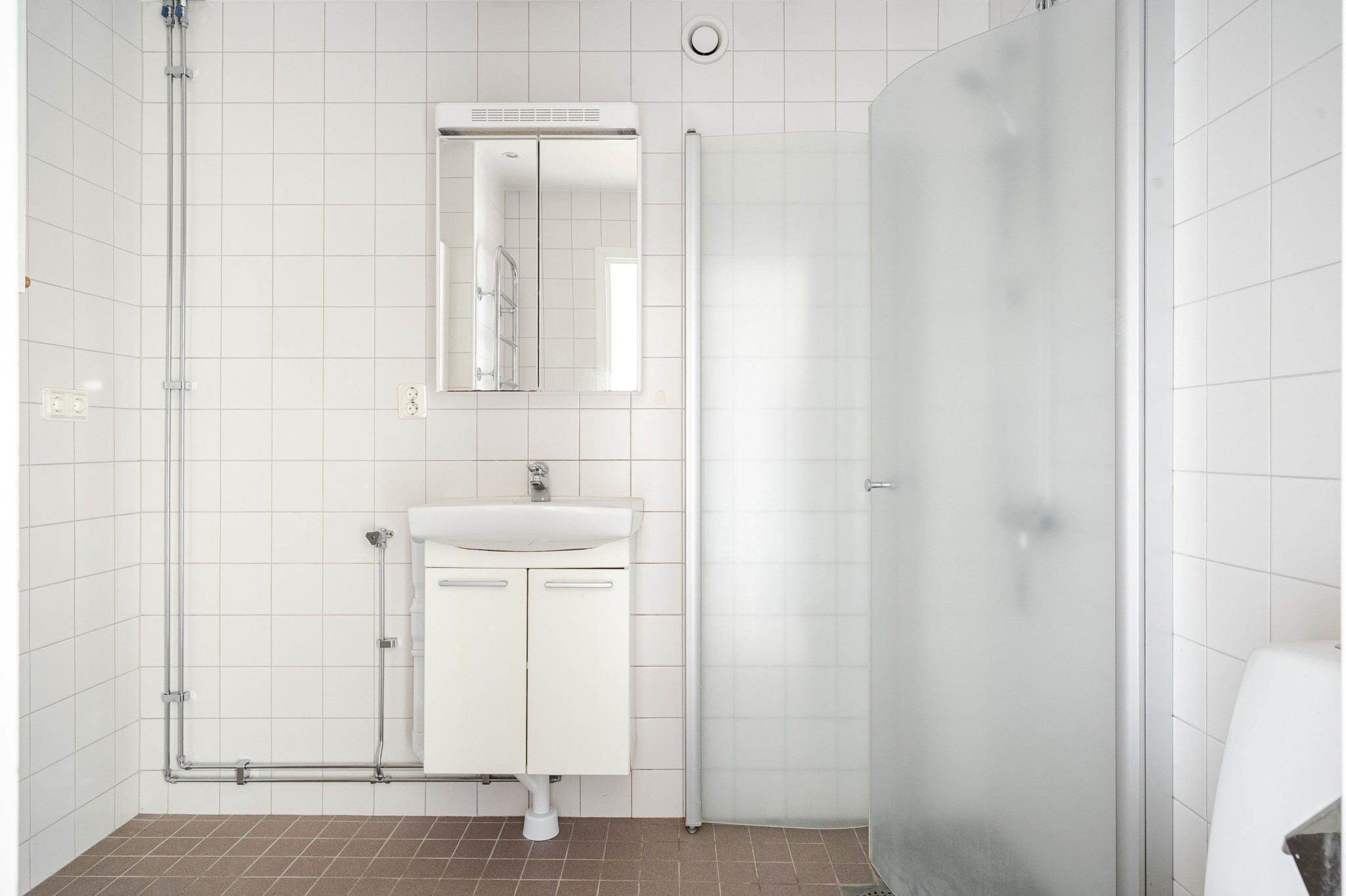 Stambytt badrum med ljust kakel och mörkt klinkergolv. Badrummet är utrustat med WC, handfat med kommod, spegelskåp, dusch och tvättmaskin.