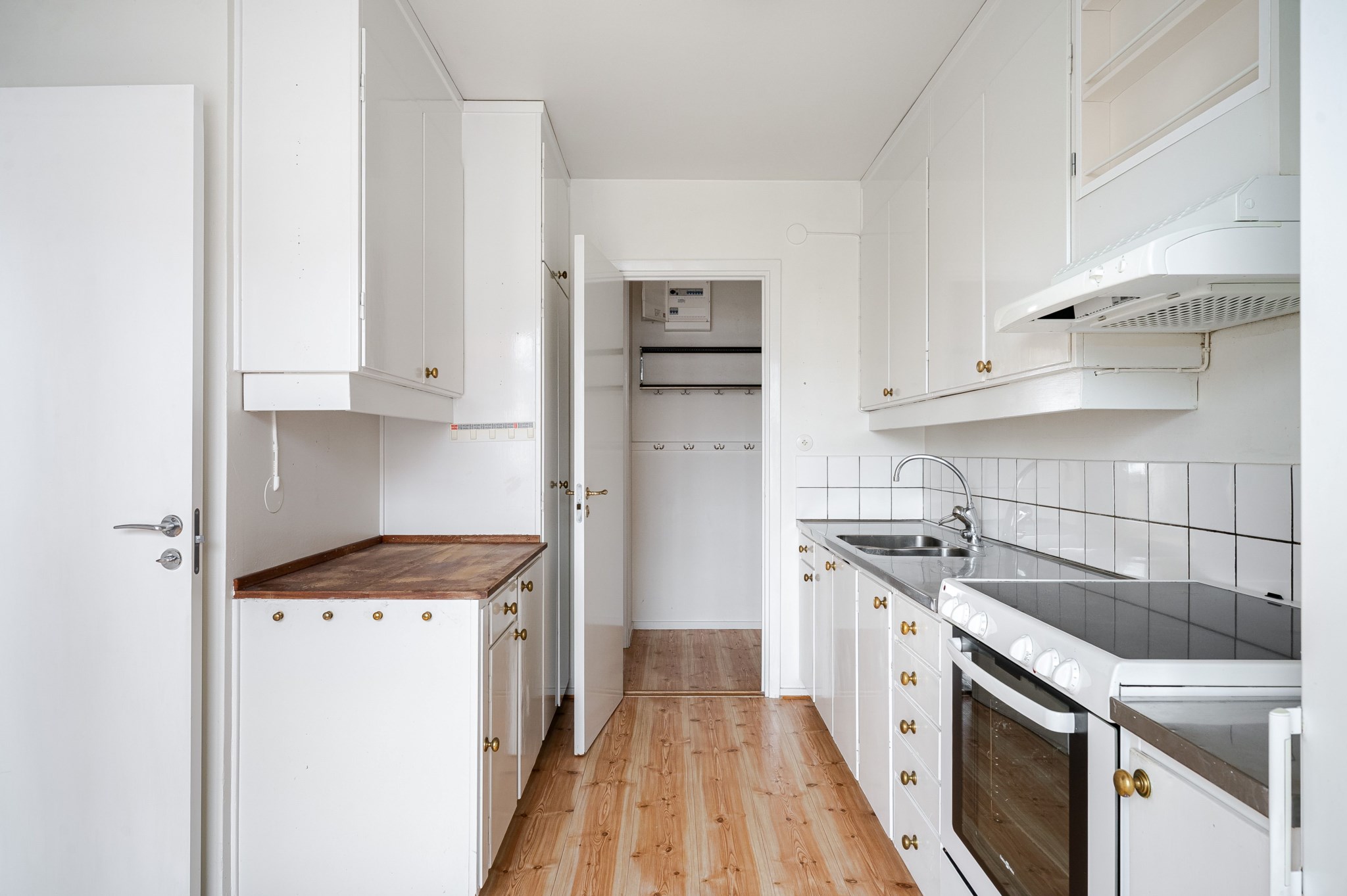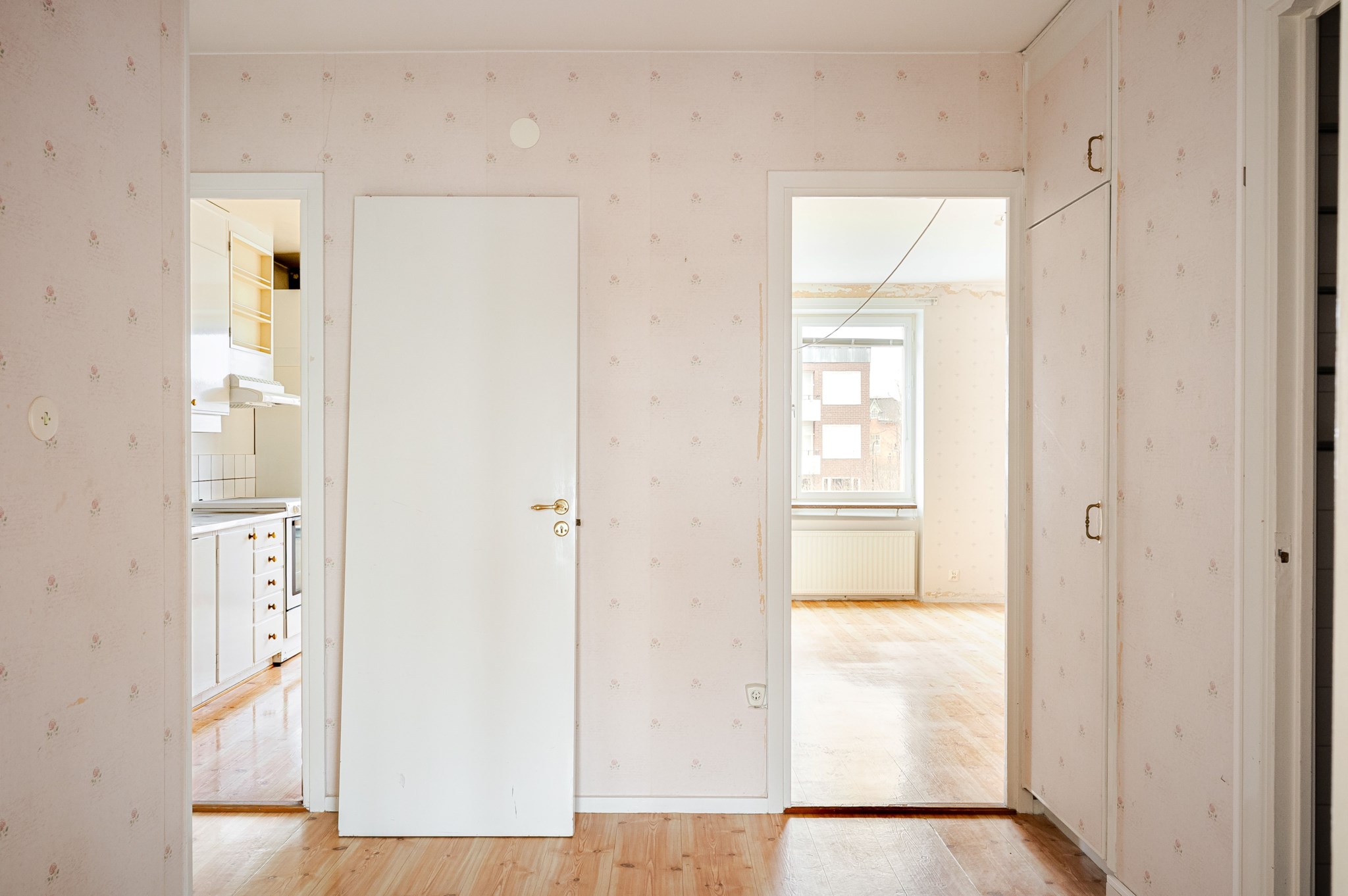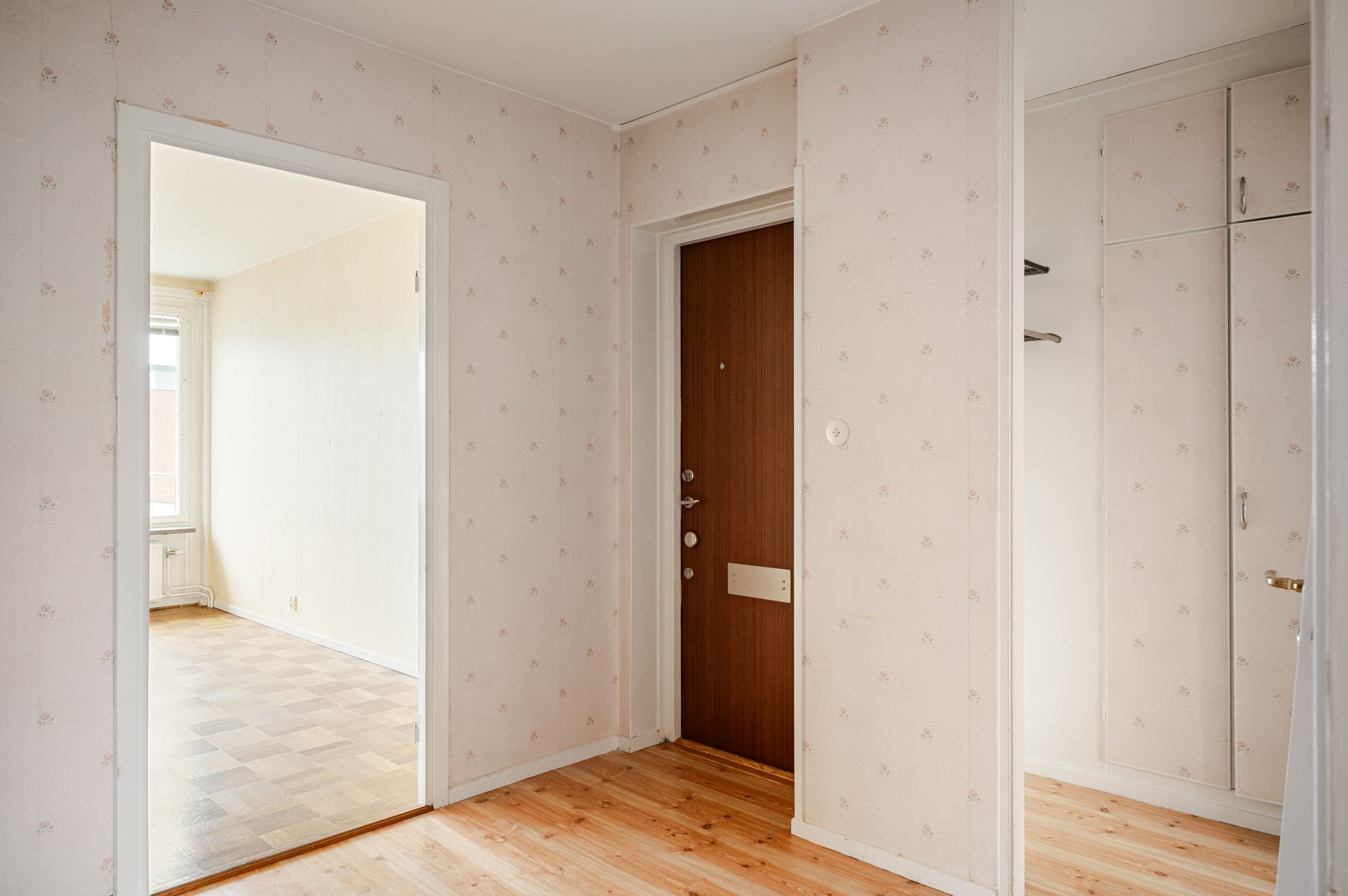Rymlig hall med tapetserade väggar och ljust golv. Möjlighet till avhängning av ytterkläder och skor finns intill entrén samt ytterligare förvaring i flertalet garderober.