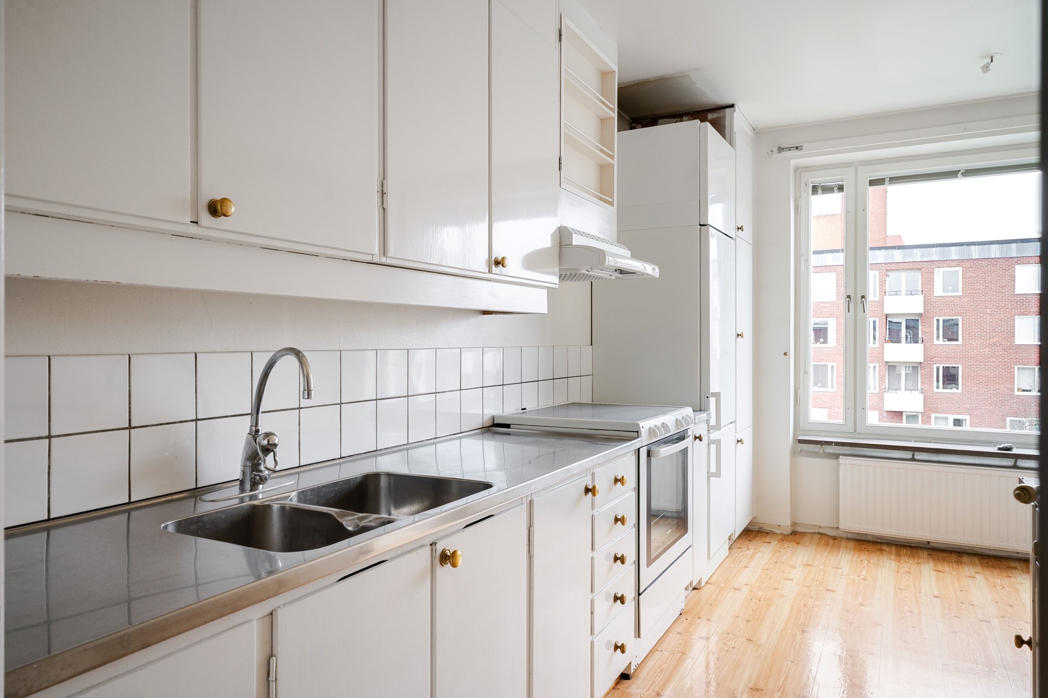 Kök med ljusa väggar och ljust golv. Naturligt ljusinsläpp från stort fönsterparti placerat intill kökets matplats. Köksluckorna är lackade i en mörk kulör, bänkskivan i rostfritt stål och väggpanelen delvis klädd i vitt kakel. Kökets maskinella utrustning består av kyl/frys, gasspis och ugn.