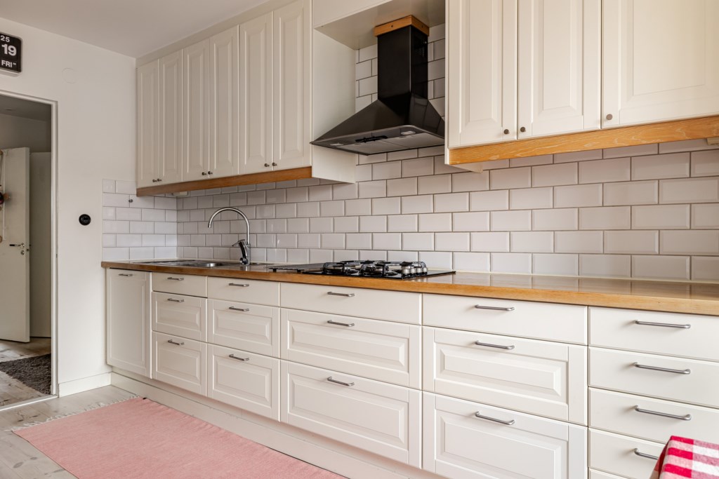 Klassiskt och stilrent kök där en trevlig matplats är placerad intill ett stort fönsterparti som ger rummet ett generöst och naturligt ljusinsläpp. De ljusa skåpsfronterna med ram samspelar fint med den vita kaklade väggpanelen och den matchande arbetsbänken i trä, vilket skapar en tidlös helhet. Köket är fullt utrustat med kyl/frys, gasspis, fläkt, mikro, ugn och diskmaskin. Ljusa ytskikt och ett ljust golv.