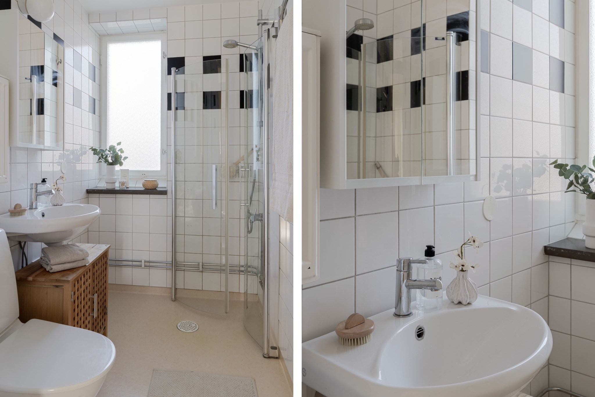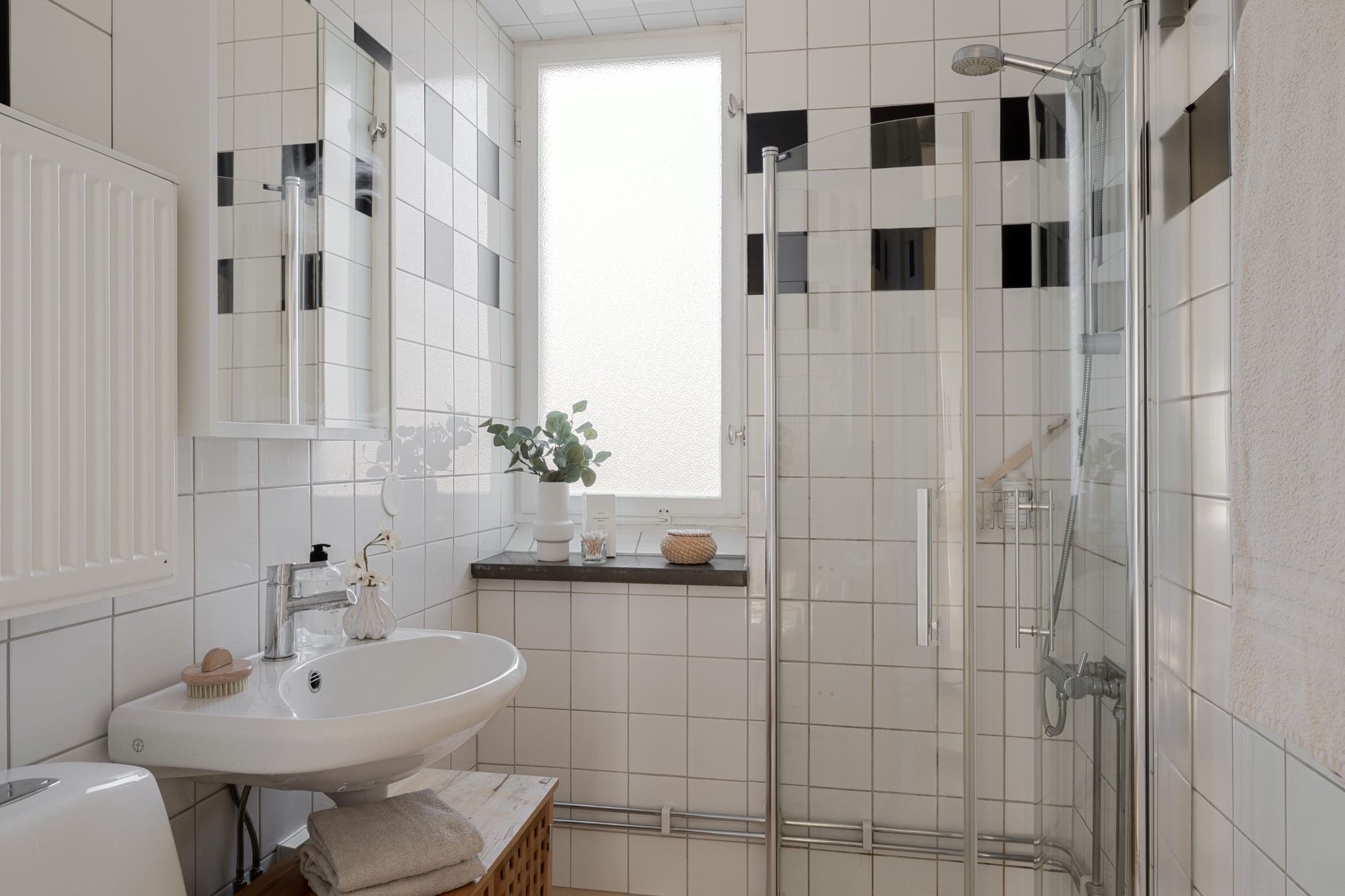 Badrum med kaklade väggar och ljust golv samt ett fönster som tillför naturligt ljus och möjliggör vädring. Badrummet är inrett med wc, handfat, spegelskåp samt dusch med infällbara duschväggar i klarglas.
