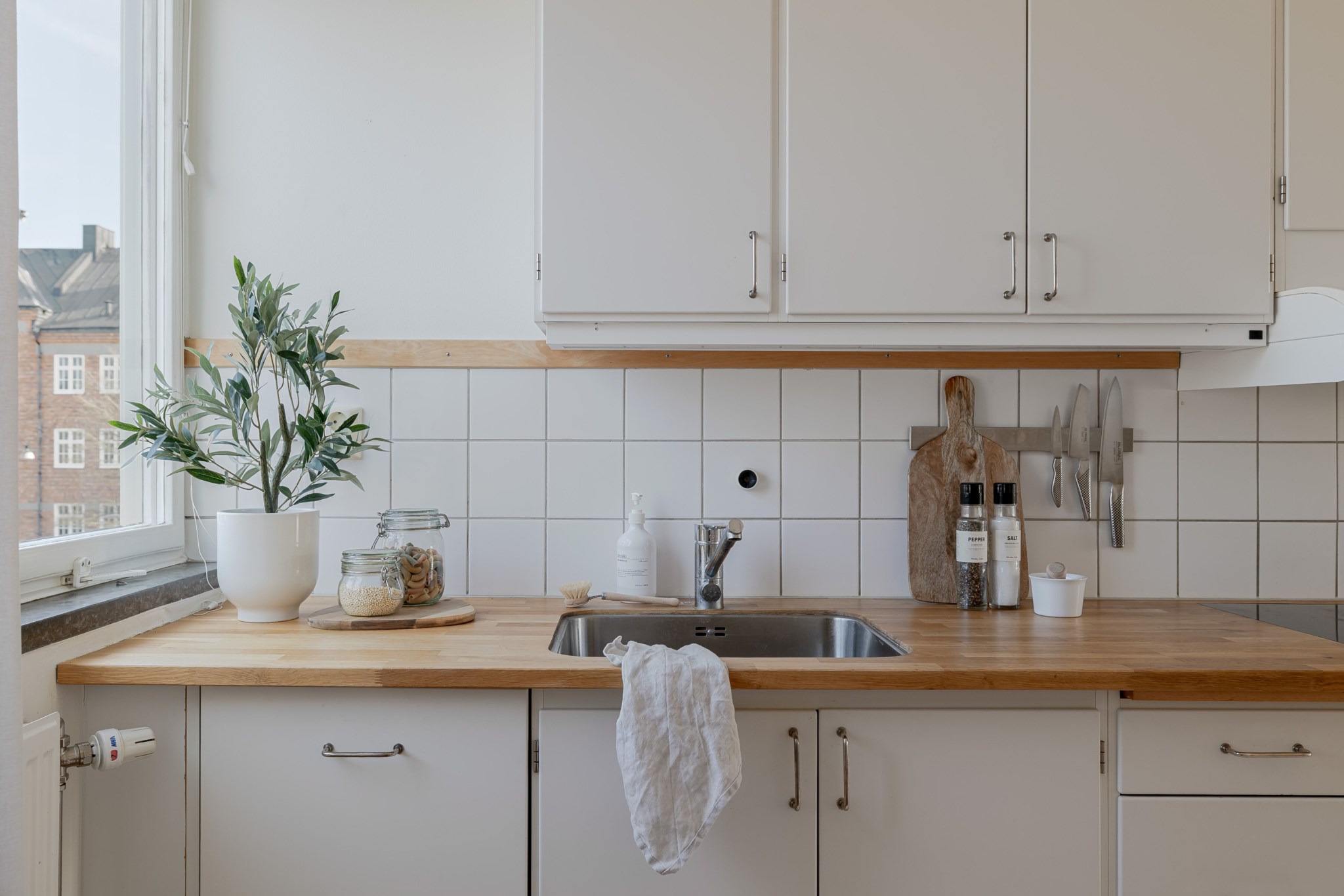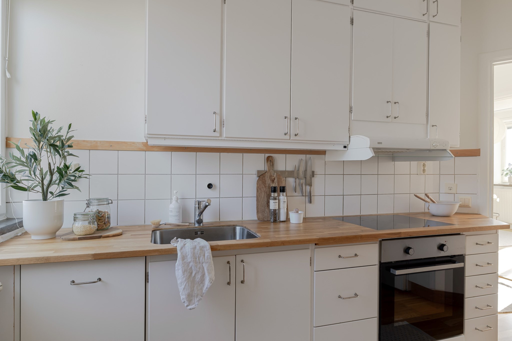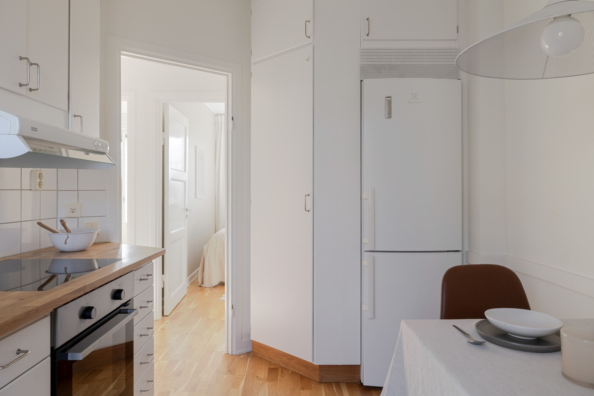 Trivsamt kök med ljusmålade ytskikt och parkettgolv. Fint ljusinsläpp från fönster och naturlig plats för matbord. Köket är inrett med ljusa skåpsfronter, vit kaklad väggpanel och matchande bänkskiva i trä. Den maskinella utrustningen består av kyl/frys, spishäll, fläkt, ugn och diskmaskin. Goda förvaringsmöjligheter i köksskåp.
