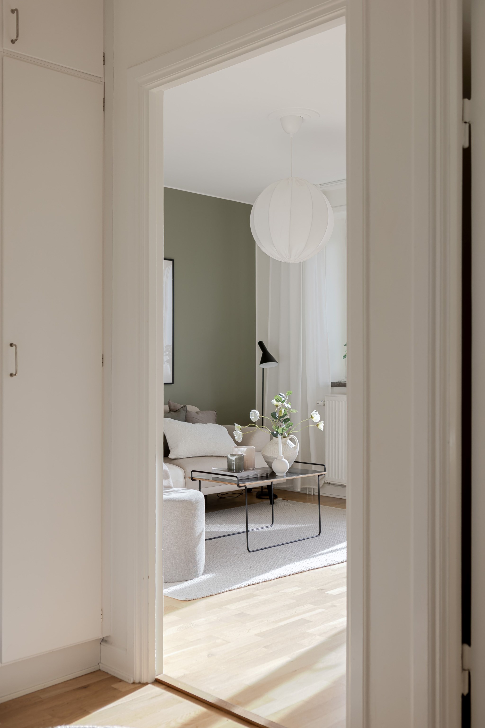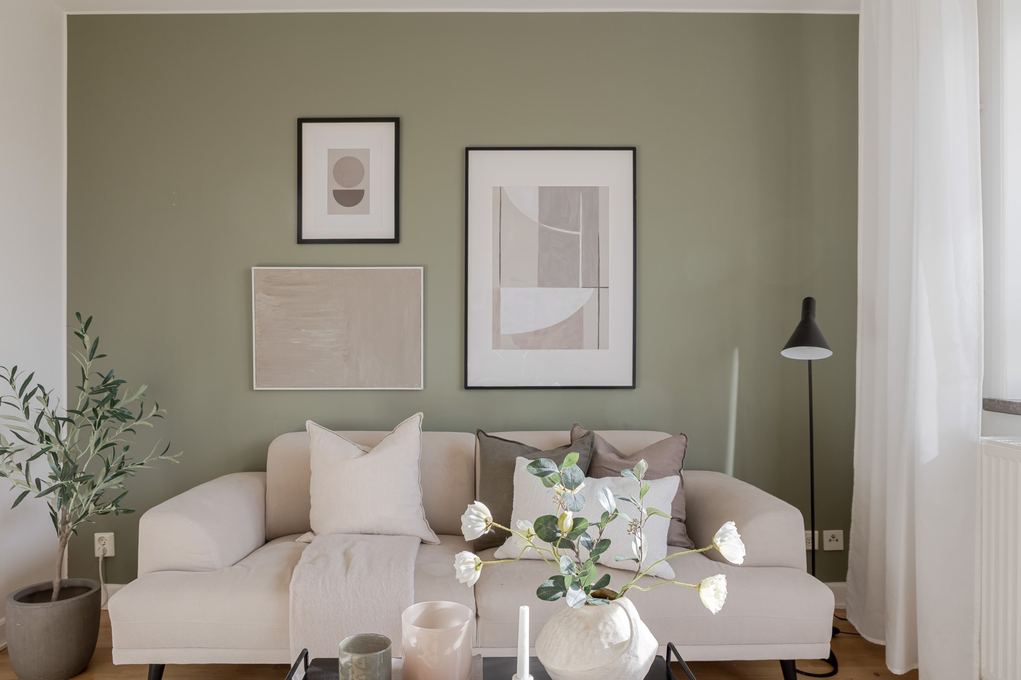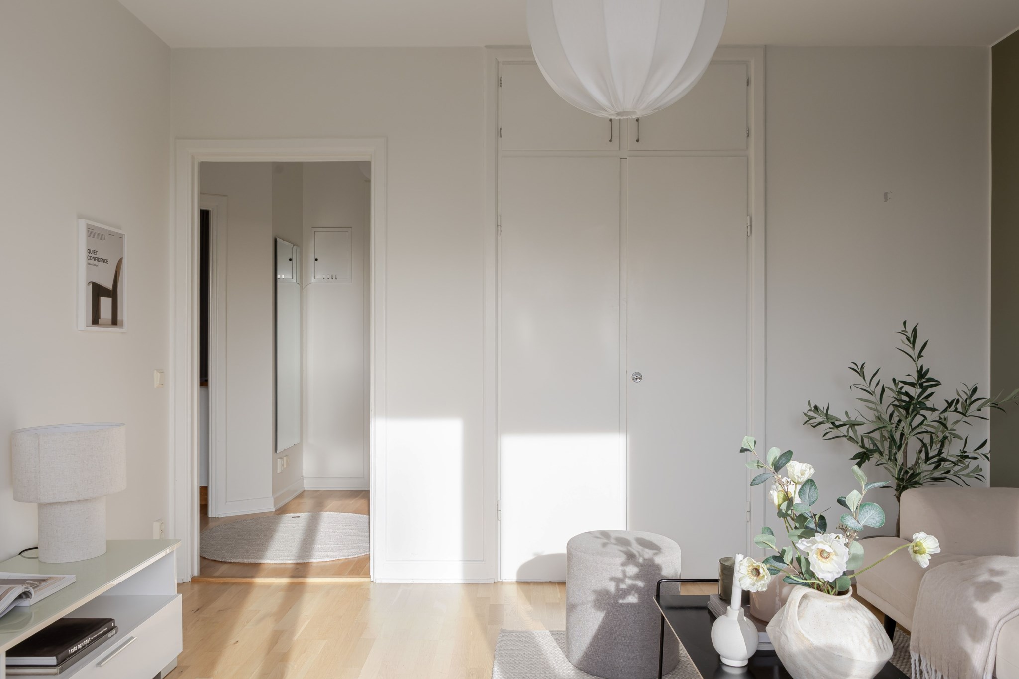 Inbjudande vardagsrum med ljusmålade ytskikt kombinerat med en fondvägg i grön kulör samt parkettgolv. Här finns plats för soffgrupp, övrigt möblemang och personlig inredning. God förvaring erbjuds i platsbyggda garderober med överskåp. Utgång till bostadens balkong förlänger rummet under de varmare månaderna.