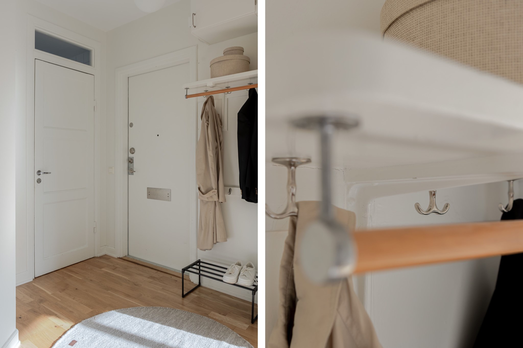 Rymlig och välkomnande hall med ljusmålade ytskikt och parkettgolv. Hatthylla möjliggör smidig avhängning av ytterkläder och skor samt ytterligare förvaring finns i garderob med överskåp.