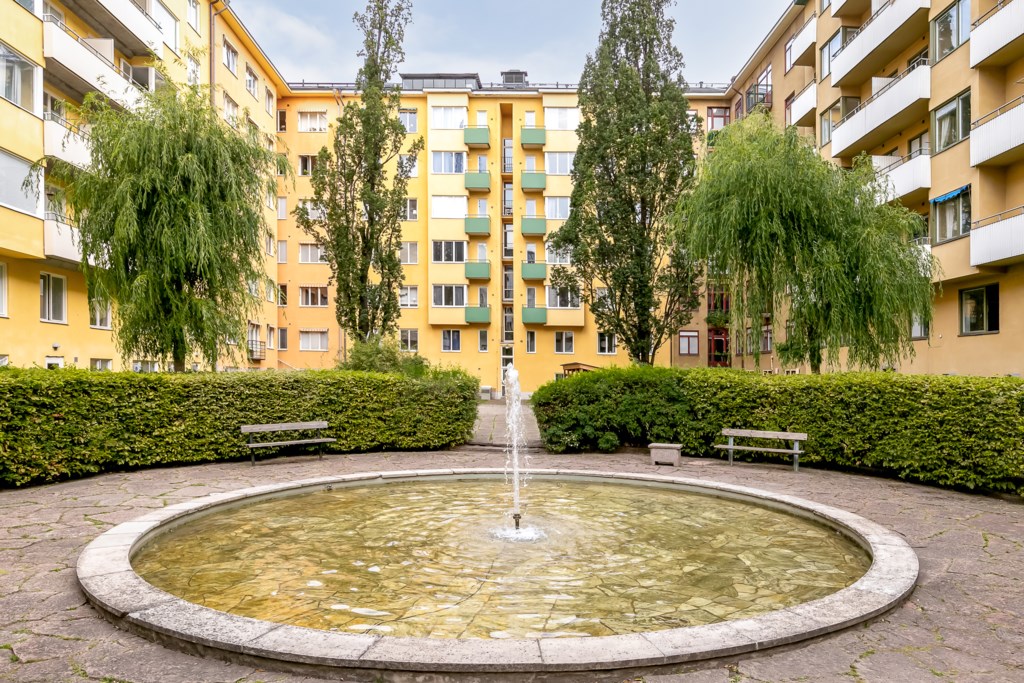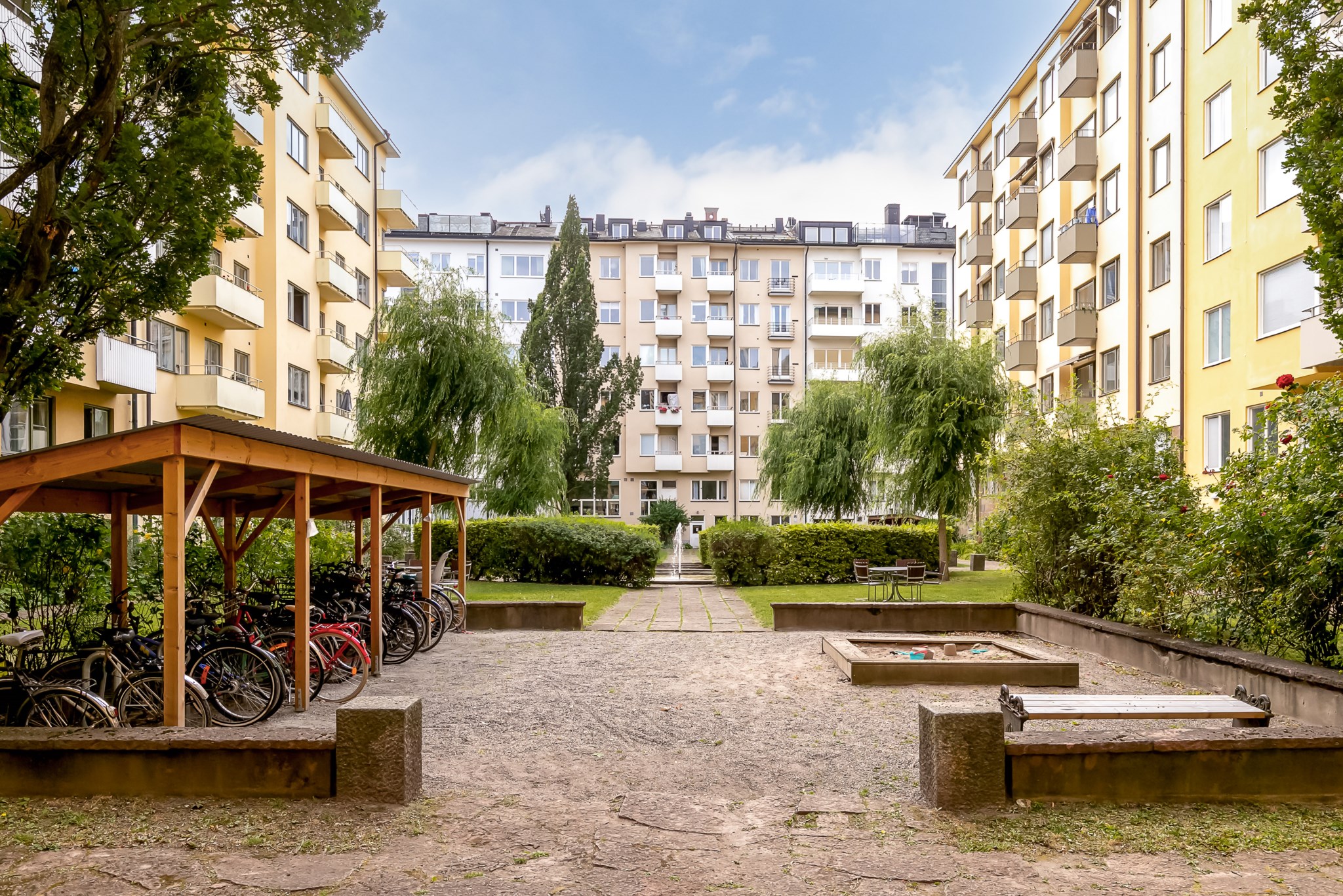 I fastigheten finns cykelförråd och tvättstuga. Gemensam takterrass i sydvästläge med fantastisk utsikt över hustaken. Här finns utemöbler och tillgång till grill. Gemensam grönskande innergård med rogivande fontän.