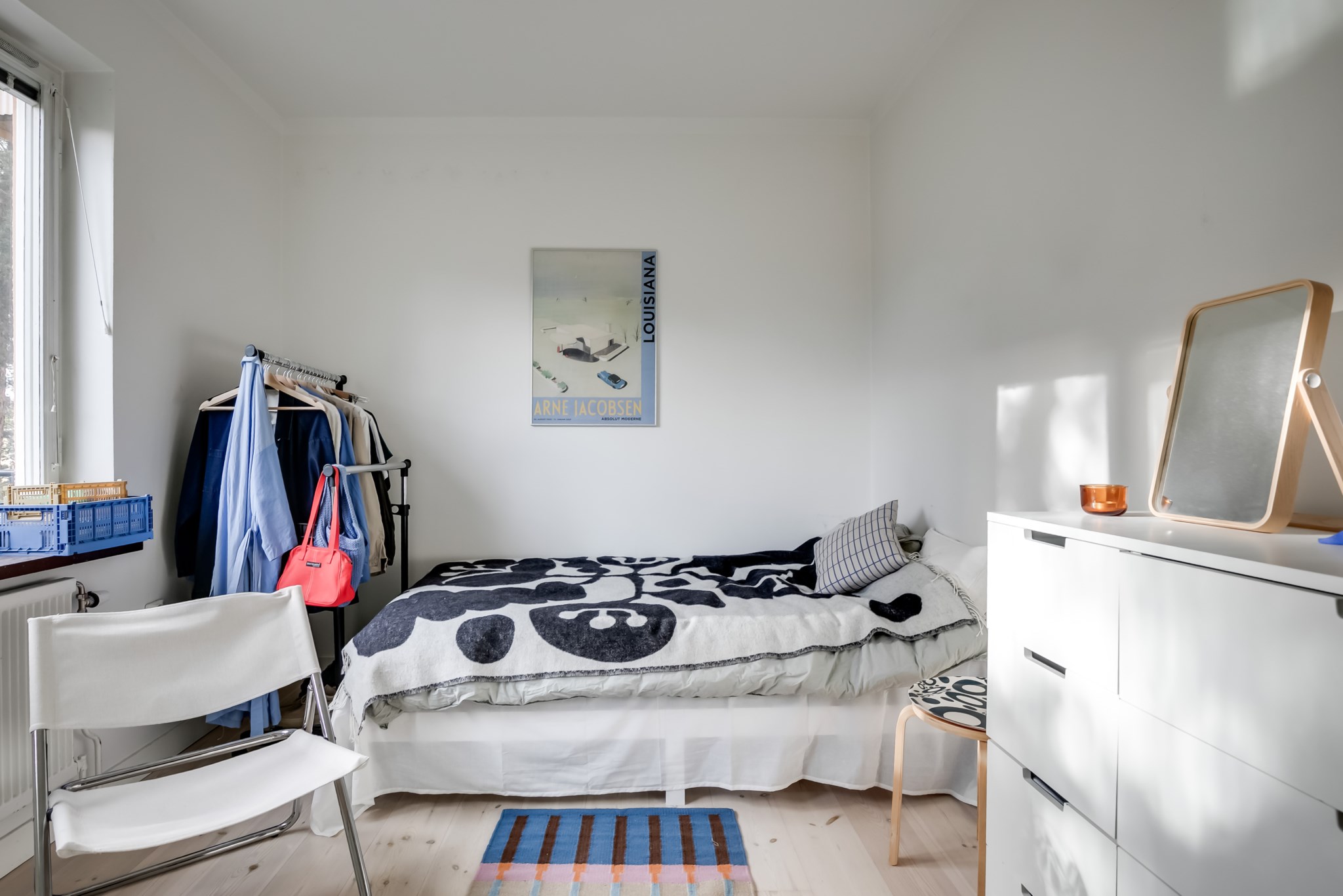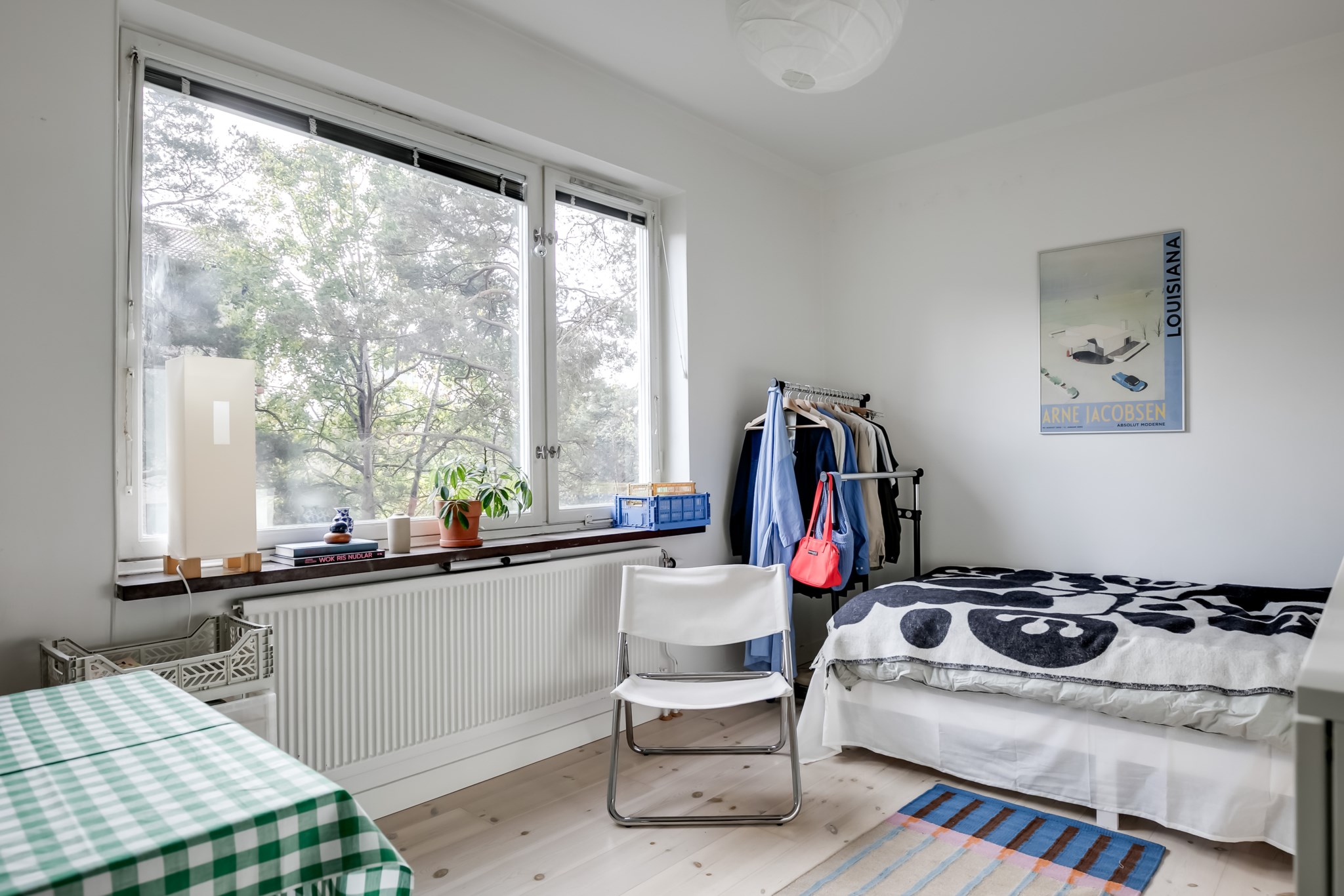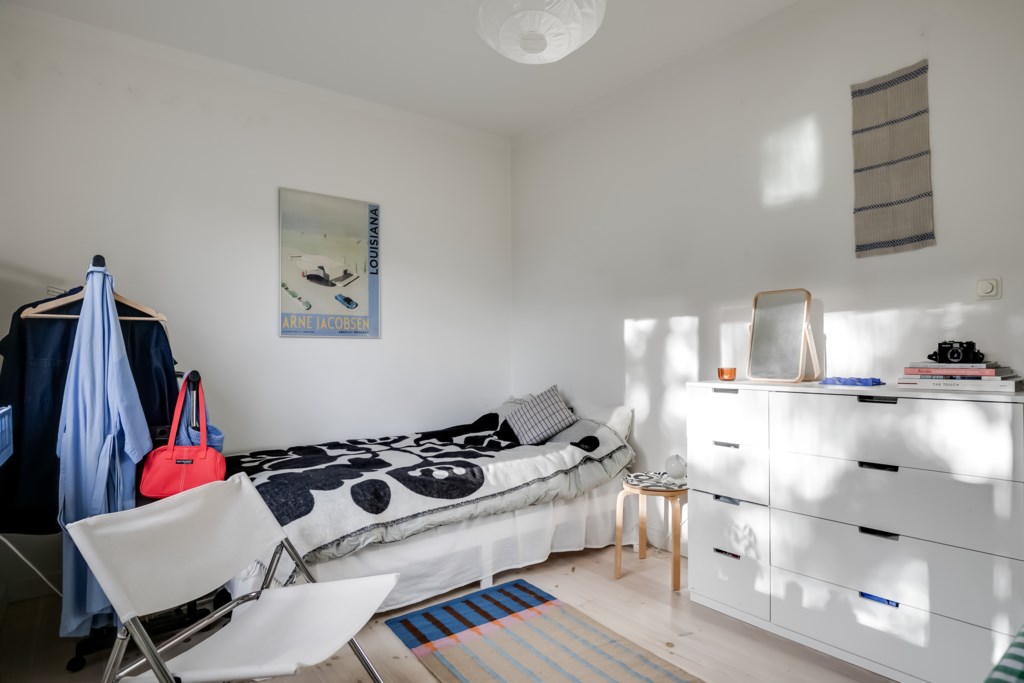 Ljust och lättmöblerat rum med fint ljusinsläpp från det stora fönstret. Här finns plats för både matplats, sovplats och enklare förvaring. Väggarna är vitmålade och det vackra trägolvet ger en hemtrevlig känsla.