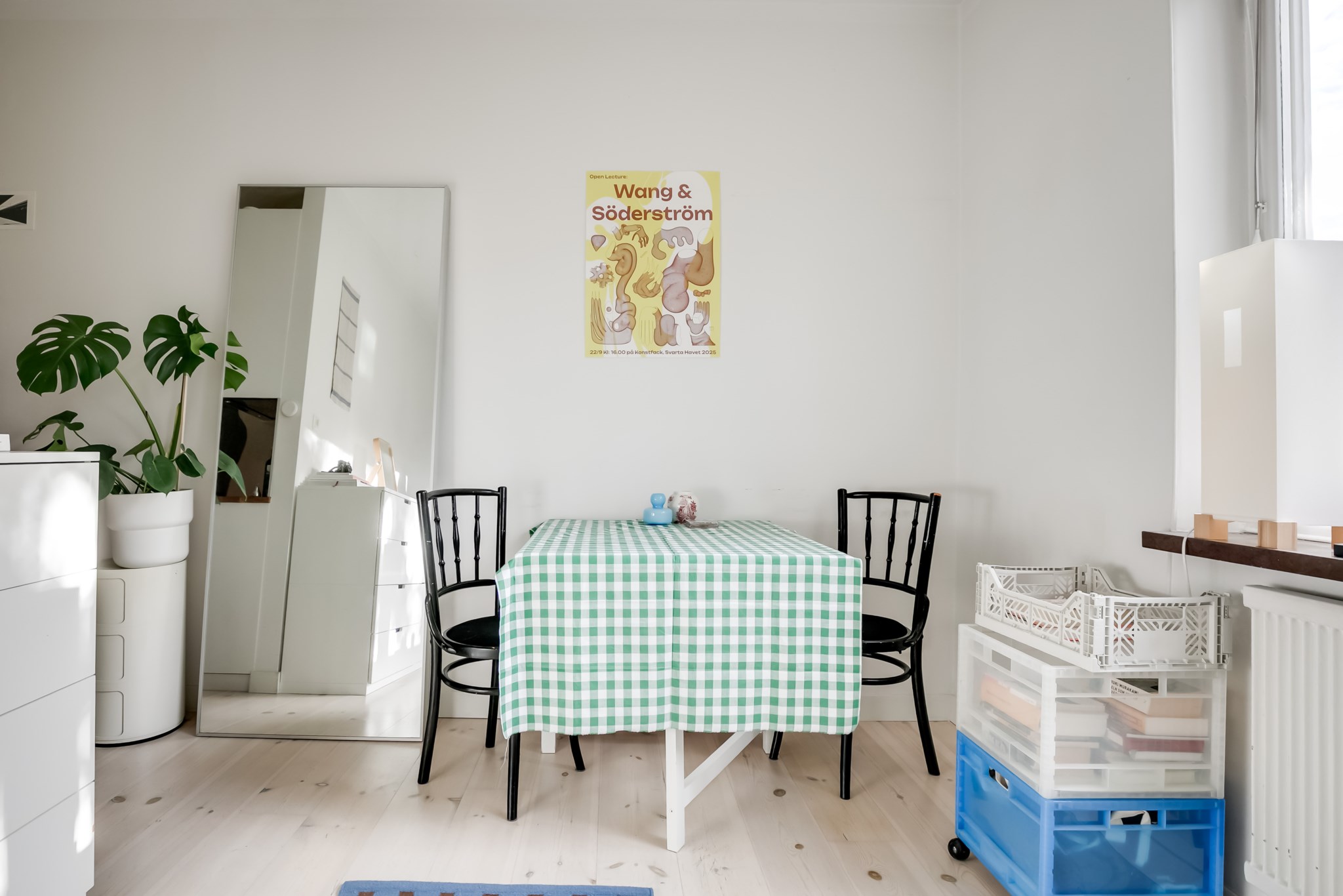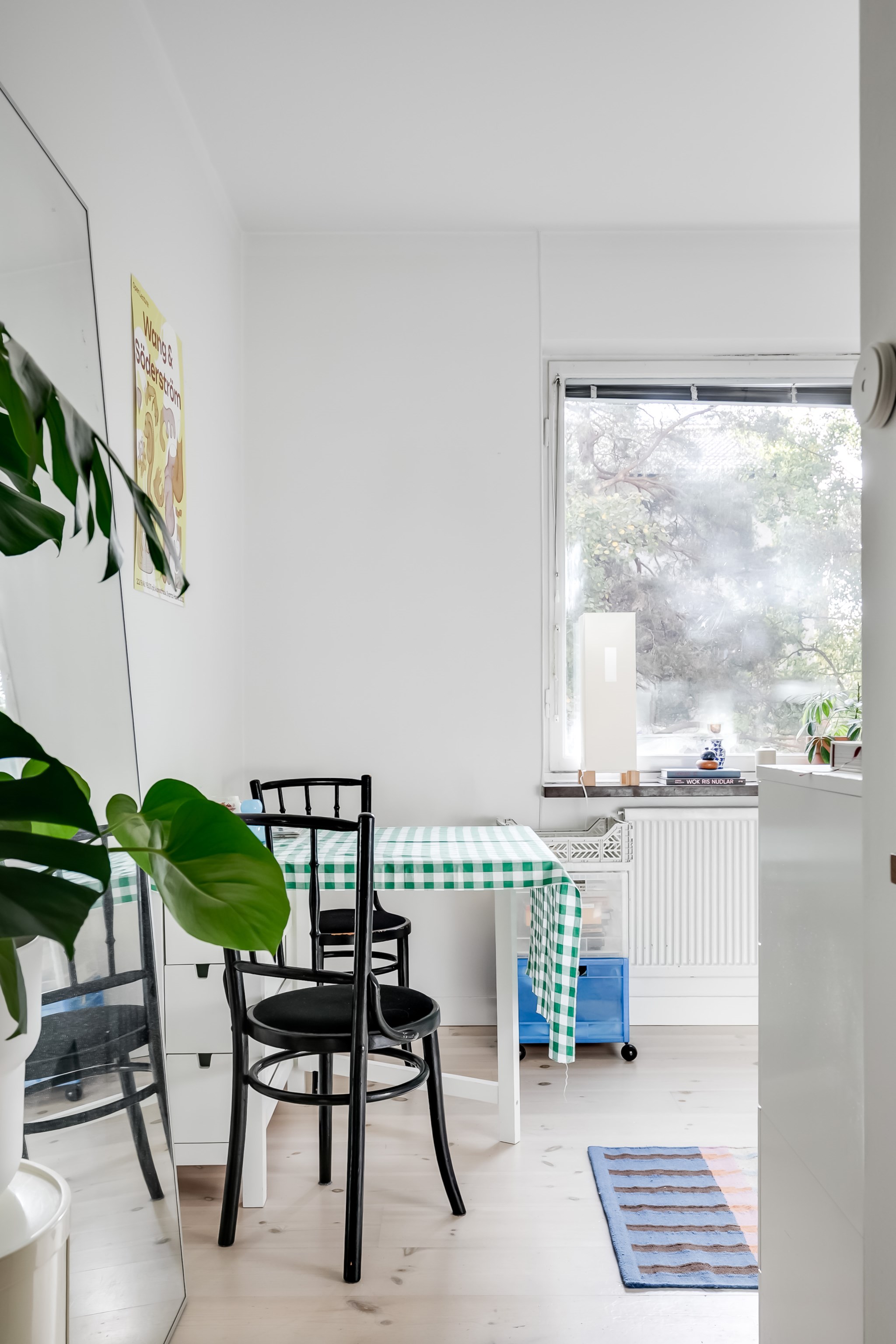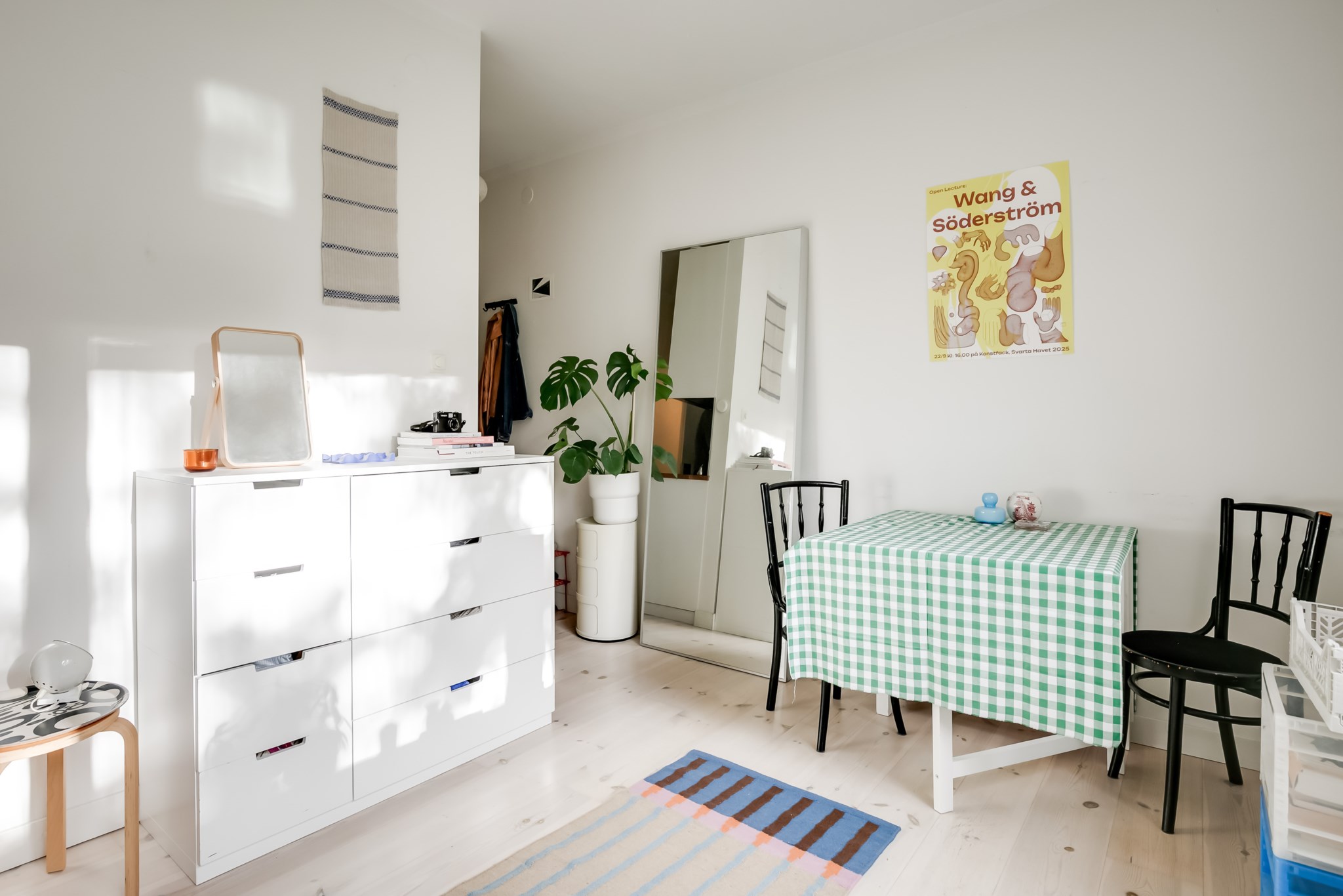 Ljust och lättmöblerat rum med fint ljusinsläpp från det stora fönstret. Här finns plats för både matplats, sovplats och enklare förvaring. Väggarna är vitmålade och det vackra trägolvet ger en hemtrevlig känsla.