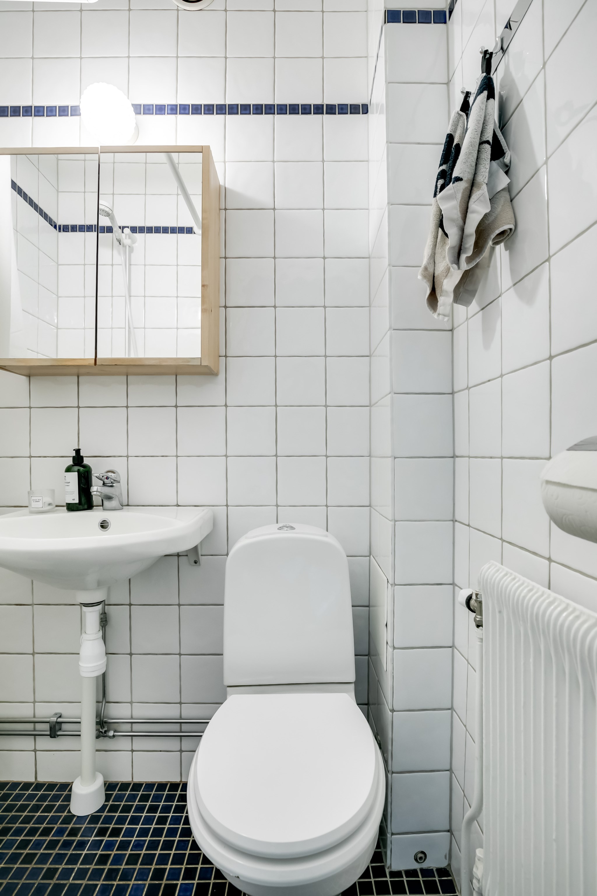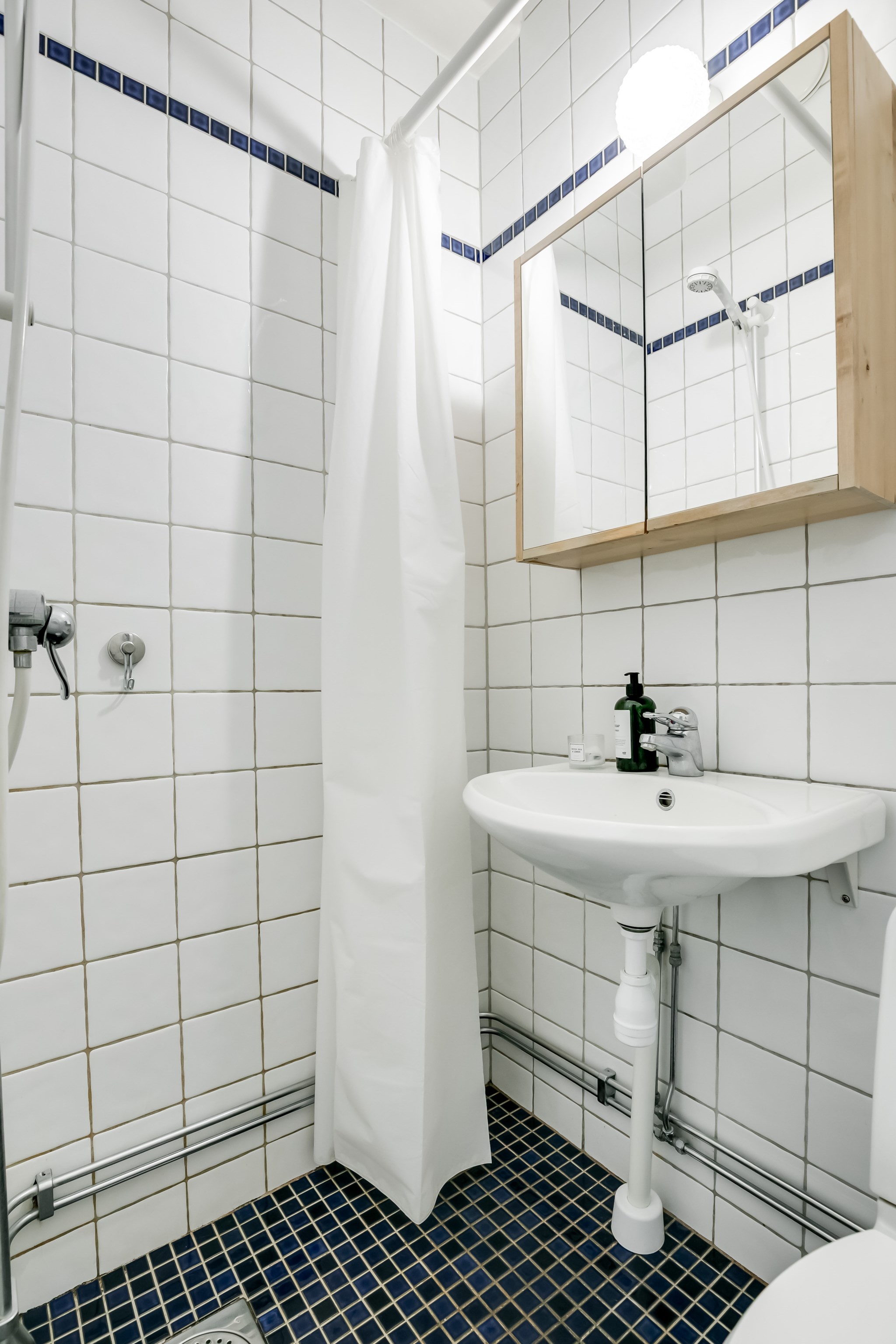 Helkaklat badrum med ljusa väggar och mörkt golv. Här finns dusch, wc och handfat med spegelskåp ovanför. Renoverat i samband med stambytet år 2001-2002 och fortsatt i mycket gott skick.