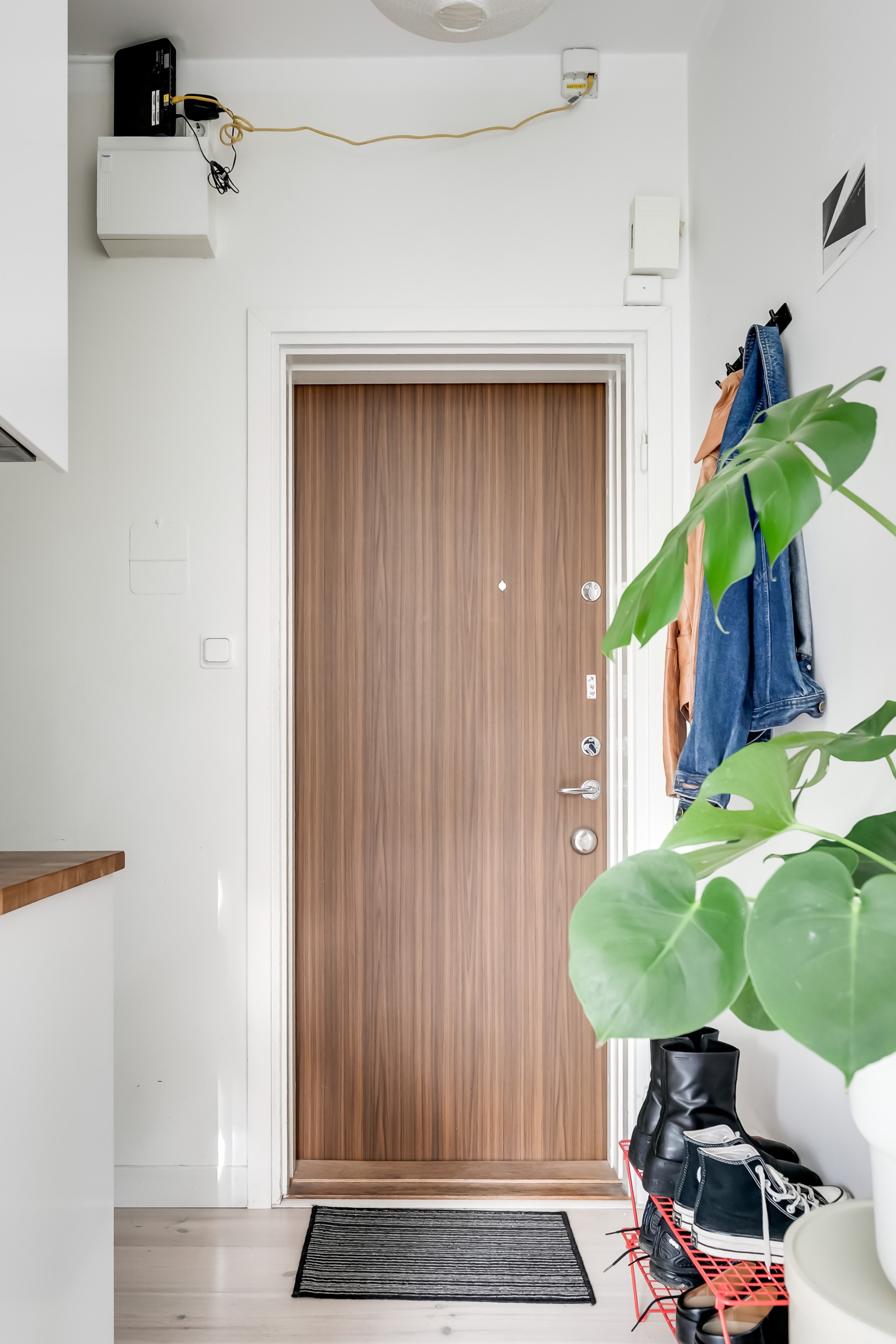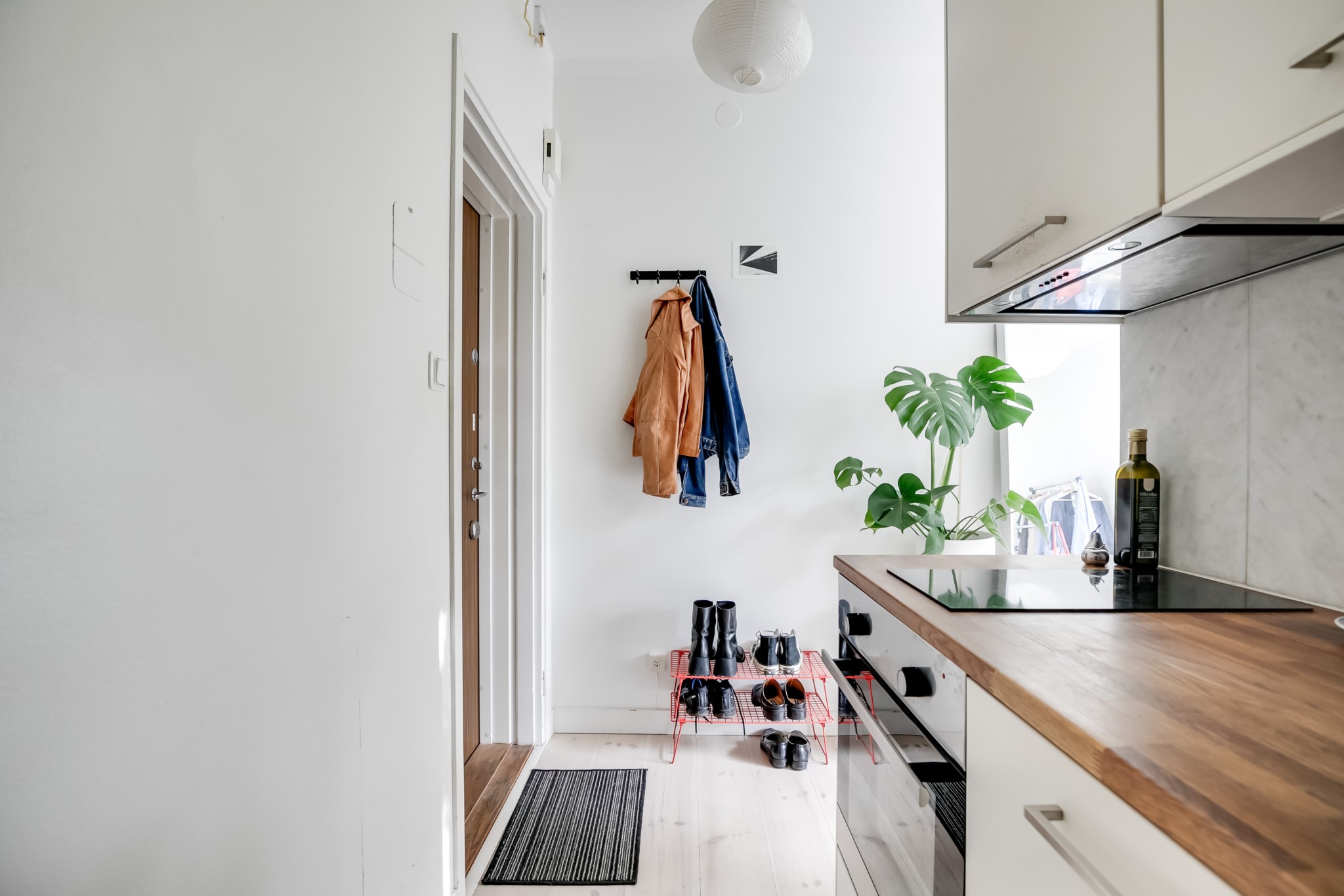 Välkomnande hall med ljusa väggar och ett genomgående ljust trägolv som skapar en enhetlig känsla. Plats finns för avhängning av ytterkläder och skor intill ytterdörren, samt möjlighet till mindre sittbänk eller extra förvaring. Lägenheten är utrustad med säkerhetsdörr.