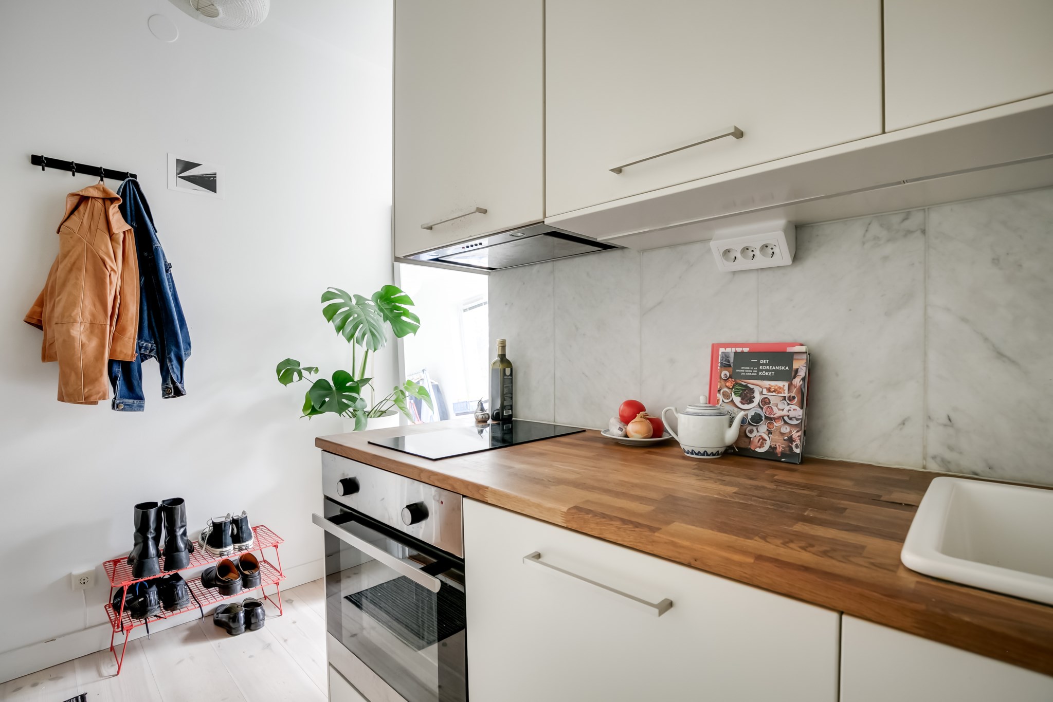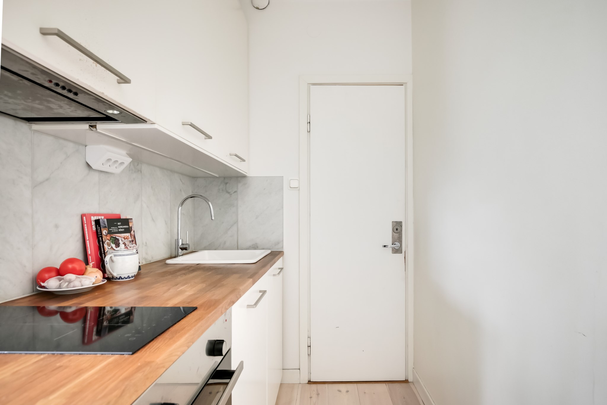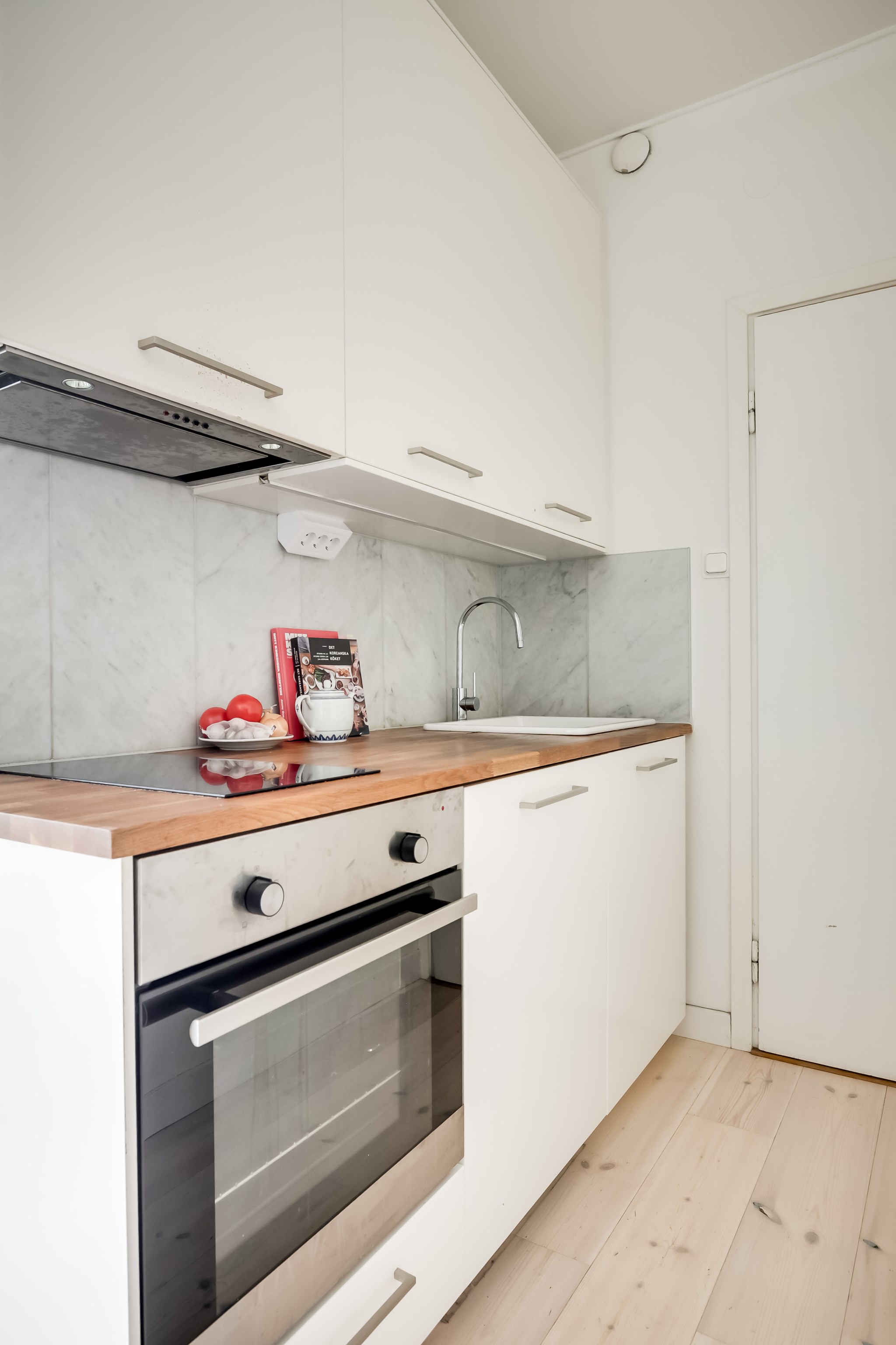 Praktiskt och välplanerat kök med tidlös inredning i ljusa toner. De släta skåpsluckorna kombineras med en bänkskiva i trä och ljusgrått kakel ovan arbetsytorna. Här finns häll, fläkt, ugn samt kyl med frysfack. Köket har gott om förvaring i form av rymliga överskåp.