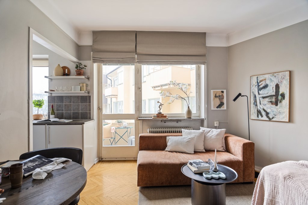 Ljust och lättmöblerat rum med plats för säng, mindre soffa och matbord. Det generösa fönsterpartiet och utgången till balkongen ger ett fint ljusinsläpp och skapar en luftig känsla. Rummet har en naturlig koppling till köket vilket bidrar till en öppen och social planlösning.